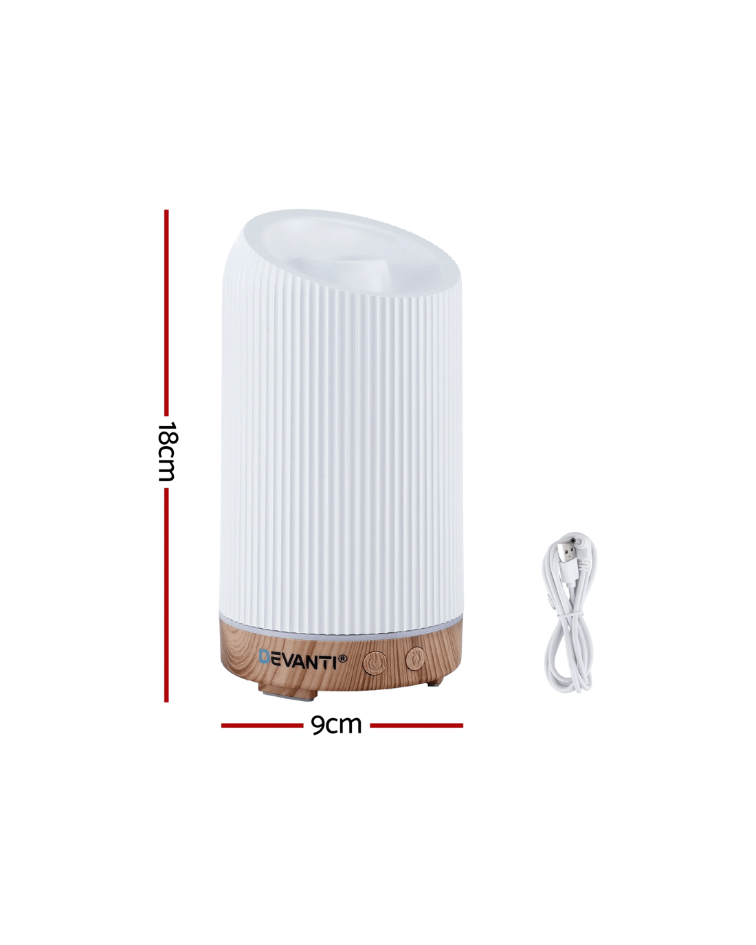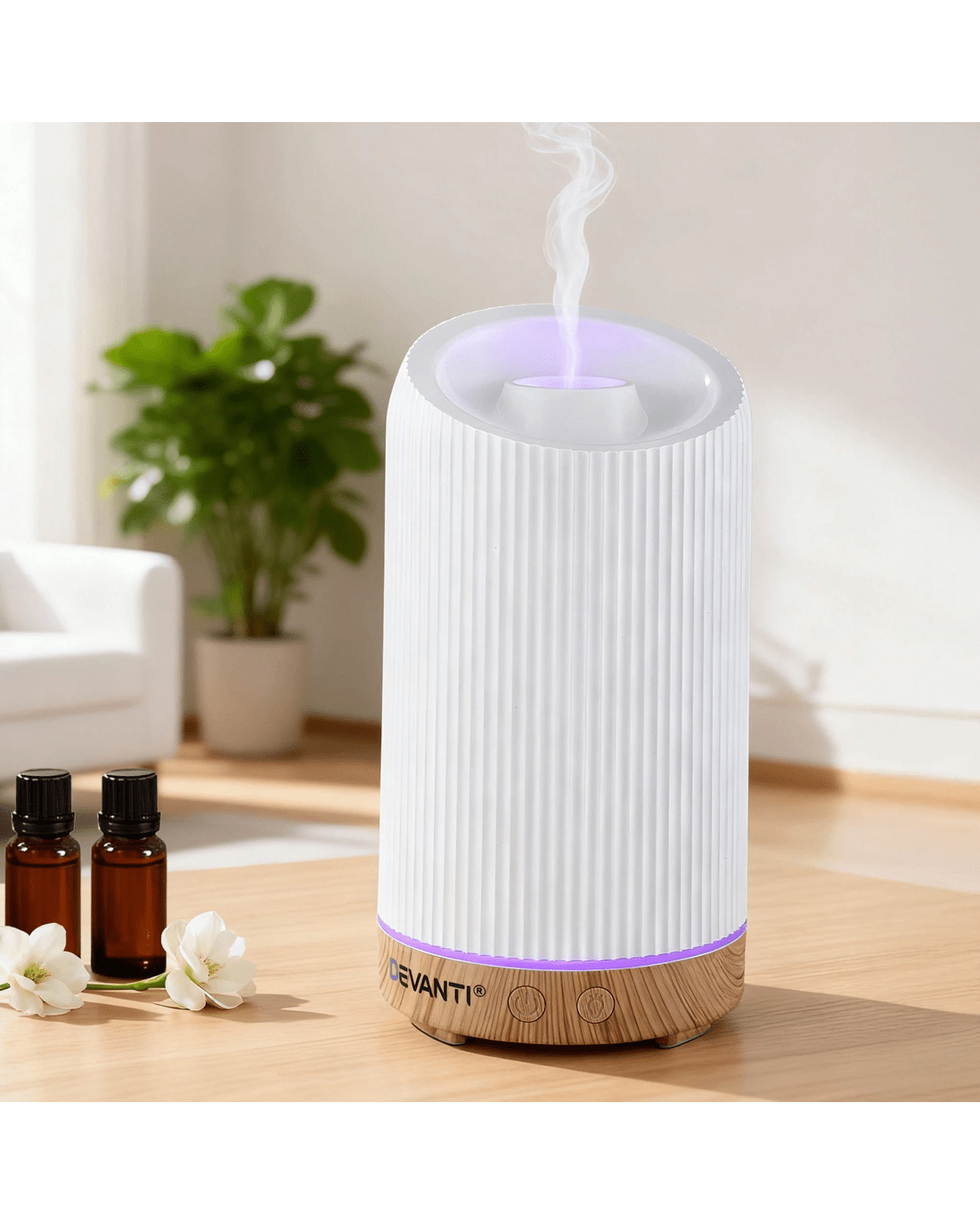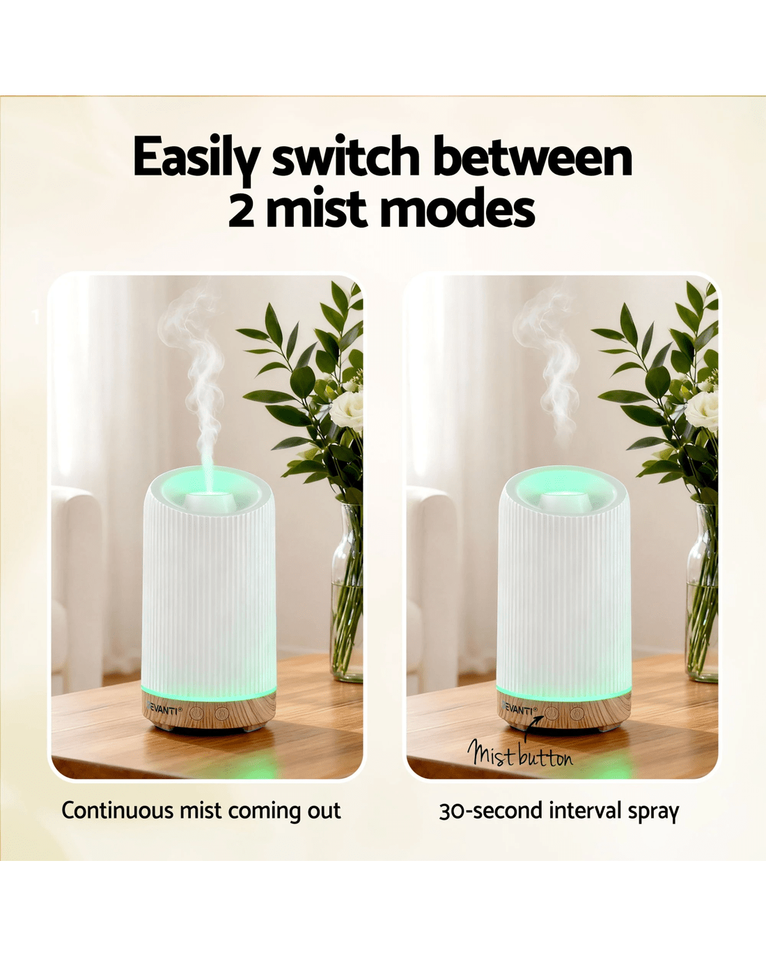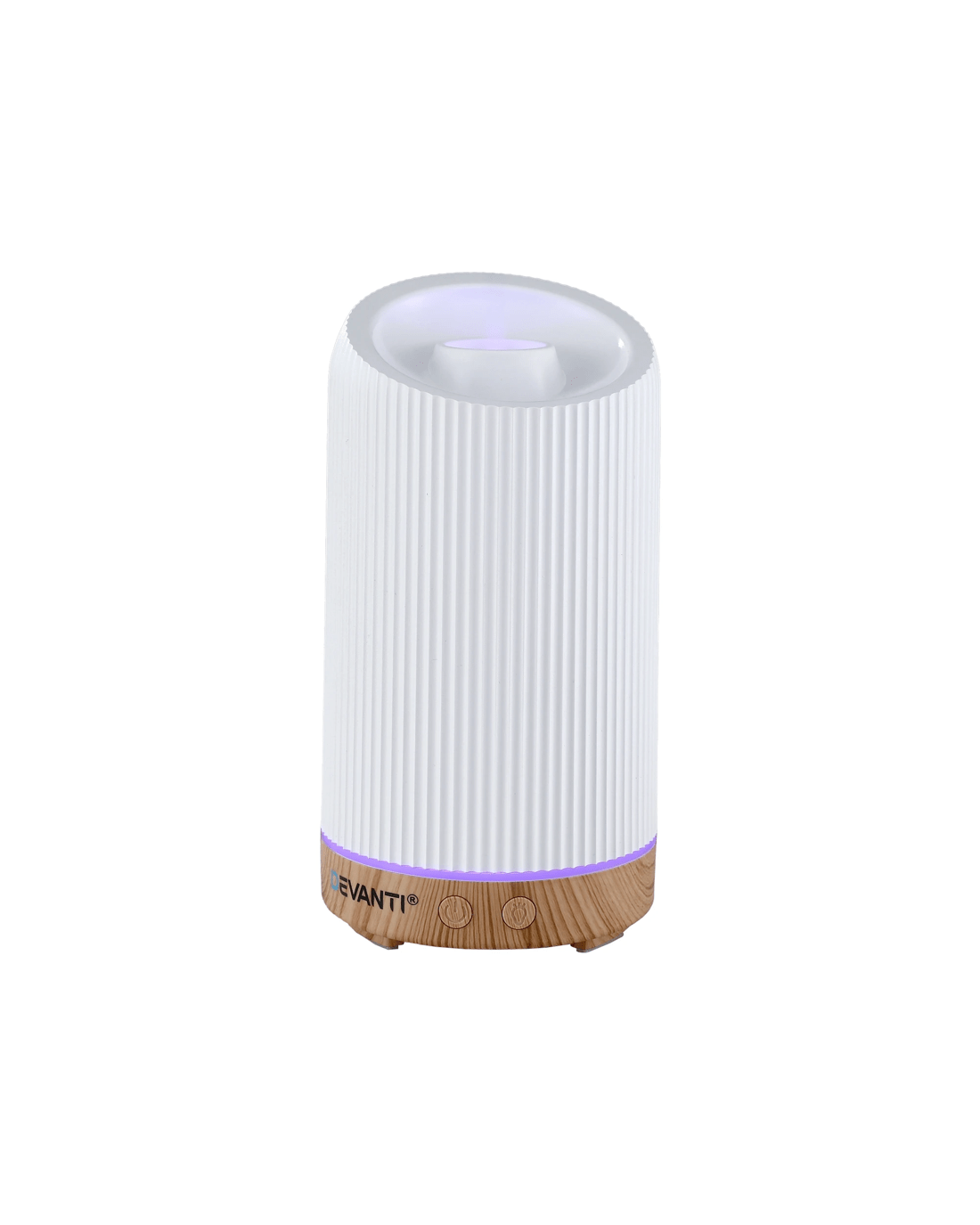 Enhance your space with this modern diffuser featuring a sleek vertical striped design and an elegant angled cut edge. Its advanced ultrasonic system releases a smooth, refreshing mist that boosts air moisture and elevates your favourite essential oils. With a generous 200ml capacity and two mist modes, it delivers steady humidification while maintaining whisper-quiet performance. The soft 7-colour LED night light offers two brightness levels and three intuitive light-button functions, allowing you to create the perfect ambience for relaxation, sleep, or work. Two timer settings provide convenient, hands-free operation, while the automatic waterless shutoff ensures safety and peace of mind. Energy-efficient and beautifully crafted, this diffuser brings comfort, atmosphere and high-quality humidification to any room.