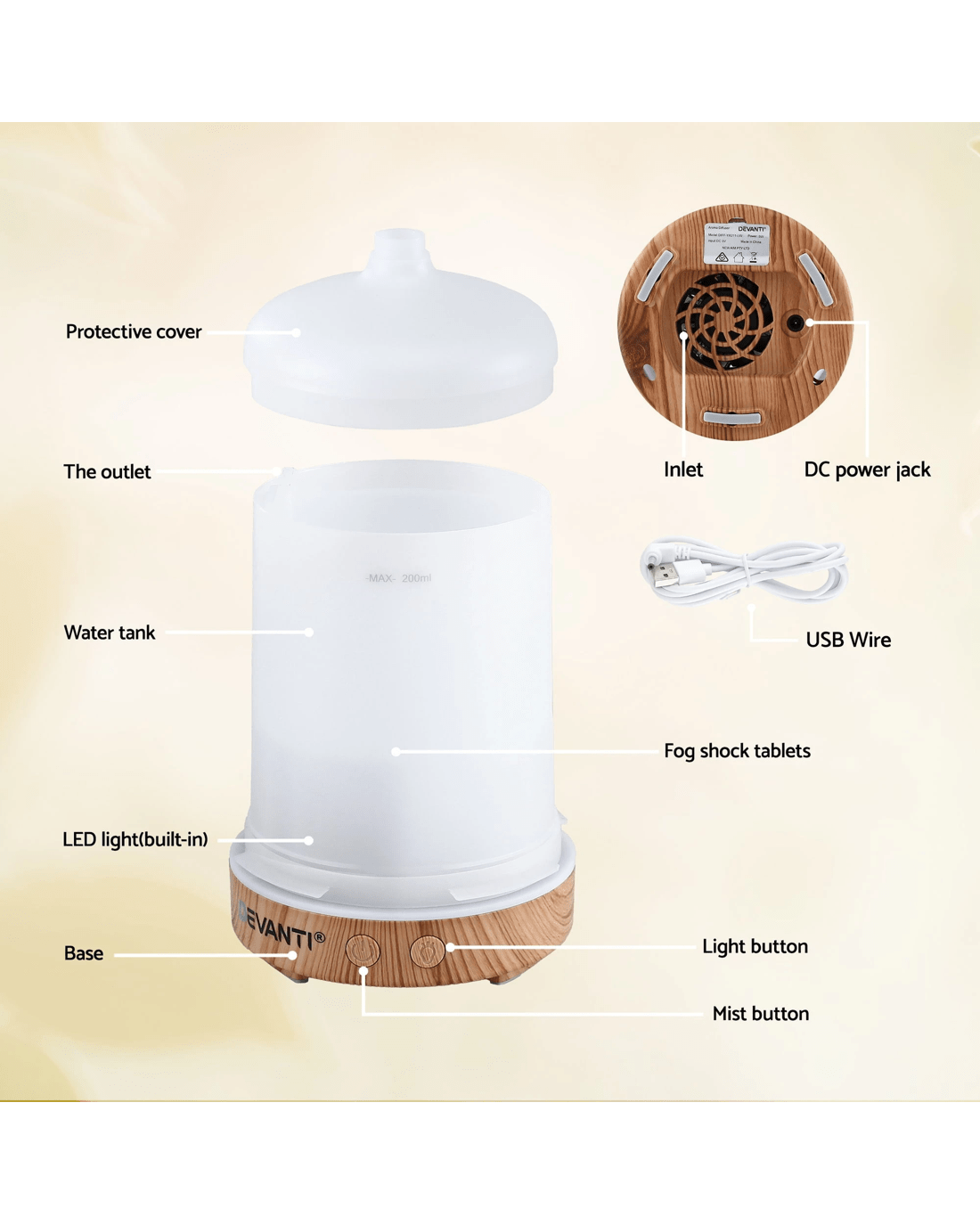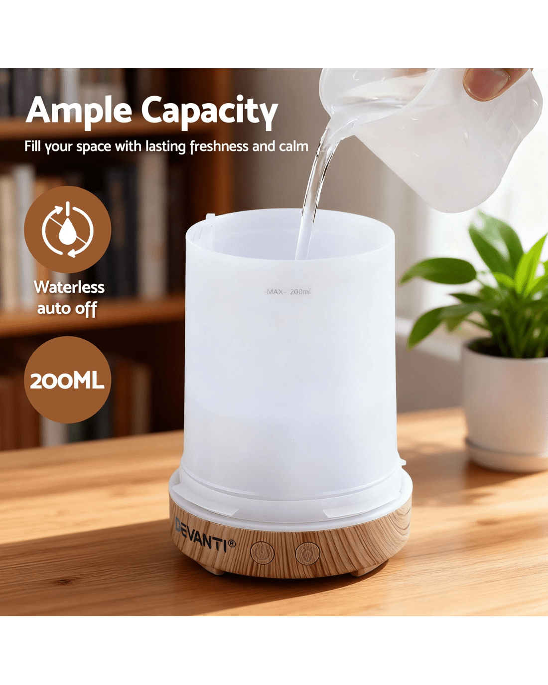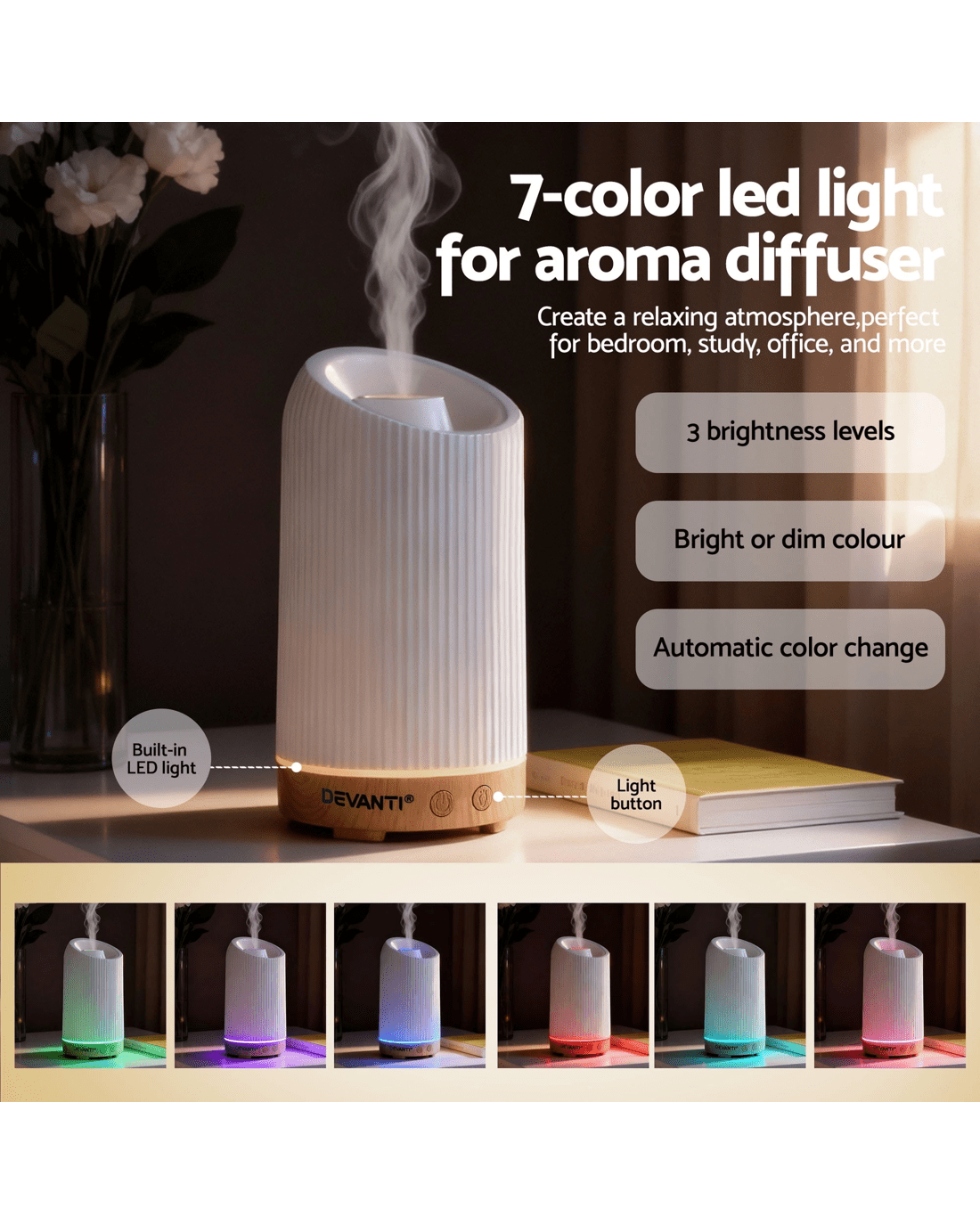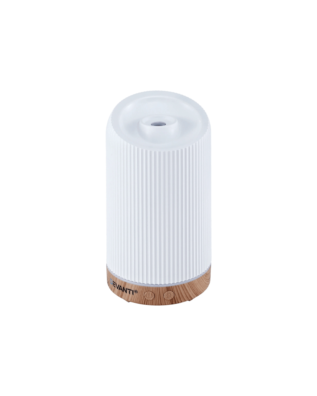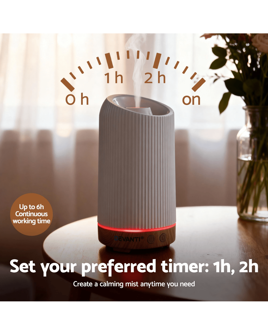 Enhance your space with this modern diffuser featuring a sleek vertical striped design and an elegant angled cut edge. Its advanced ultrasonic system releases a smooth, refreshing mist that boosts air moisture and elevates your favourite essential oils. With a generous 200ml capacity and two mist modes, it delivers steady humidification while maintaining whisper-quiet performance. The soft 7-colour LED night light offers two brightness levels and three intuitive light-button functions, allowing you to create the perfect ambience for relaxation, sleep, or work. Two timer settings provide convenient, hands-free operation, while the automatic waterless shutoff ensures safety and peace of mind. Energy-efficient and beautifully crafted, this diffuser brings comfort, atmosphere and high-quality humidification to any room.
