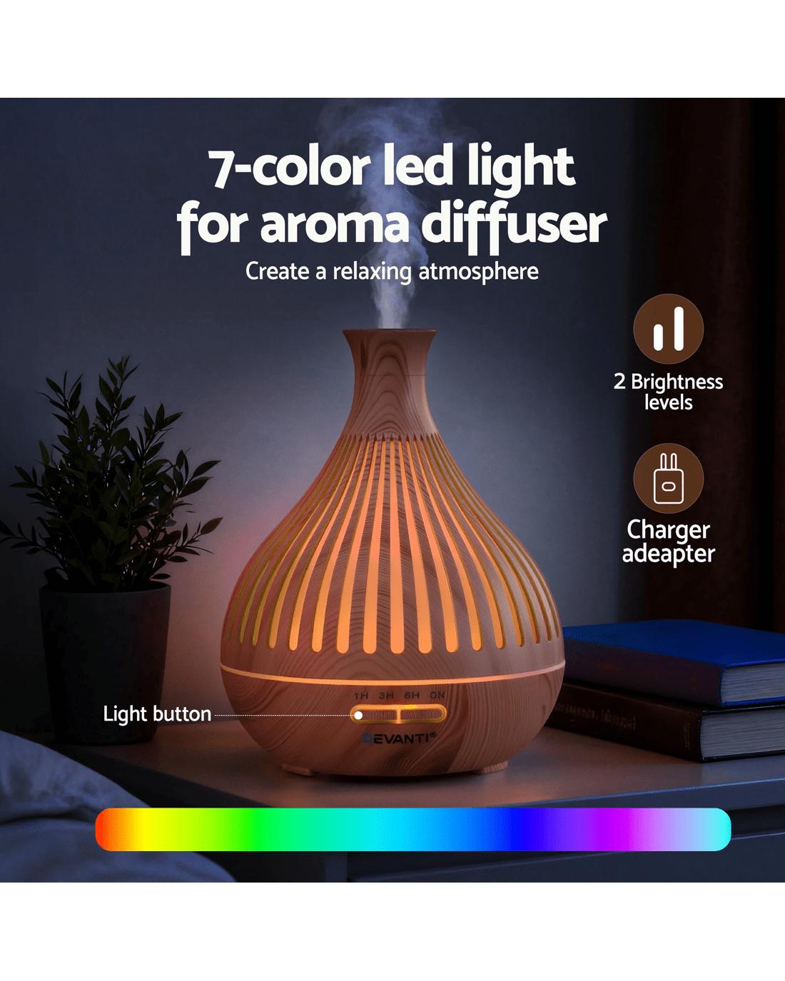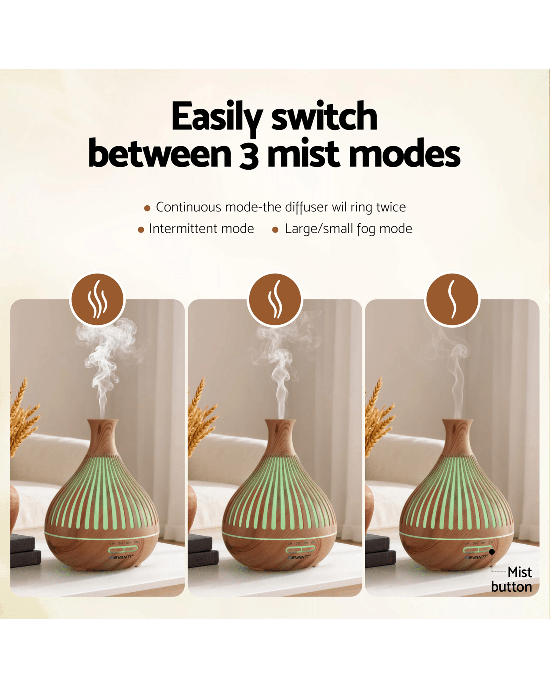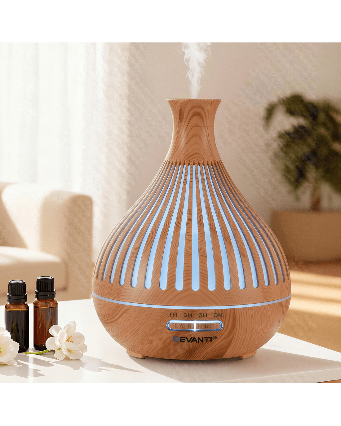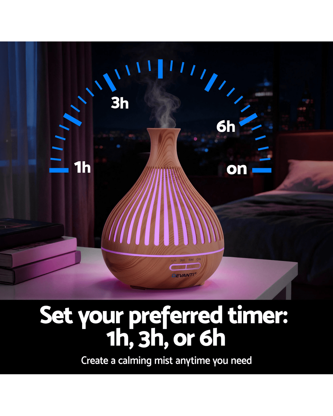 Add a touch of nature to your home with this wood grain aroma diffuser. Featuring a 400ml tank, 3 mist modes, and 3 timer settings, it creates a relaxing atmosphere with your favorite essential oils. Cycle through 7 LED colours with 2 brightness levels to set the perfect mood day or night. Whisper-quiet operation, automatic shut-off when water runs low, and low energy consumption make it safe and convenient for daily use. Perfect for bedrooms, living rooms, offices, or as a thoughtful gift.