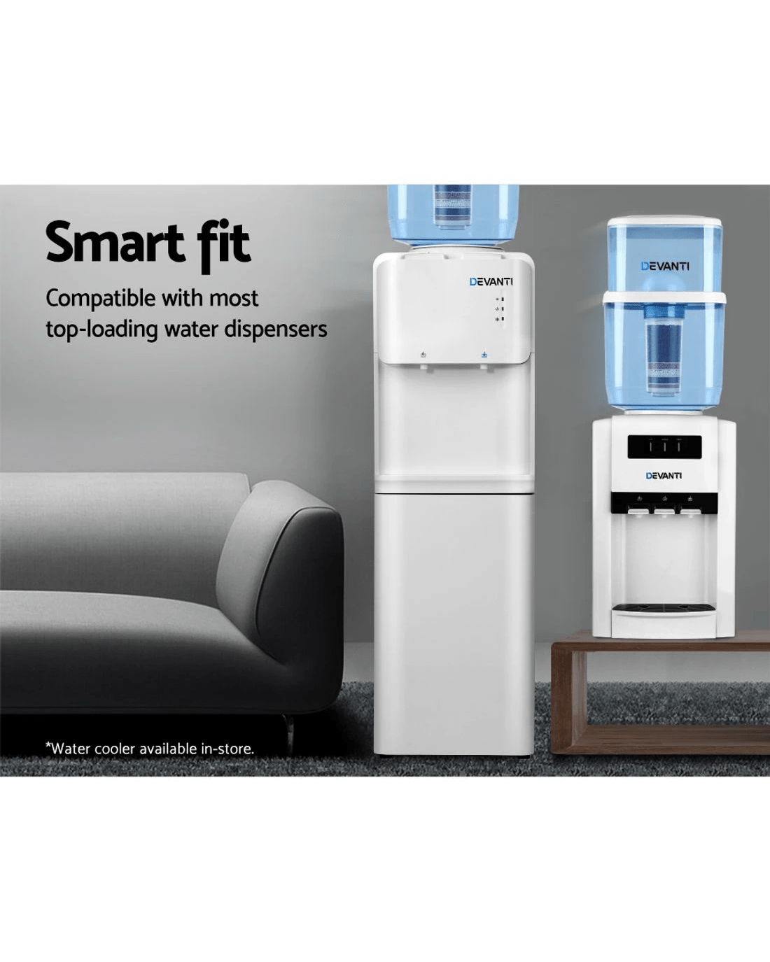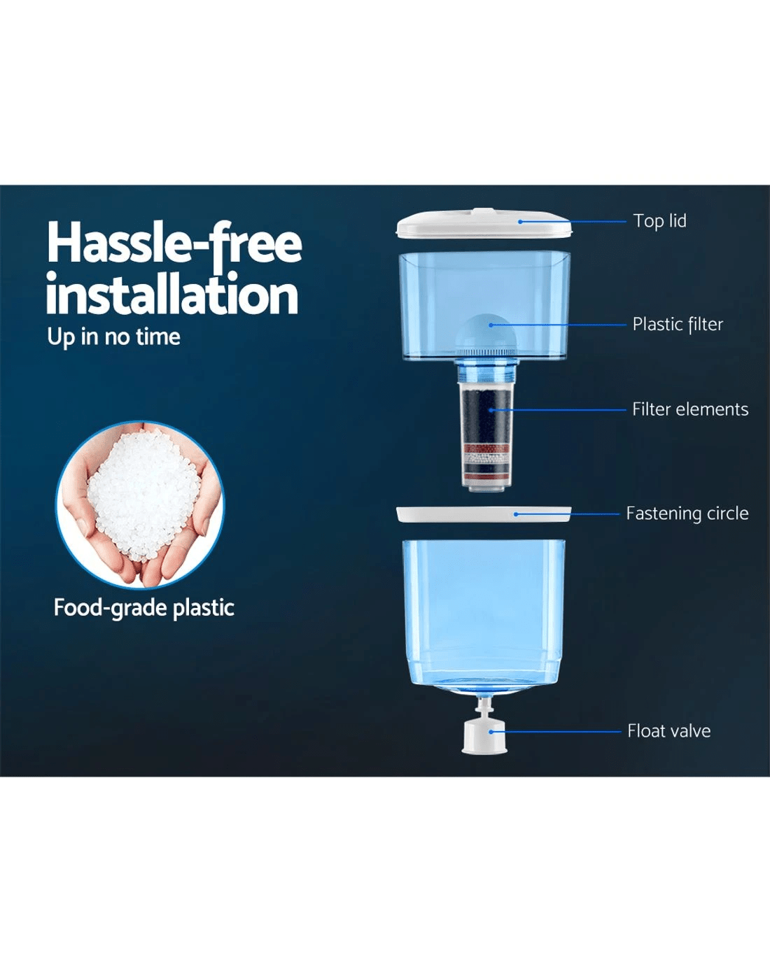 Have access to cleaner and purer water at all times with the Devanti Water Purifier Container. With a refillable capacity of 22 litres, the container is large enough to provide purified water on demand. Thanks to its 7-stage filtration system that ensures your water tastes great and free of harmful chemicals and impurities. The container is made of food-grade plastic and is eco-friendly and non-toxic. It comes with a removable lid for easy access and cleaning. Not least, the container is compatible with most water dispensers for a hassle-free fit and use.