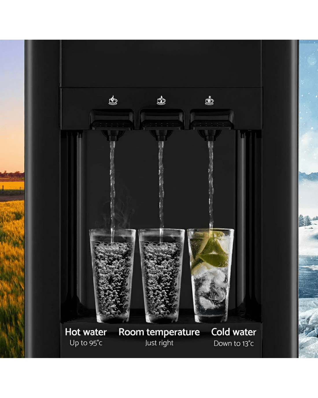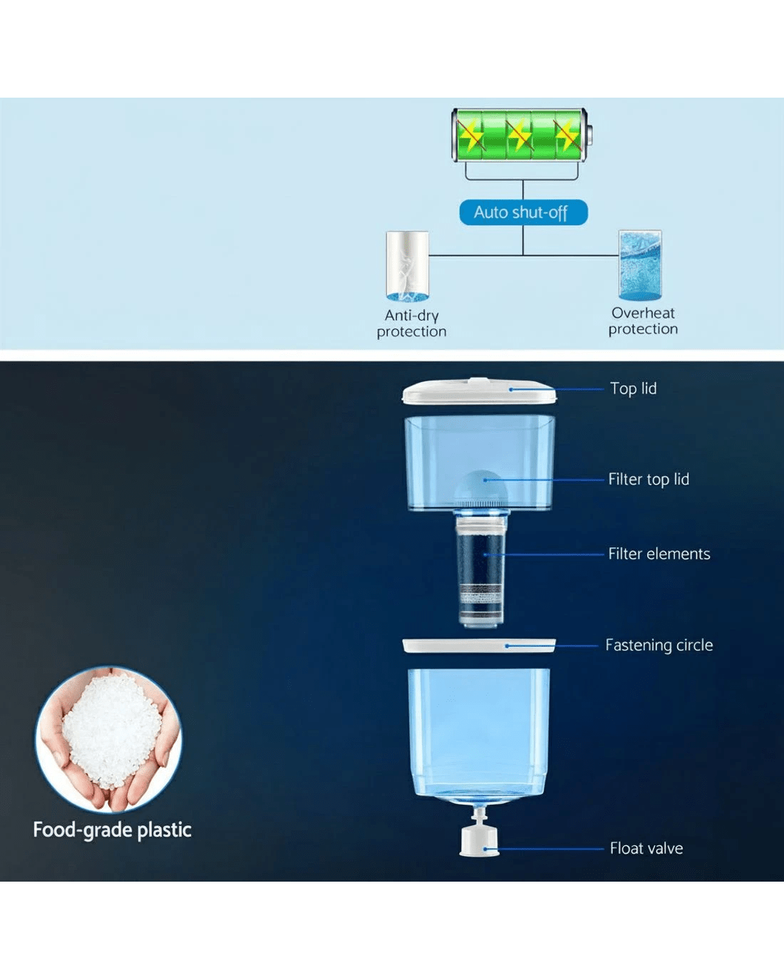 Filtered, clean and pure water on demand. With the Devanti Countertop Water Cooler, it could not be any easier. The large 22-litre water purifier container ensures that ample drinking water is always on call without hassle. Better still, the food-grade plastic container is refillable to ensure you can always have water anytime without having to wait for delivery of bottled water. Thanks to its 7-stage filtration system with two replacement filters that ensures your water tastes great and free of harmful chemicals and impurities. The cooler comes with three taps to deliver water at hot, cold or room temperature options. Plus, the cooler also comes with a smart detachable water guide plate that allows you to use bottled water if needed. The cooler is designed for safe use with protection against overheating, over-current, drying out and electric shocks. Not least, the cooler can be placed on any counter top for convenient use and the anti-slip feet ensure that the ensemble stays firmly in place.