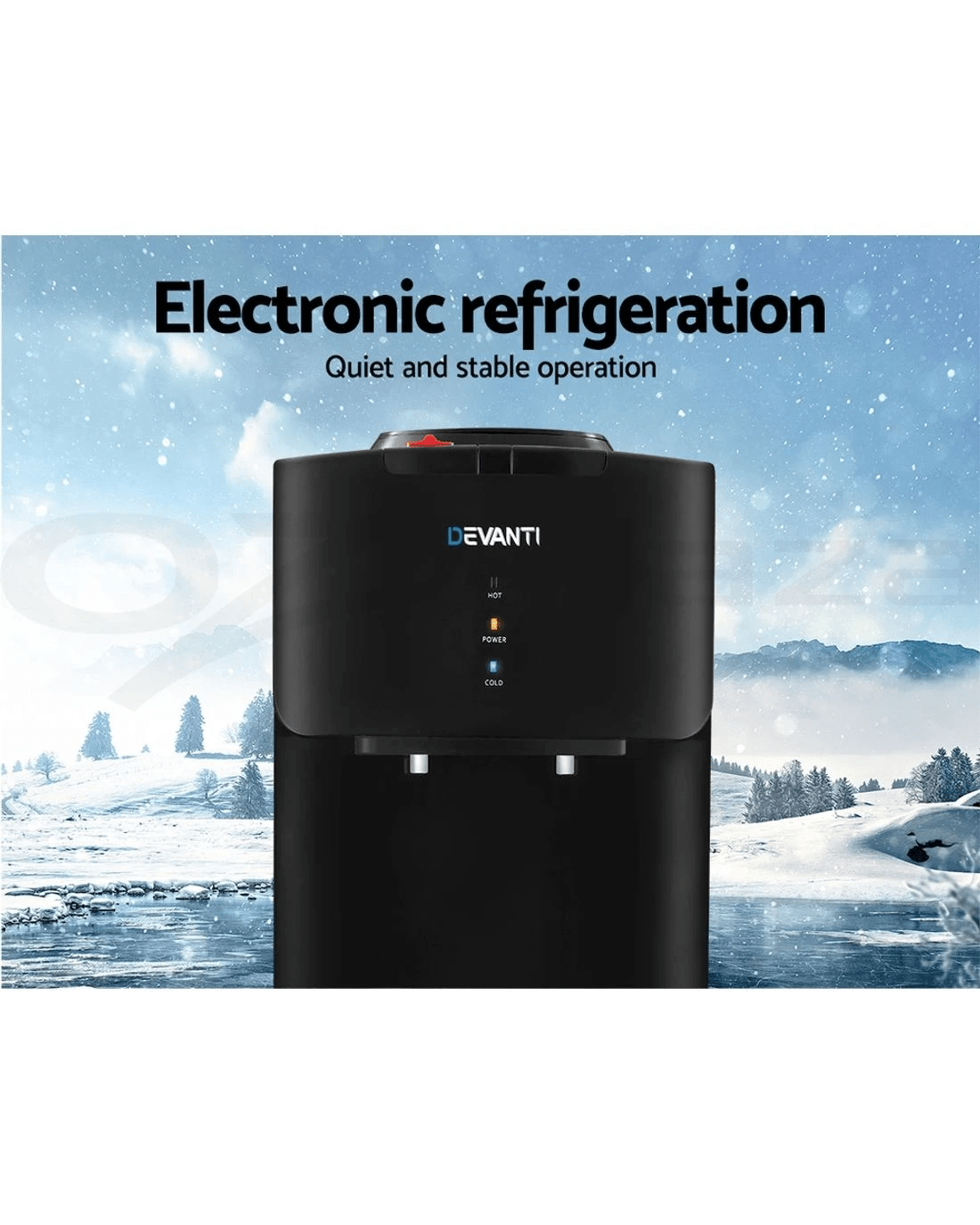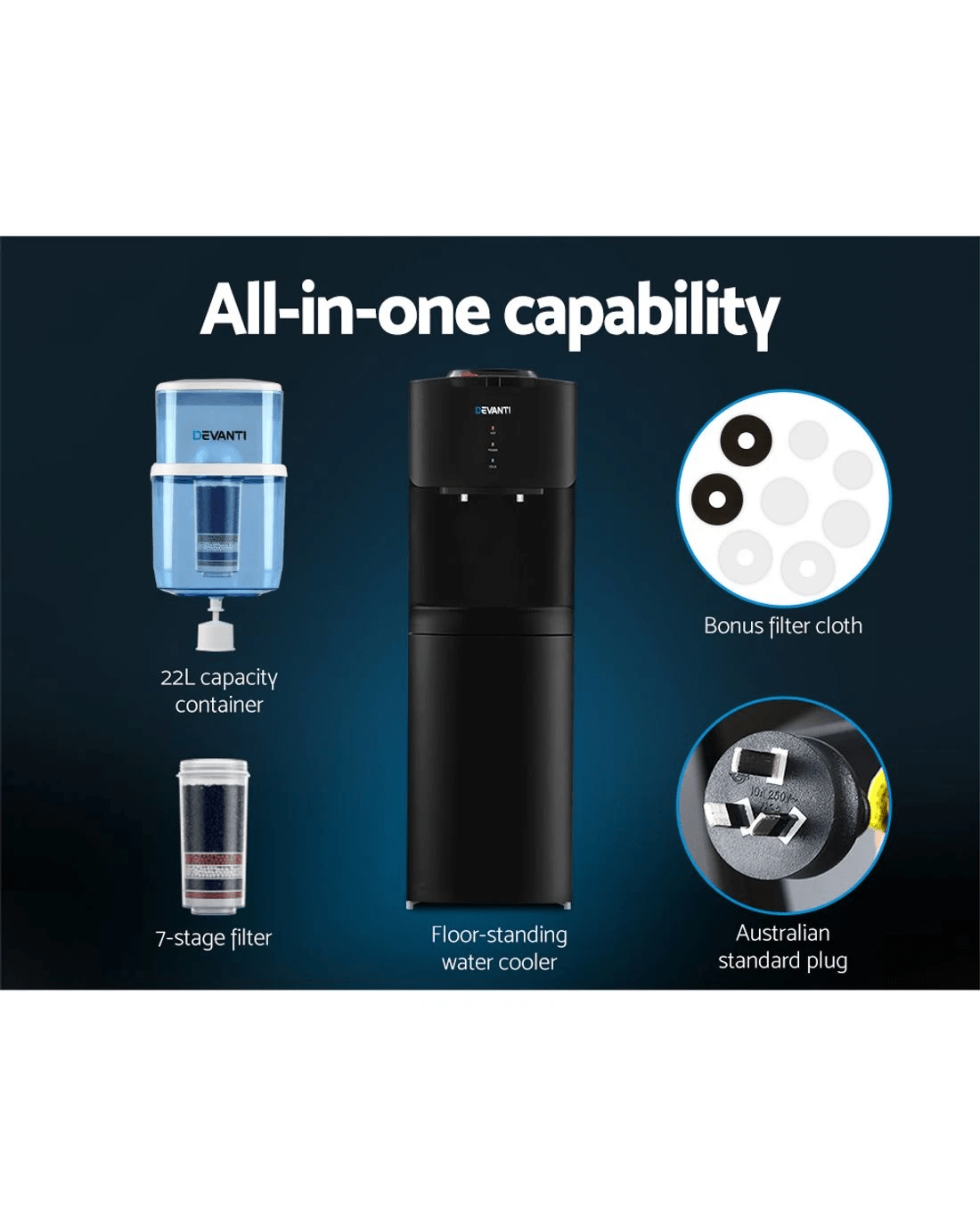 Have access to cleaner and purer water at all times with our Devanti Water Cooler Set. With a refillable container capacity of 22 litres, the cooler is large enough to provide purified water on demand hassle-free, thanks to its 7-stage filtration system that ensures your water tastes great and is free of harmful chemicals and impurities. The water cooler is designed to work with most bottled water or water filter containers and features an electronic refrigeration system that works quietly and reliably. It comes with a detachable water guide plate for use with bottled water. The cooler has LED indicators for easy operation and dual taps for hot and cold water options. The tray height can also be adjusted to suit your use and a removable drip tray allows for easy cleaning. For added safety, the cooler has overheating, over-current, anti-dry and electric-shock protection and a child-lock to prevent children from tampering with the unit. Not least, the cooler has a large storage cabinet to store any accessories or drinking essentials.