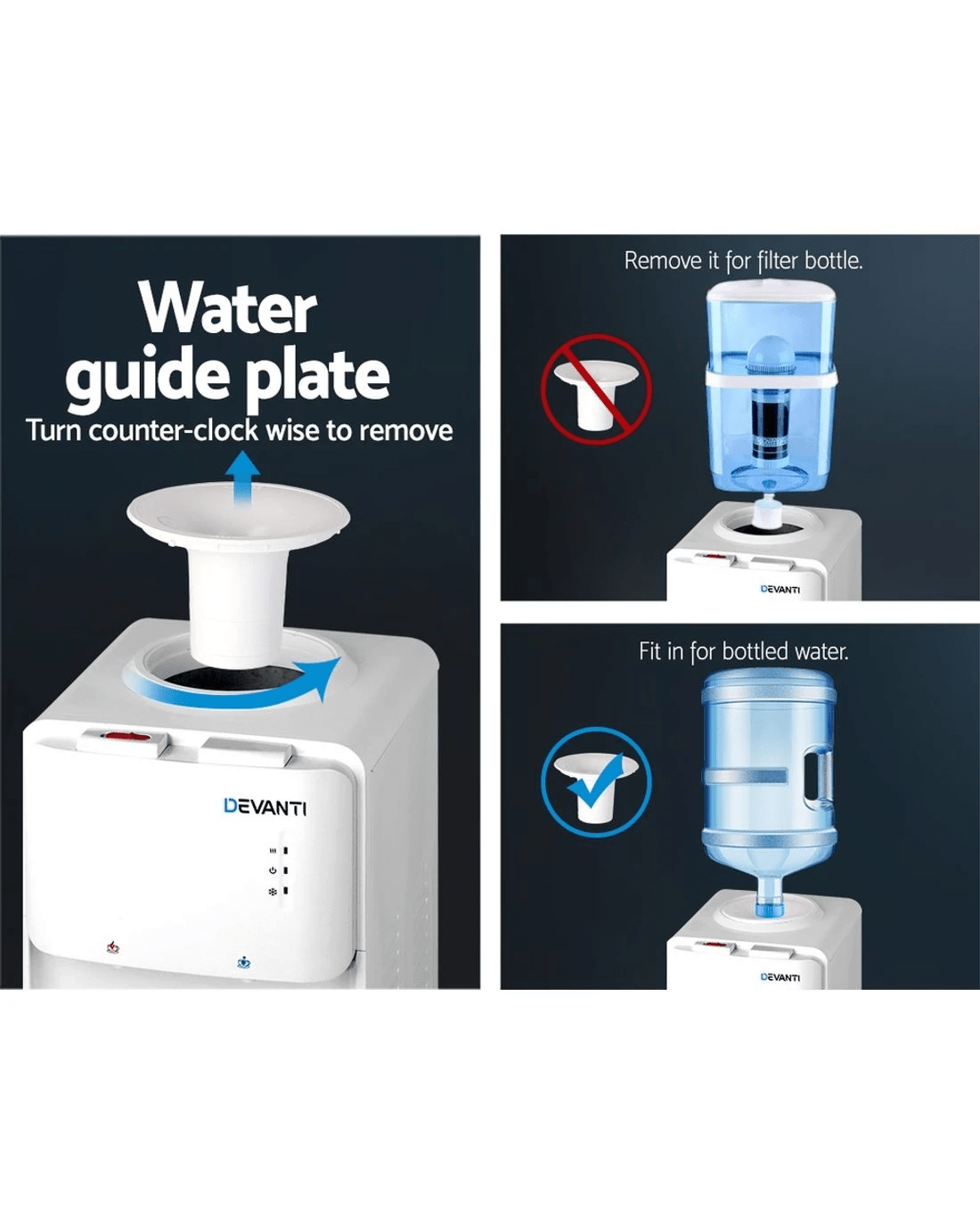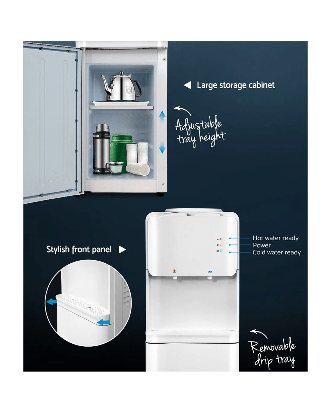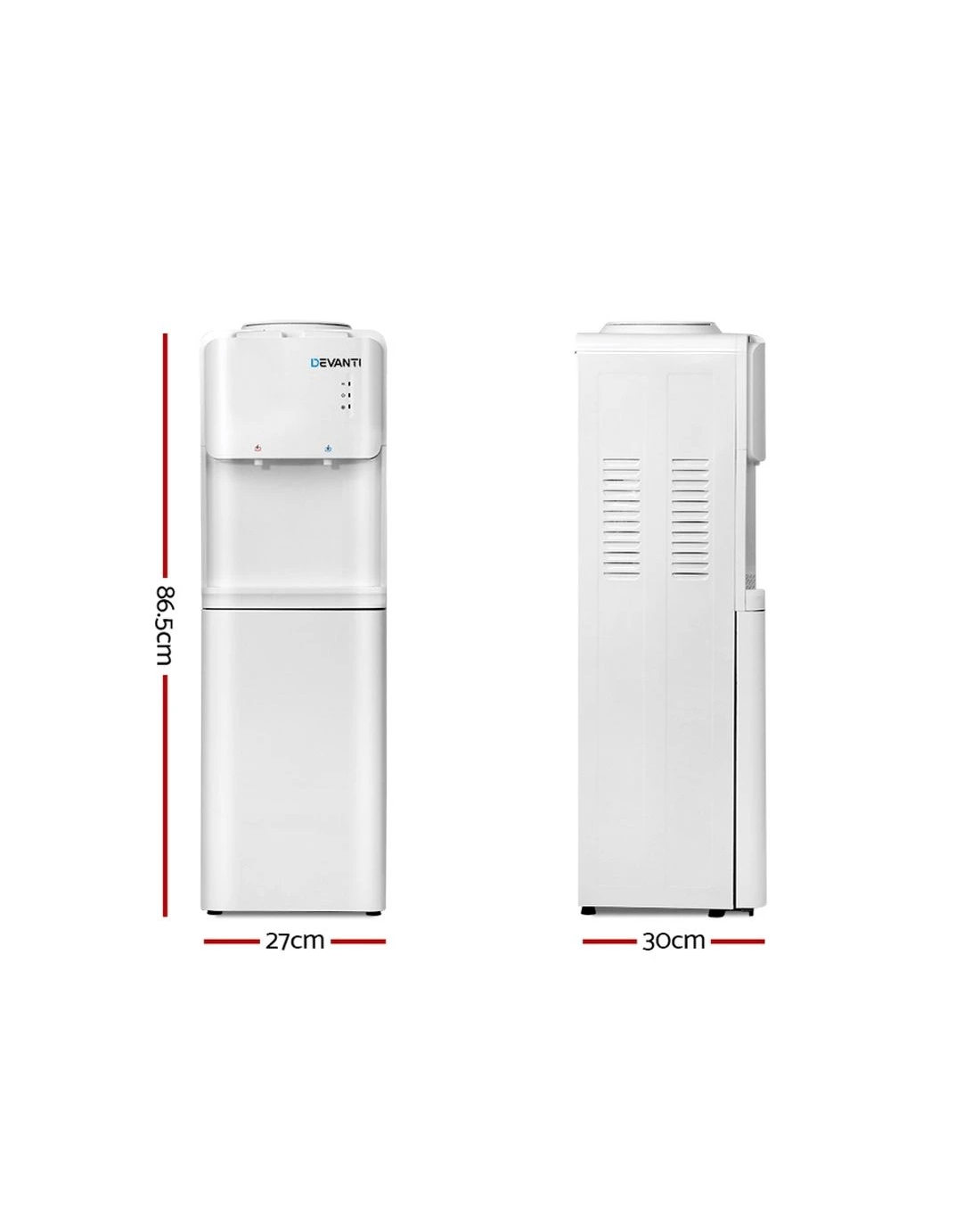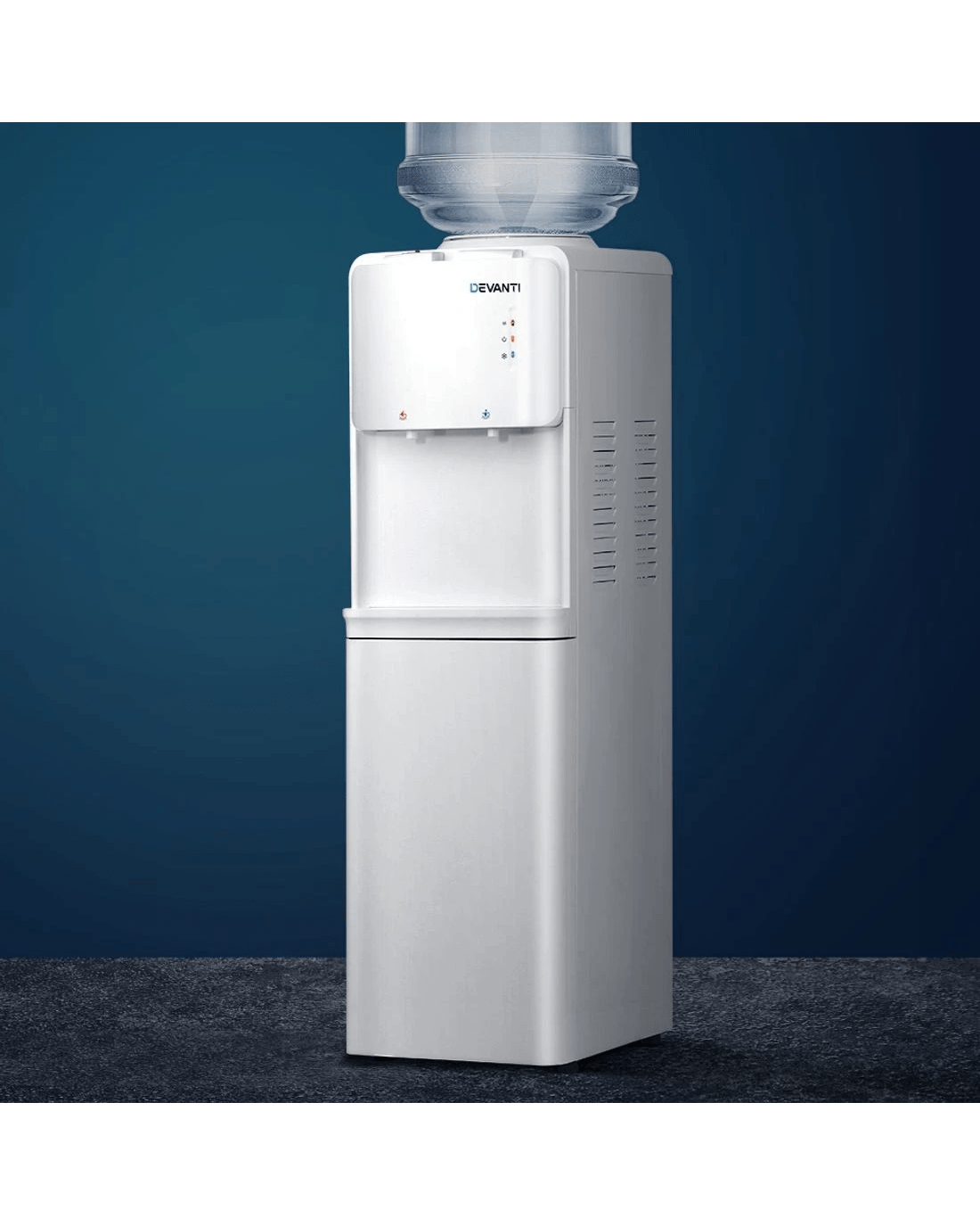 Have access to cleaner and purer water at all times with the Devanti Water Cooler. Designed to work with most bottled water or water filter containers, the cooler features an electronic refrigeration system that works quietly and reliably. It comes with a detachable water guide plate that can cater to either water containers. The cooler has LED indicators for easy operation and dual taps for hot and cold water options. The tray height can also be adjusted to suit your use. A removable drip tray also allows for easy cleaning. For added safety, the dispenser has overheating, over-current, anti-dry and electric-shock protection and a child-lock to prevent children from tampering with the unit. Not least, the dispenser has a large storage cabinet to store any accessories or drinking essentials.