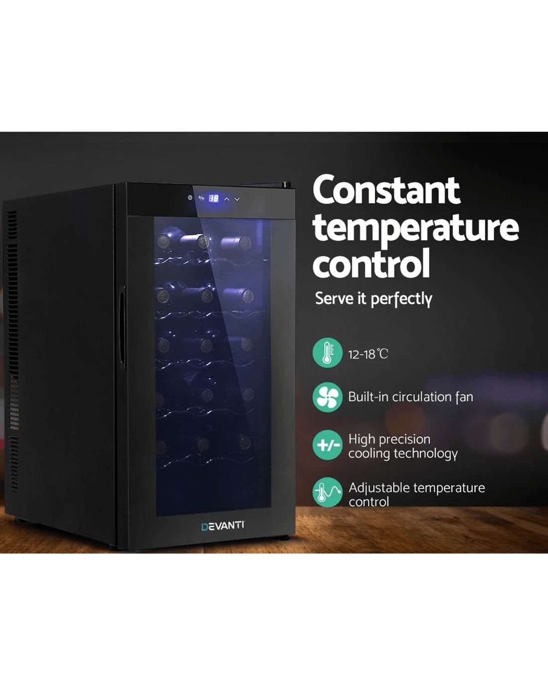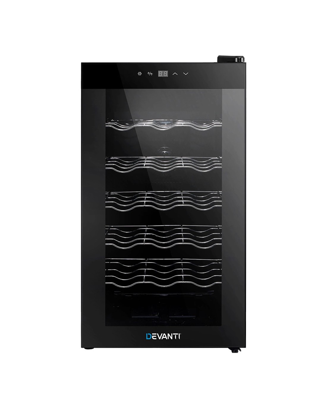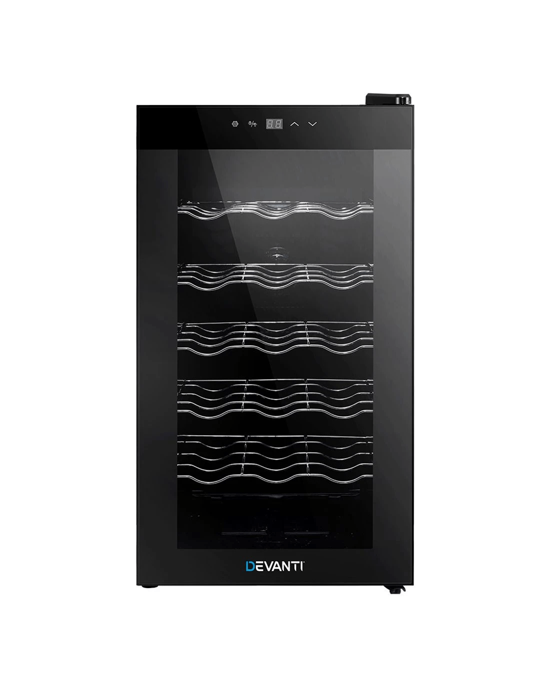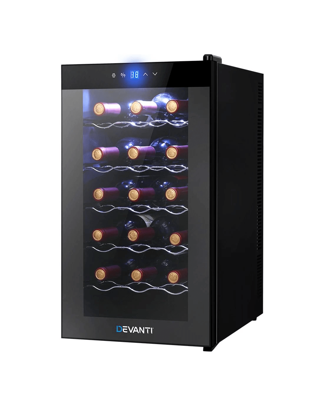 Need a good and reliable wine cooler? Look no further than our Devanti Wine Cooler. Utilising the latest high precision thermoelectric cooling technology, our wine cooler ensures your favourite vintages are kept at their prescribed temperatures with its circulated cool air. The touch control panel makes for easy temperature adjustments and the built-in interior LEDs help you to see your wines in the best light. The stylish and compact design stores up to 18 bottles of wine in a neat and tidy shelving system. Better still, the double-glazed glass door is UV-resistant and provides excellent insulation along with the 30mm thick foam wall. The ensemble works quietly and efficiently and has a handy child-lock on its control panel for total peace of mind. Don't trust just any product with your precious vintages, trust Devanti.