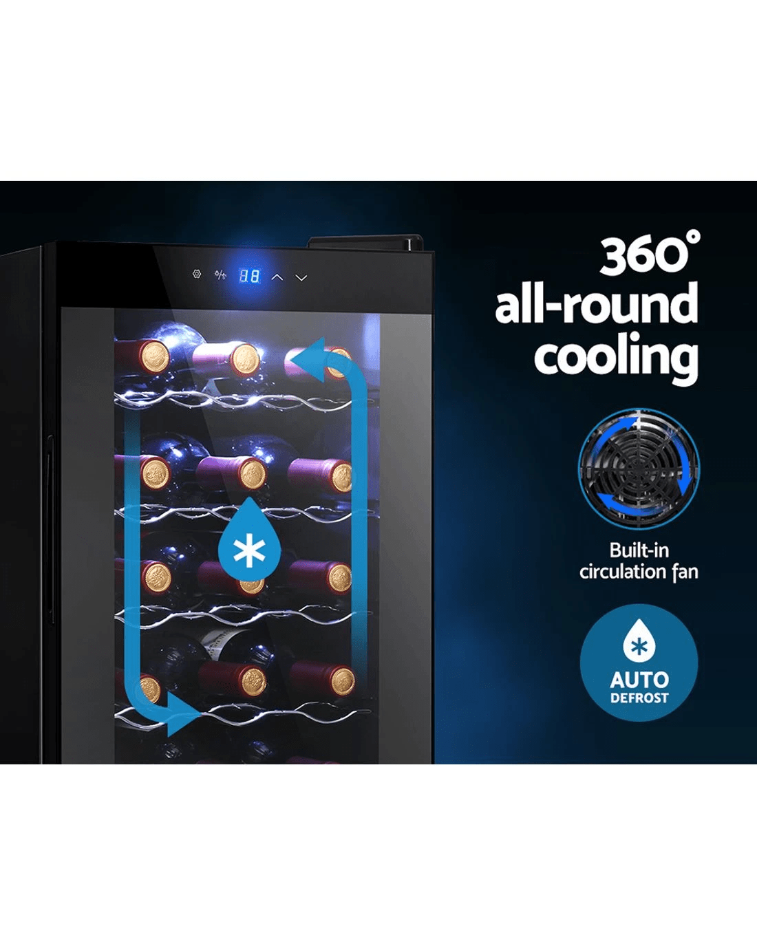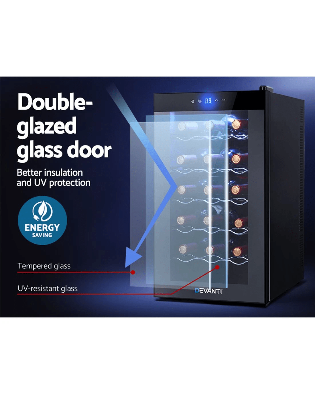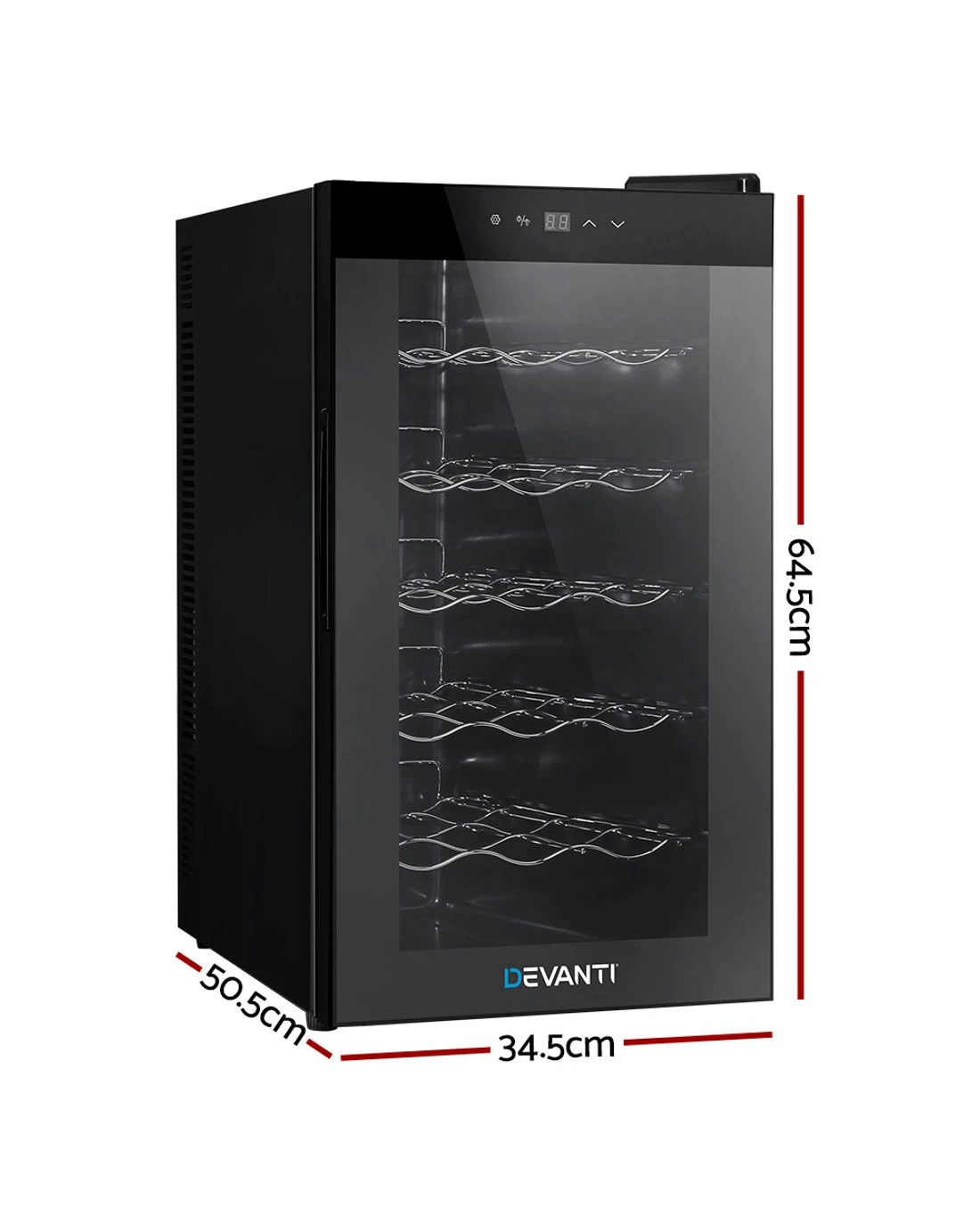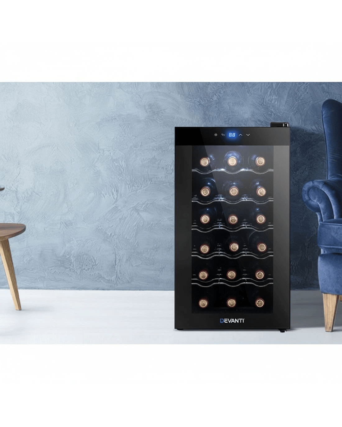 Need a good and reliable wine cooler? Look no further than our Devanti Wine Cooler. Utilising the latest high precision thermoelectric cooling technology, our wine cooler ensures your favourite vintages are kept at their prescribed temperatures with its circulated cool air. The touch control panel makes for easy temperature adjustments and the built-in interior LEDs help you to see your wines in the best light. The stylish and compact design stores up to 18 bottles of wine in a neat and tidy shelving system. Better still, the double-glazed glass door is UV-resistant and provides excellent insulation along with the 30mm thick foam wall. The ensemble works quietly and efficiently and has a handy child-lock on its control panel for total peace of mind. Don't trust just any product with your precious vintages, trust Devanti.