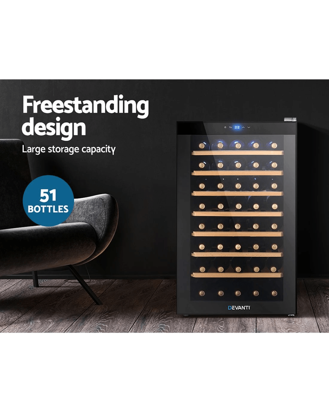 Up to 51 wine bottles storage capacity (standard Bordeaux bottles)