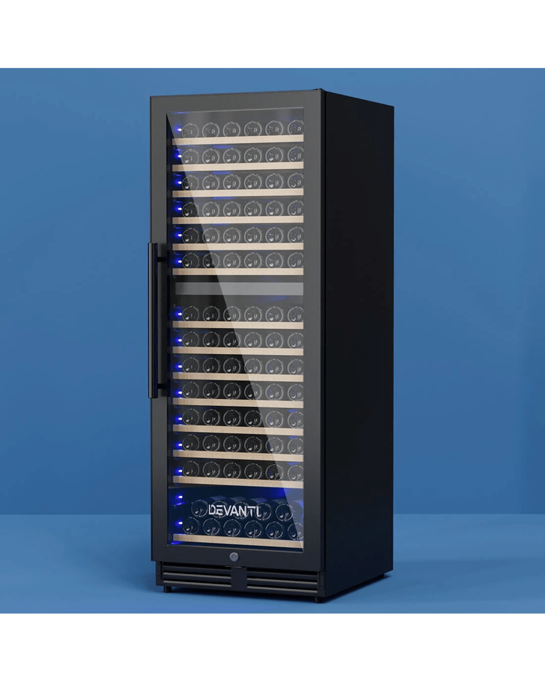 Need a reliable way to store your wine collection? Look no further than our Devanti Wine Cooler. Utilising the latest high-precision Jiaxipera compressor cooling technology, our wine cooler ensures your favourite vintages are well kept at their recommended temperatures with its circulated cool air. The cooler has a dual zone system with two separate temperature-controlled zones, ensuring perfect cooling temperatures for both white and red wines. The temperature can be set between 5℃ and 13℃ for the upper zone (which is suitable for dry white and sparkling wines), and between 12℃ and 18℃ for the lower zone (which is suitable for red wines). The digital control panel makes for easy temperature adjustments while the built-in LED lights help you to see your wines in the best light. The stylish design stores up to 154 bottles of wine in a neat and tidy wood shelving system. Better still, the double-glazed glass door is UV-resistant and provides excellent insulation. The ensemble works quietly and efficiently and has a built-in lock for total peace of mind. Suitable for both home and commercial use. Treat your vintage collection with the care it deserves - invest in a Devanti Wine Cooler today.