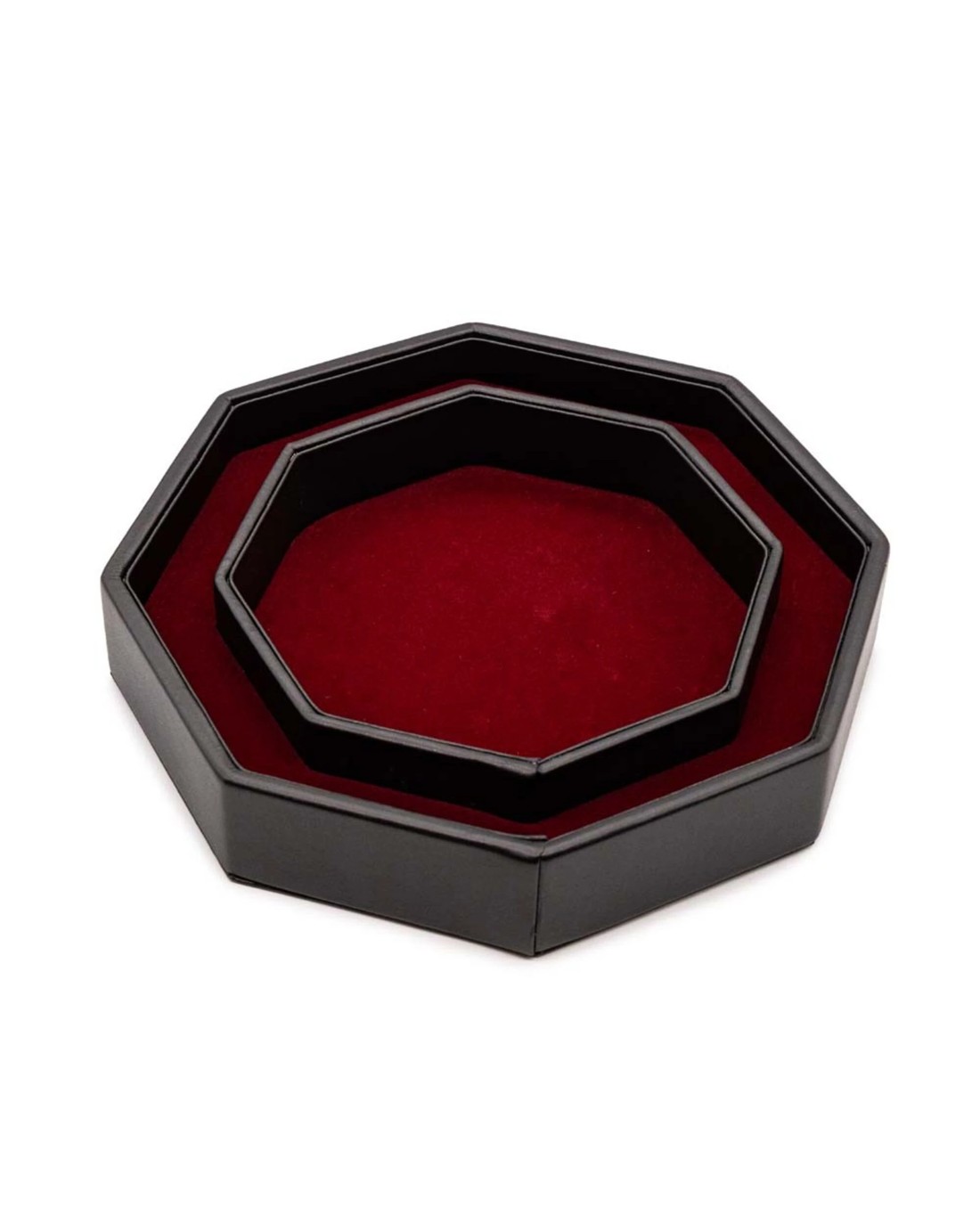 This red velvet-lined dice tray elevates that experience. Crafted with a striking octagonal design and embossed with a bold d20 motif, it blends elegance with functionality. The deep red interior contrasts beautifully with the black exterior, offering a refined space for rolling while protecting your dice and surfaces. Nested trays provide added versatility, making it ideal for both storage and gameplay.