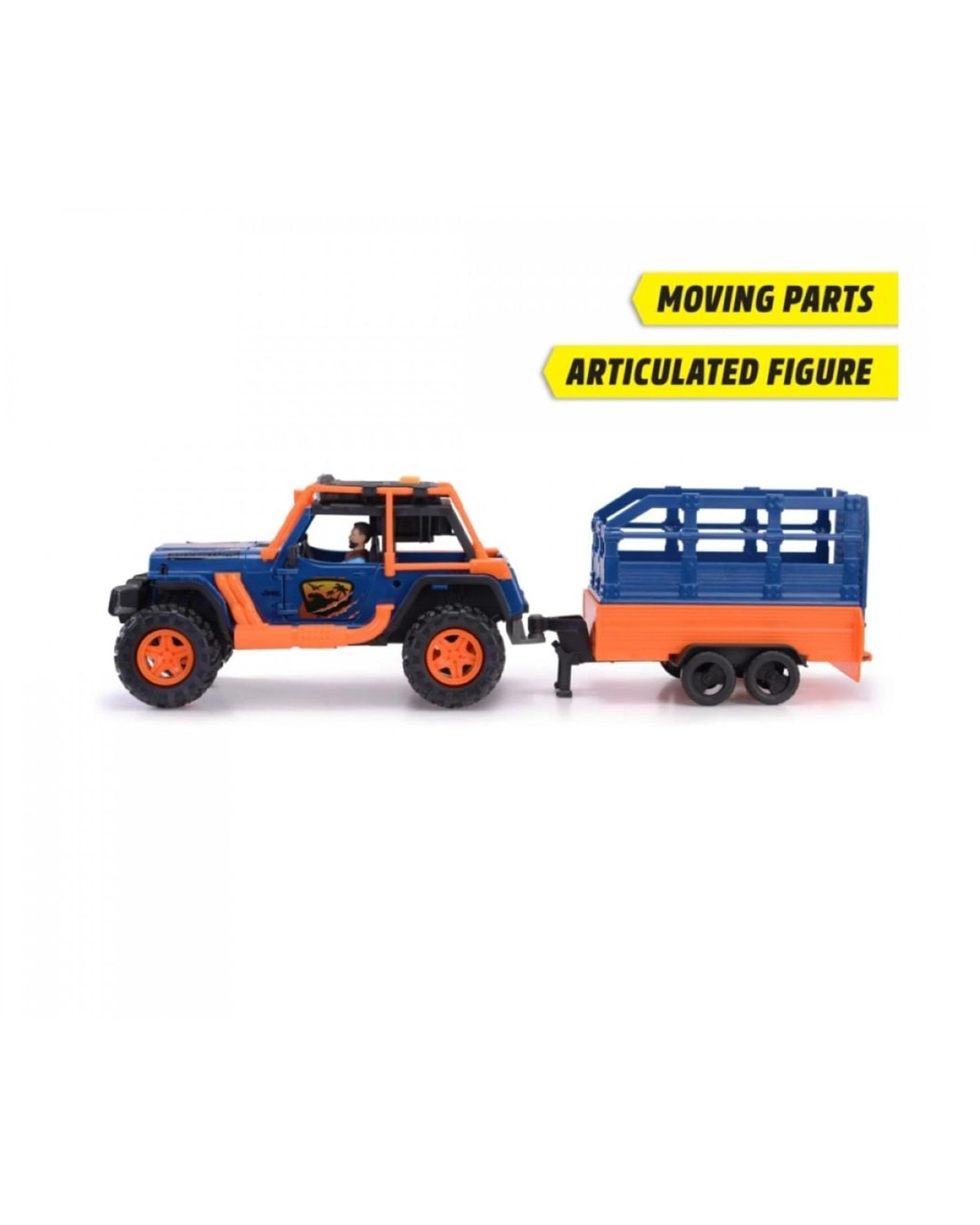 This officially licensed jeep set is the perfect gift for all young fans of dinosaurs and vehicles. In addition to a feature-packed vehicle, the set also includes a large trailer with a cage, as well as two dinosaur figures that can be transported in the trailer. What's more, the vehicle comes with soft tires to ensure that it doesn't veer off course.The vehicle also features light and sound effects that can be activated via a button on the roof and help to stimulate your child's imagination, while the doors of the vehicle and trailer can be opened and closed for storing the dinosaurs and other small accessories. A bendable figure is also included with the set. Ages: 3+