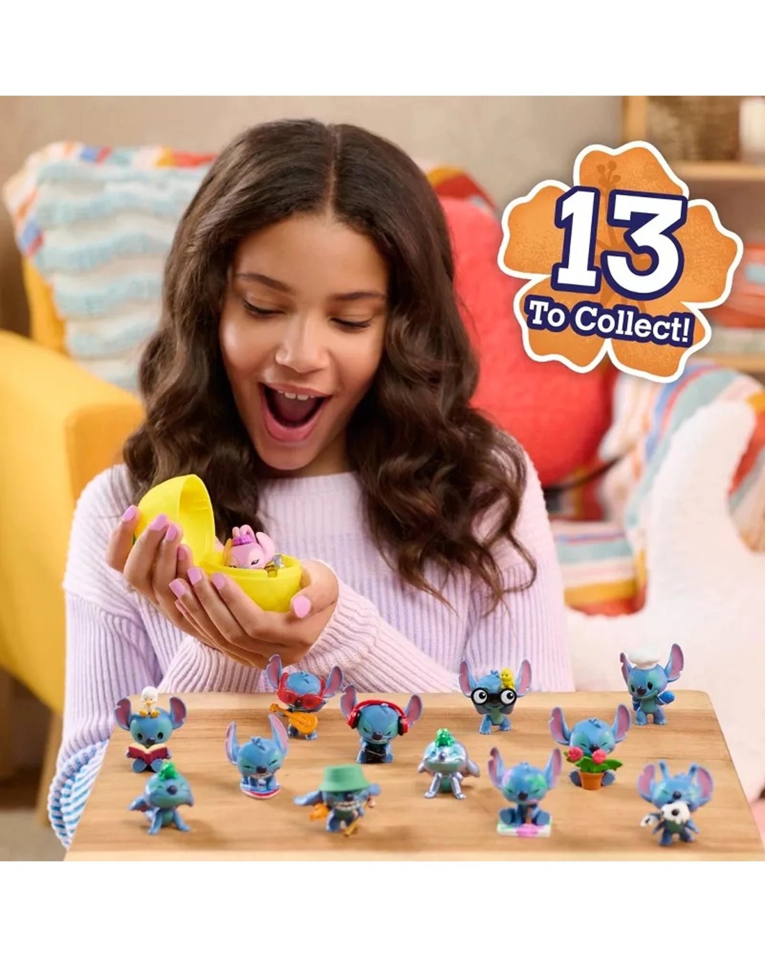 Join Disney Stitch on exciting adventures with the Disney Stitch That's So Stitch collectible toy figures. These adorable figures let imaginations soar as kids explore Stitch's favorite hobbies. Hidden in colorful, pineapple-shaped blind capsules, each surprise 2-inch figure showcases Stitch or Angel in 1 of 13 fun poses, from gaming and baking to playing soccer, reading, surfing, yoga, and more. These Disney Stitch toy figures are perfect for imaginative play or display, and make delightful party favors or cake toppers. An out-of-this-world surprise awaits Disney Stitch fans as they discover and collect all 13 figures to complete the set. Ages 3 +Features