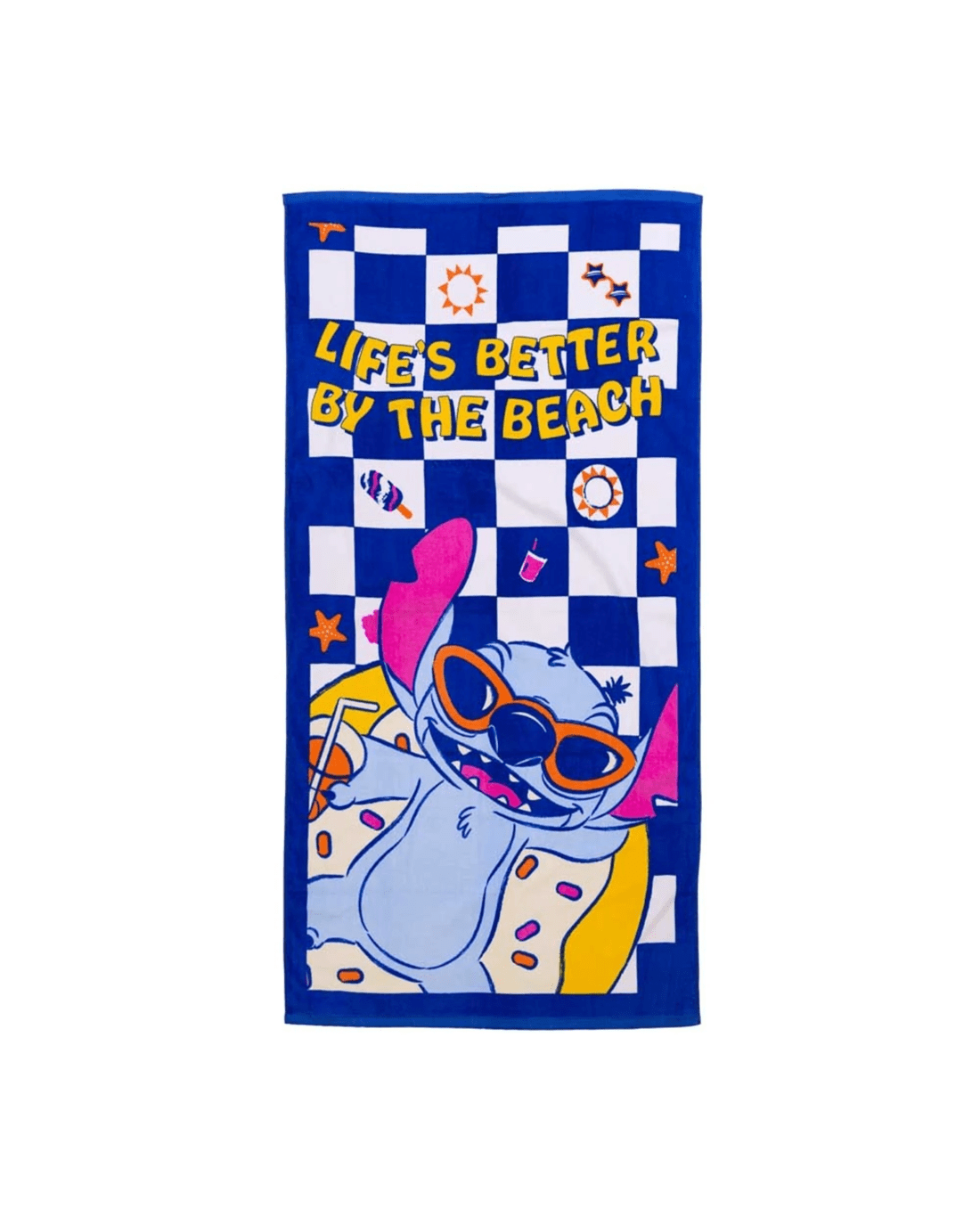 Perfect for sunny days, this officially licensed towel features Stitch living his best beach life. With a bold blue-and-white checkered backdrop, playful icons like starfish and floaties, and the uplifting phrase Lifes Better By the Beach, this towel is made for fans who like their beach gear with a splash of personality. Whether its poolside lounging or seaside adventures, Stitch is here to turn up the fun.