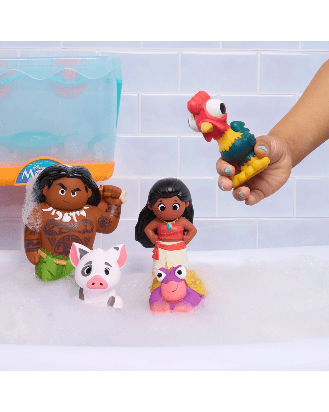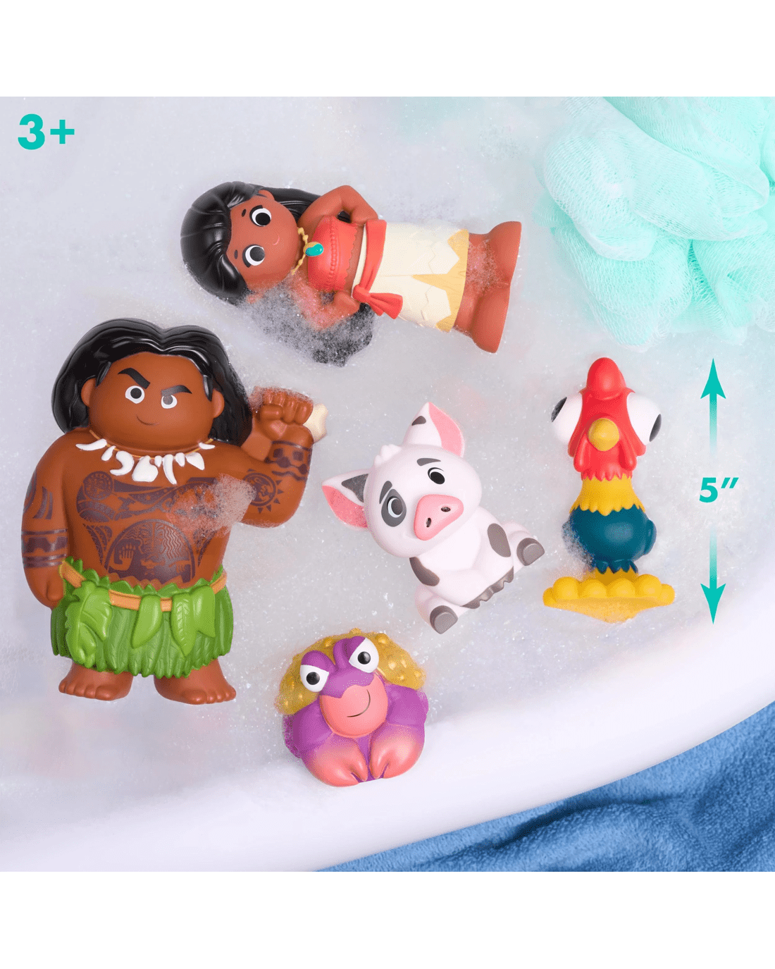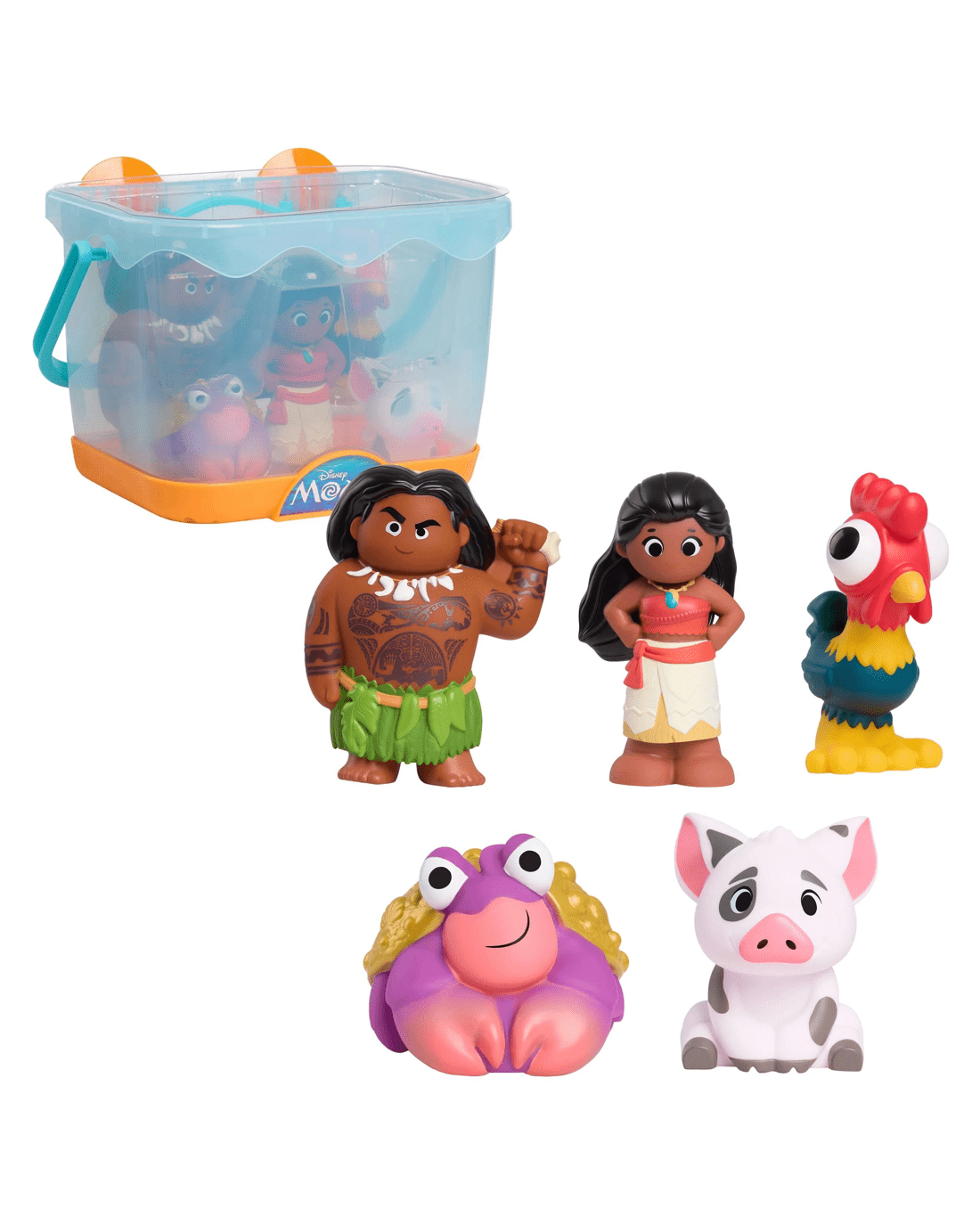 - Includes: 5 Disney Moana bath toy figures, storage caddy