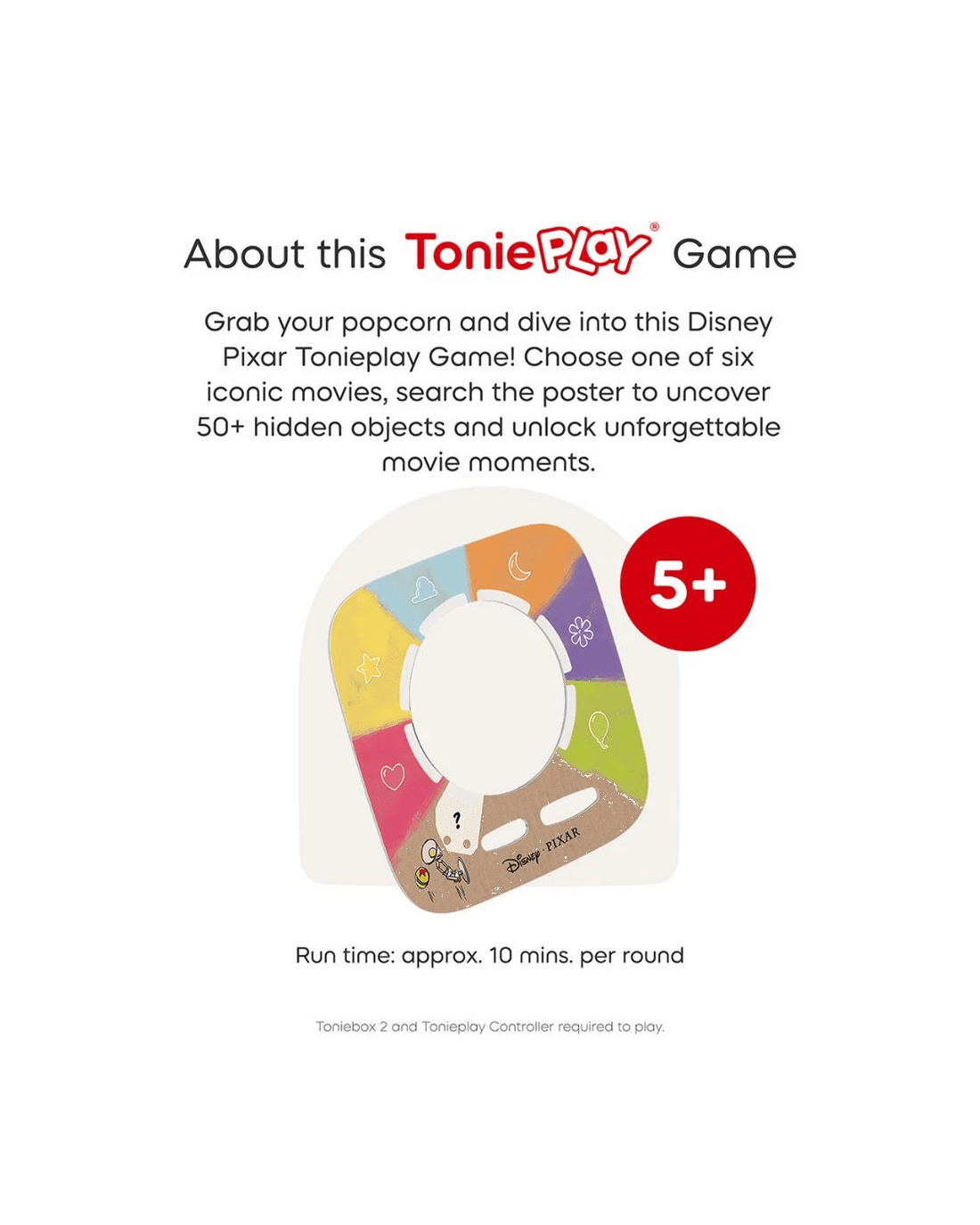 • Interactive Tonieplay game inspired by Disney and Pixar movies including Toy Story, Finding Nemo, Cars, Monsters Inc, The Incredibles and Coco.
