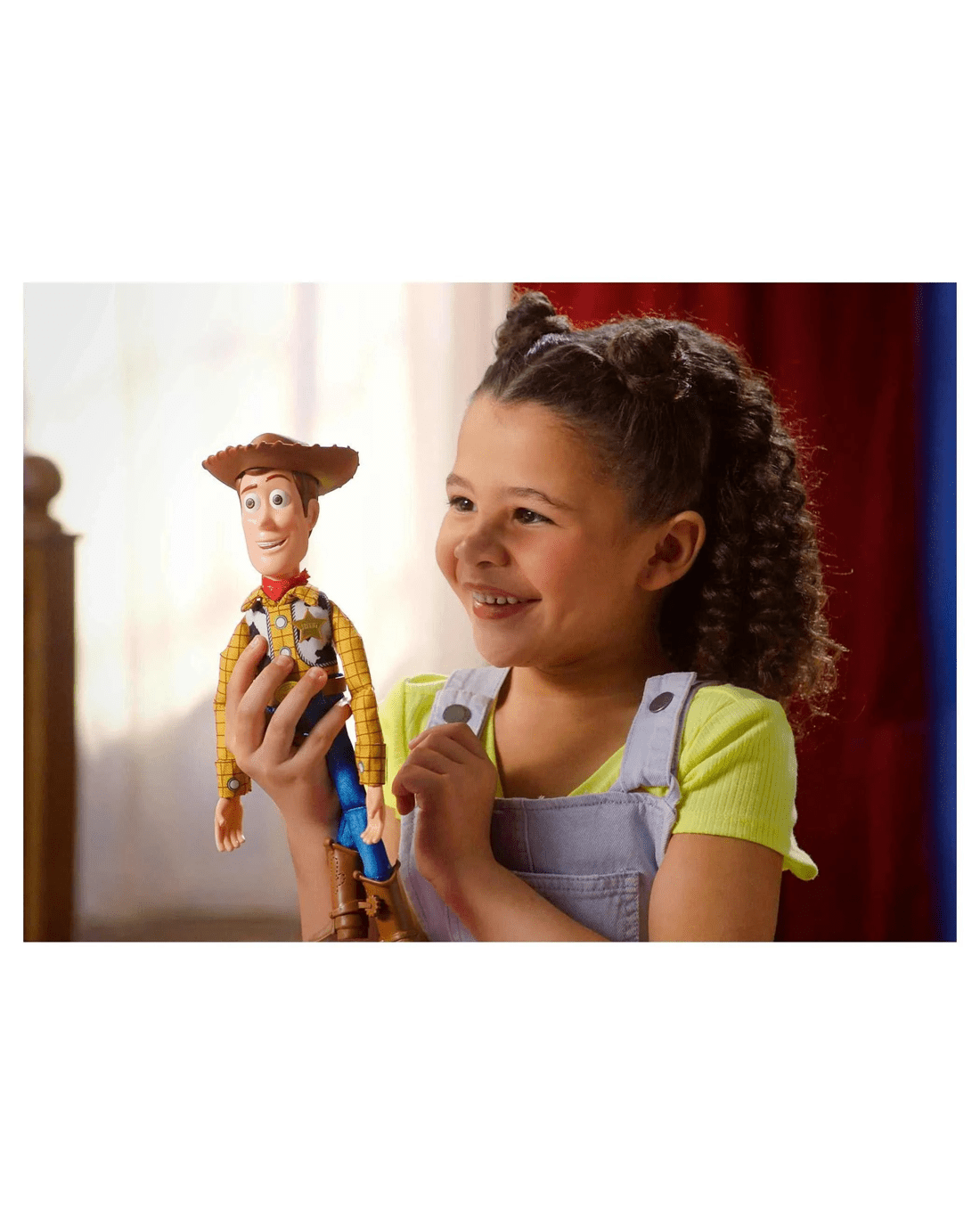 Yes sir, time to round us up an adventure! This Roundup Fun Woody 12 inch figure will bring big realistic thrills to fans of the friendly sheriff from Disney and Pixar's Toy Story movies. With 30+ phrases activated by the pull-tab on his back, fans young and old can discover huge interactive fun. A sheriff always needs his deputy! His truly movie-authentic look is achieved with multiple materials to really bring the character to life, including a soft rag doll body, iconic western shirt, jeans and vest, produced in fabric, and head, hat, boots, belt and hands made of plastic. Kids can relive all their favorite Woody scenes from the movie series, with the phrases coming directly from this talking Woody figure. Like Andy, they'll want to take him everywhere! Colors, dimensions and decorations may vary. Ages: 4+