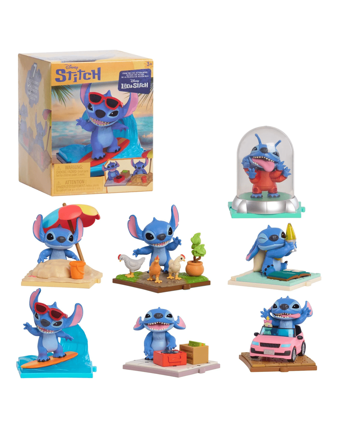 • 7 to Collect: Look for Stitch with record player, surfboard, beach umbrella, chickens, lava lamp, and pink convertible. Find the rare, metallic Experiment 626 chase figure! Each sold separately.
