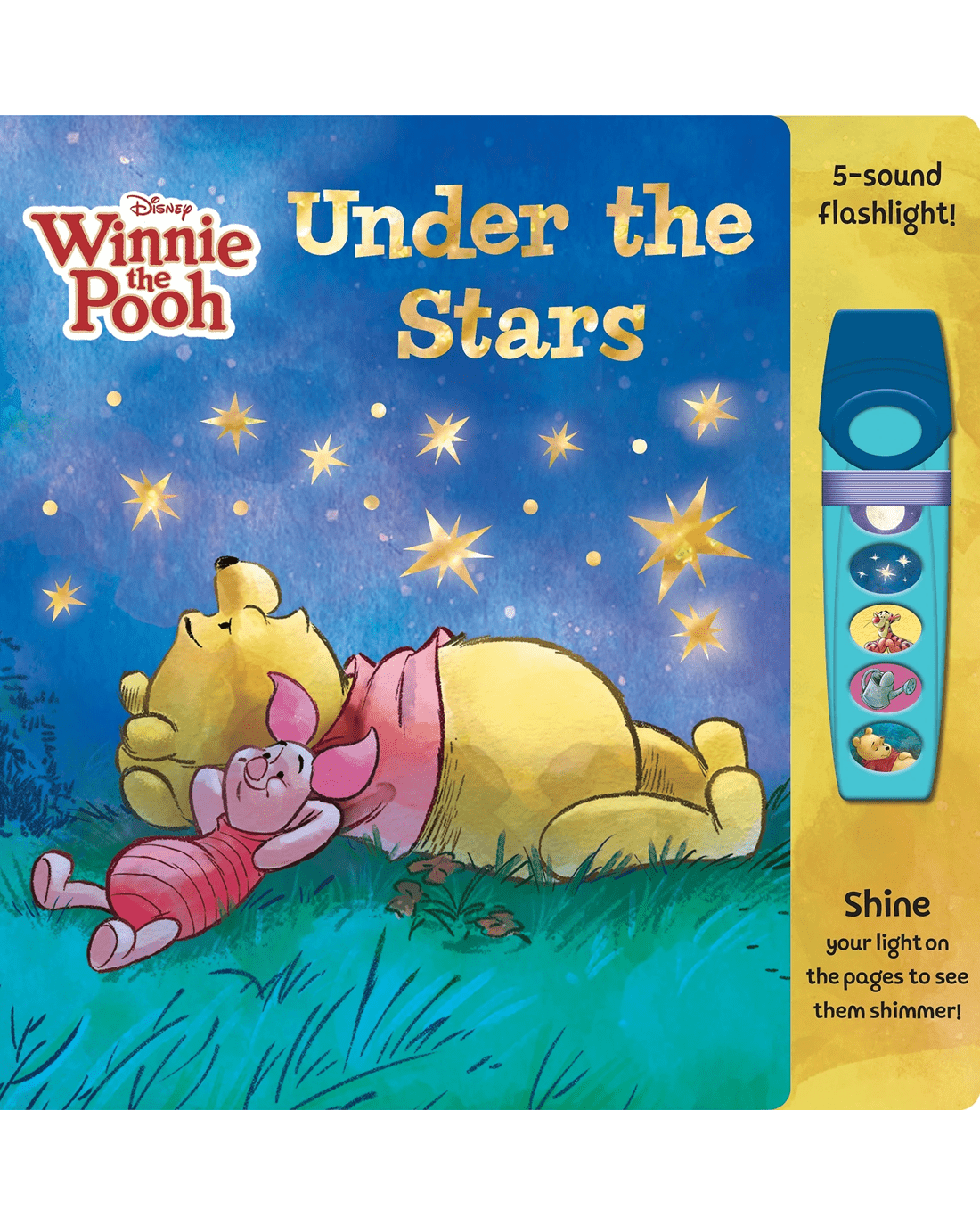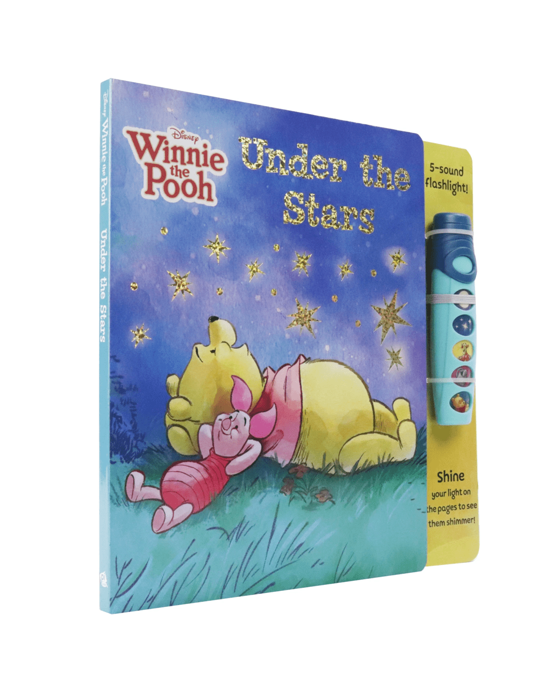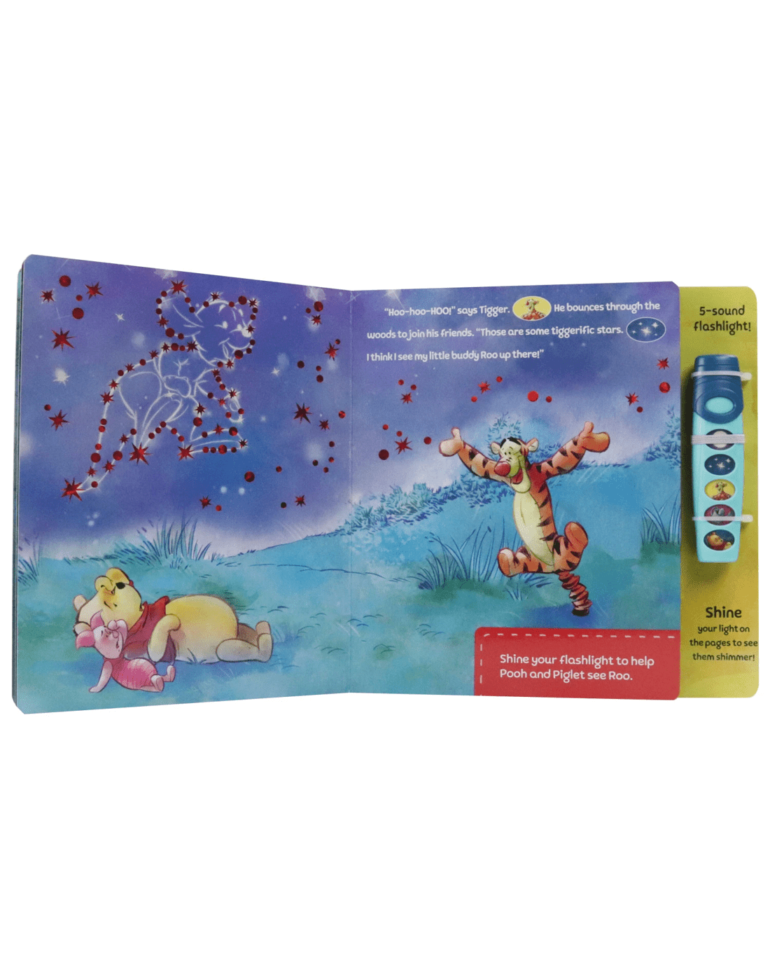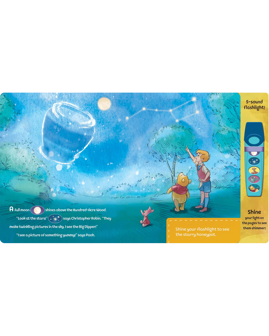 What does Winnie the Pooh see when he looks up at the night sky? Grab your flashlight to stargaze with Pooh and his friends! The foiled pages sparkle and shine in your flashlight's glow, and five buttons on the flashlight play sounds to enhance the story! The sound storybook encourages imagination, exploration and learning through play. Includes a real working flashlight.