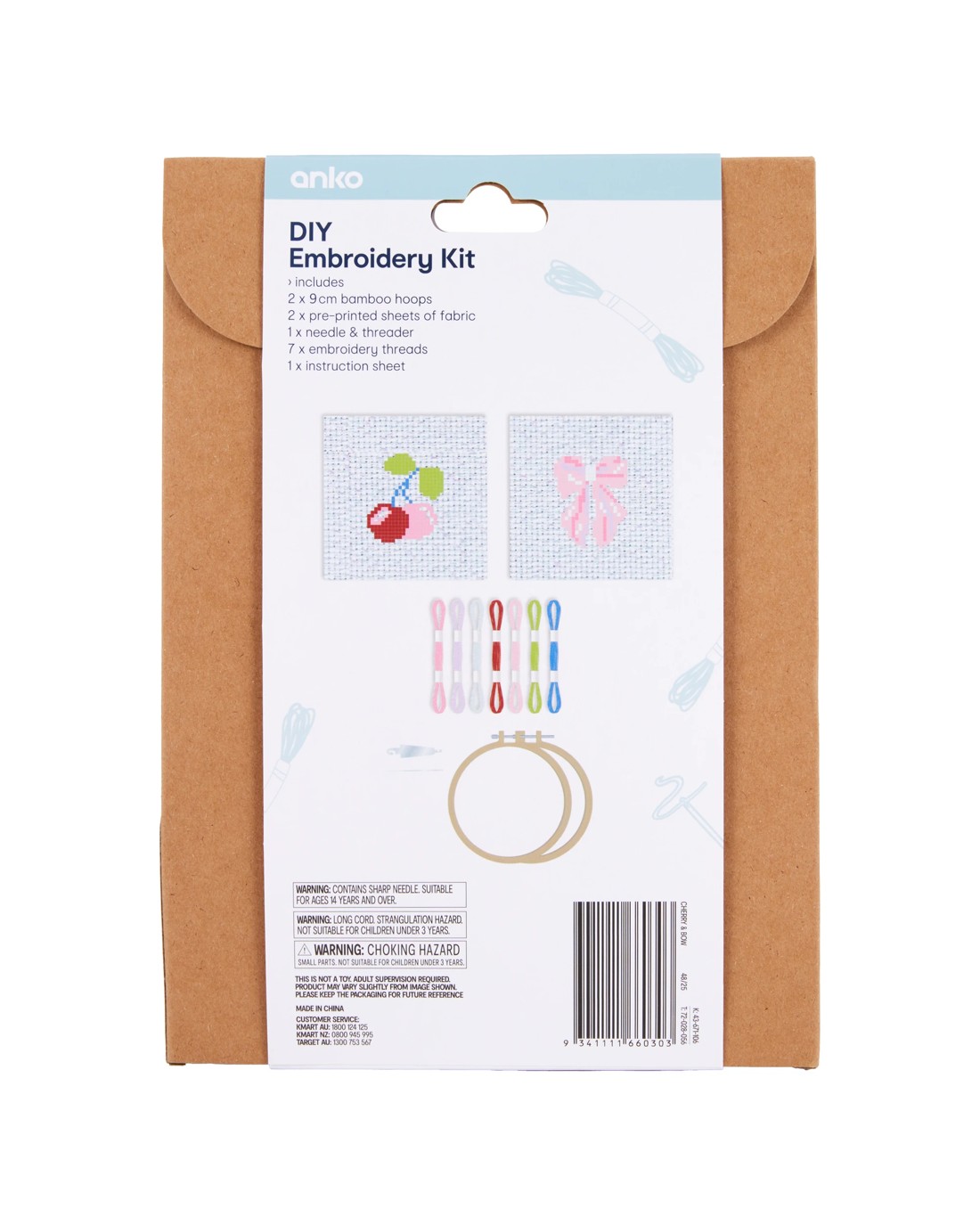 • Includes 2 x 9cm bamboo hoops, 2 x pre-printed sheets of fabric, 1 x needle and threader, 7 x embroidery threads and 1 x instruction sheet