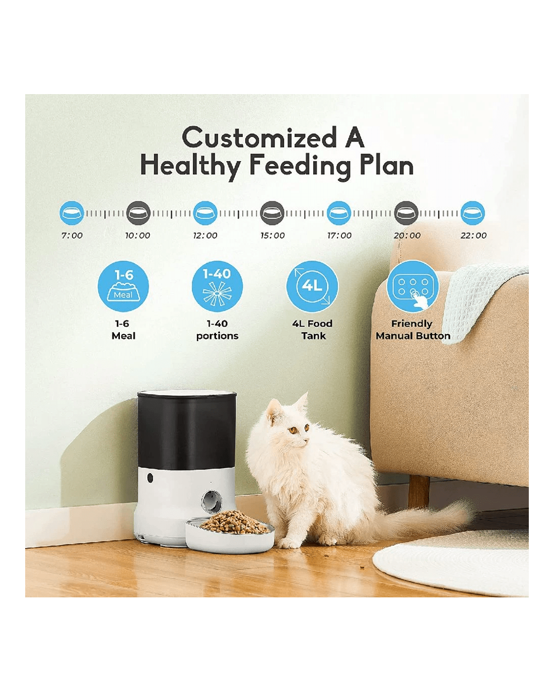 - You can program the number of meals per day and the portion sizes to manage your pet’s diet.