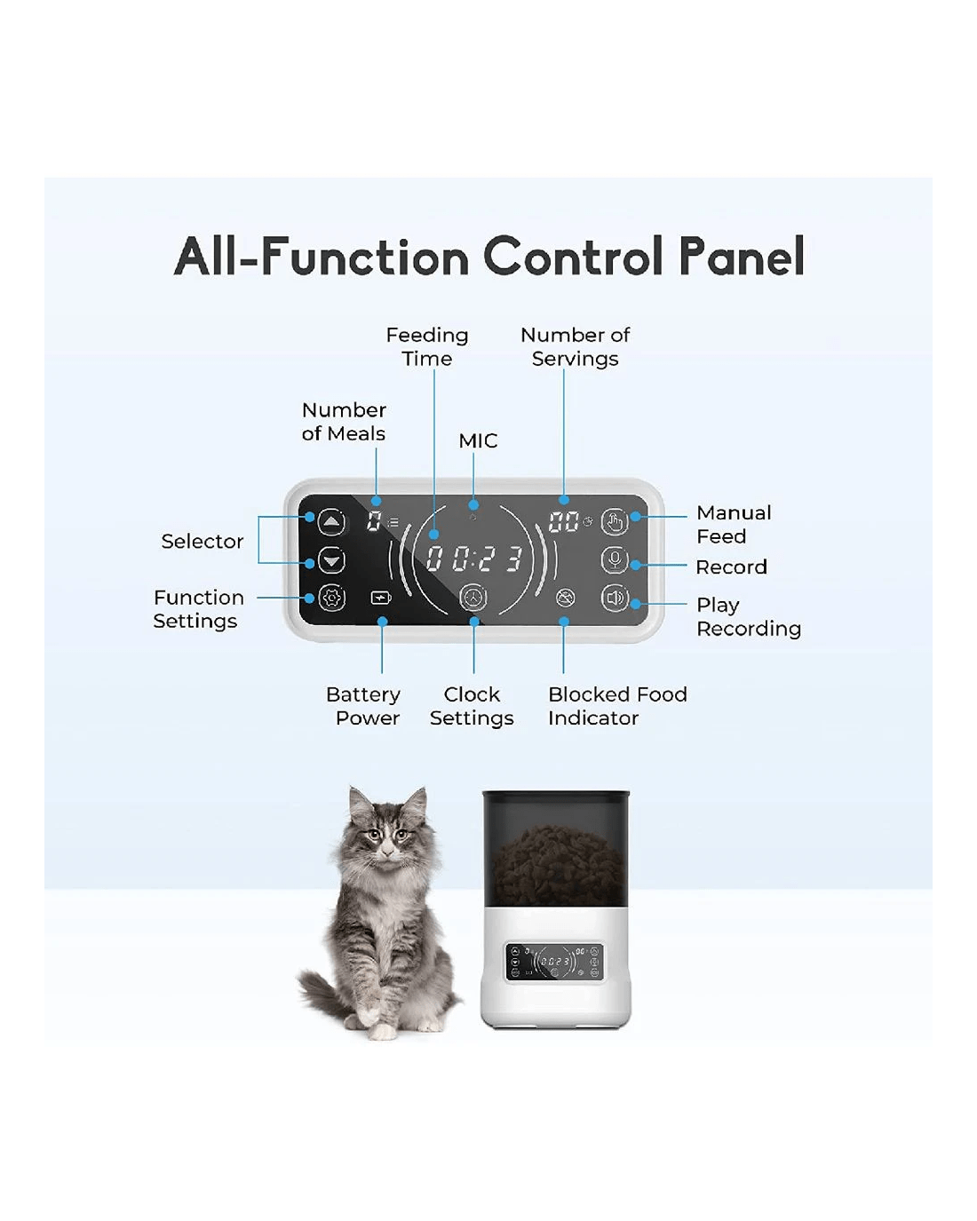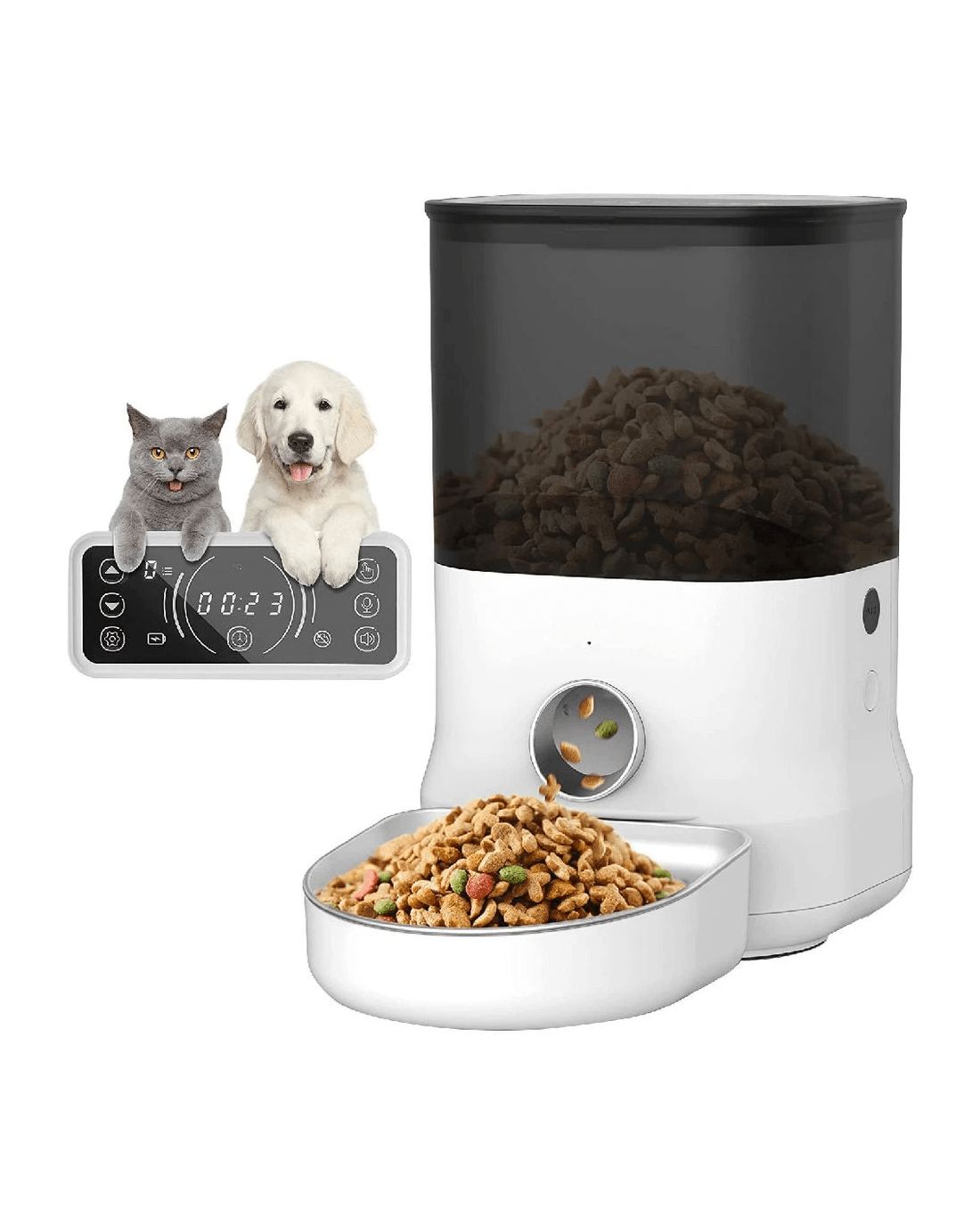 - The built-in microphone lets you record a personalised message to alert your pet at meal times.