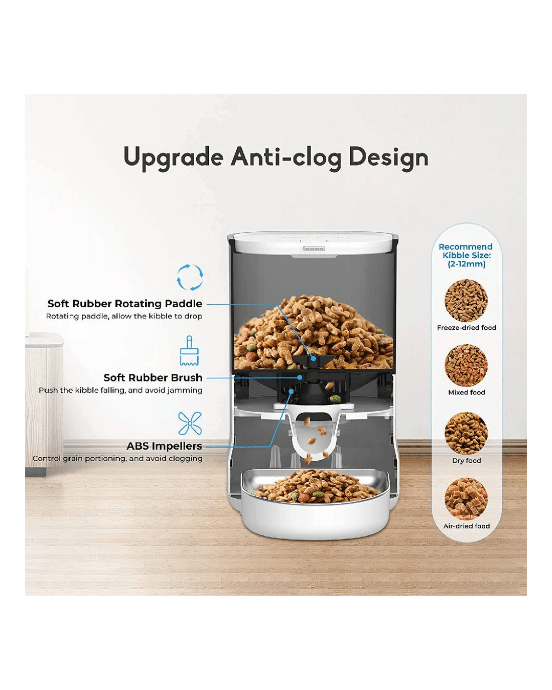 - Use only dry food with kibble between the size of 0.5 – 1.5 cm.