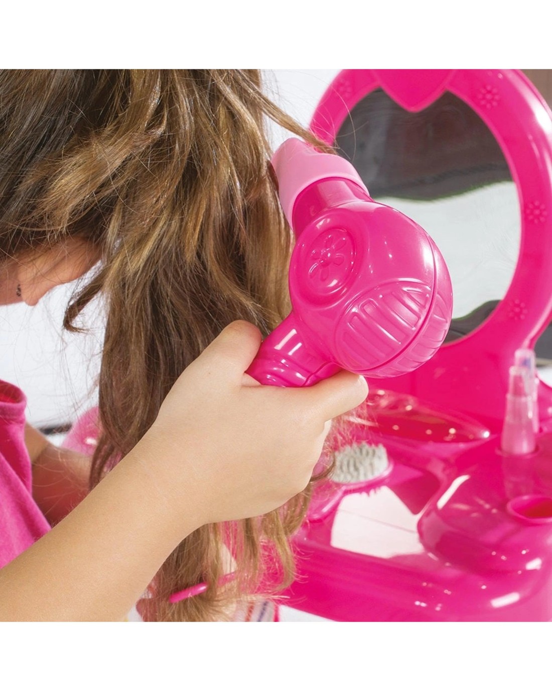 This table top Unicorn themed vanity set is just the thing for young girls preparing for a magical ball or simply getting ready for the day. Let imaginations run wild with this set of detailed play-pretend cosmetics and accessories. The set is compact with built in storage. Includes 12 pretend play accessories and hair dryer. No batteries are required. Helps to develop children's motor skills and supports their social development. Ages 3 +
