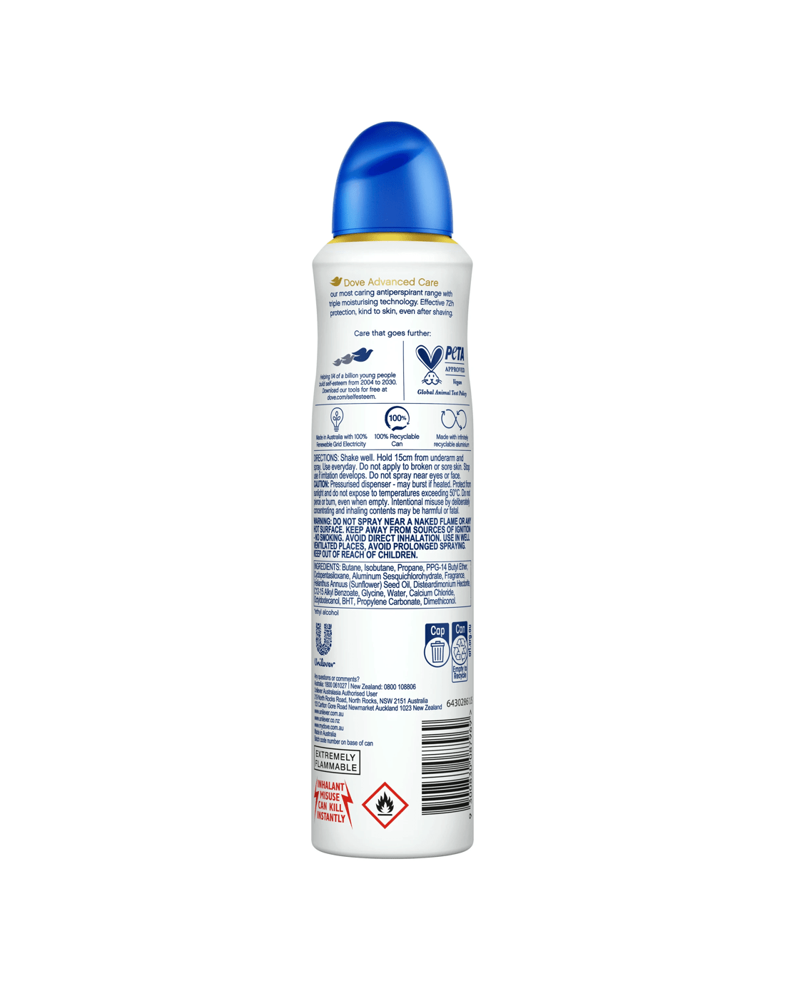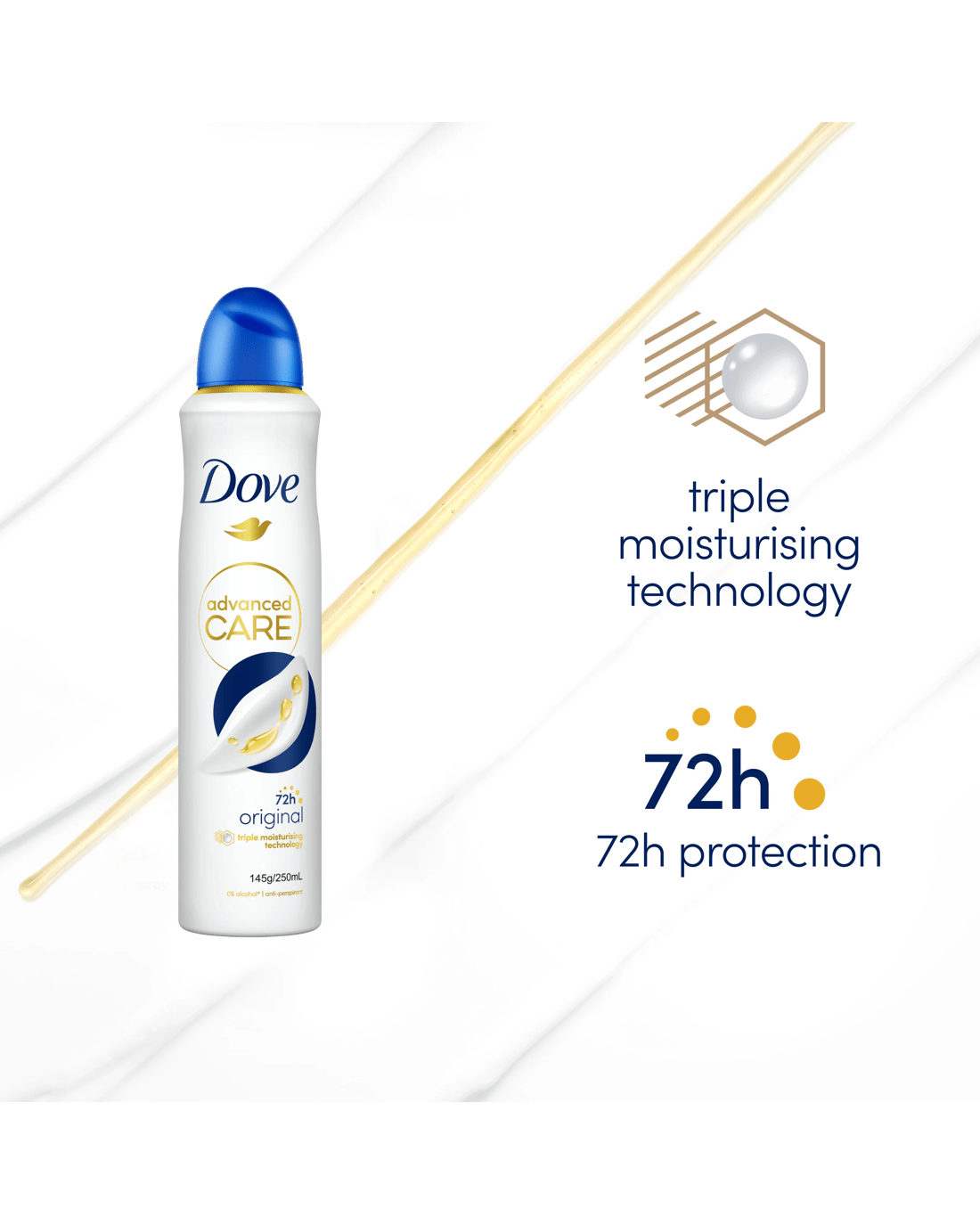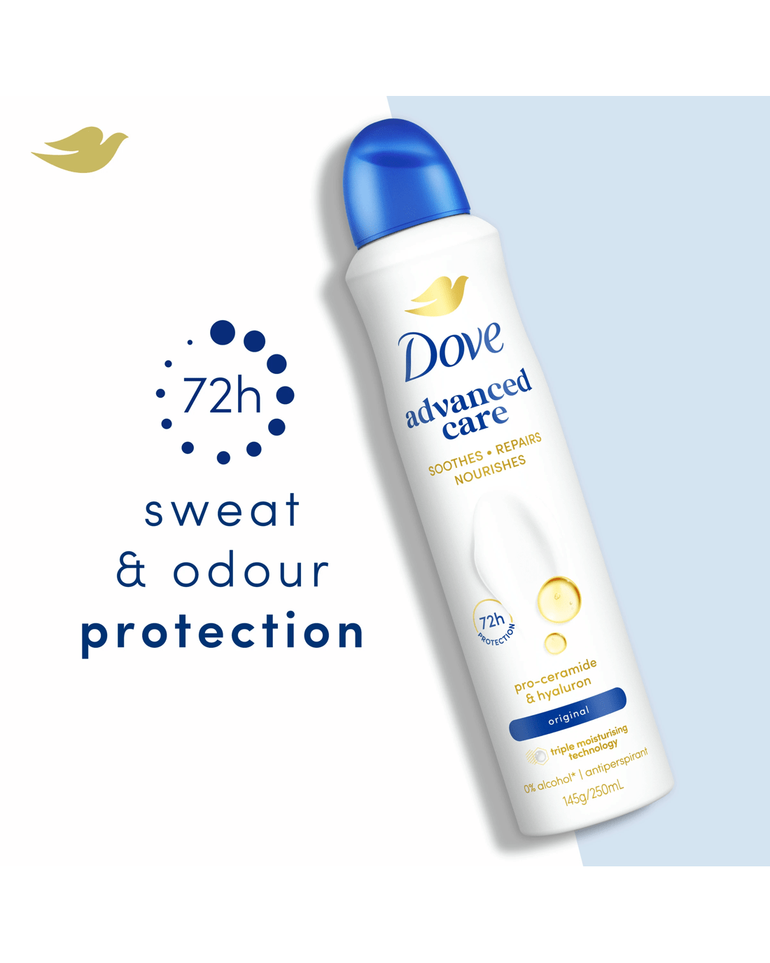 - Dove Advanced Care: Our most caring antiperspirant range with triple moisturising technology. Effective 72h protection, kind to skin, even after shaving
