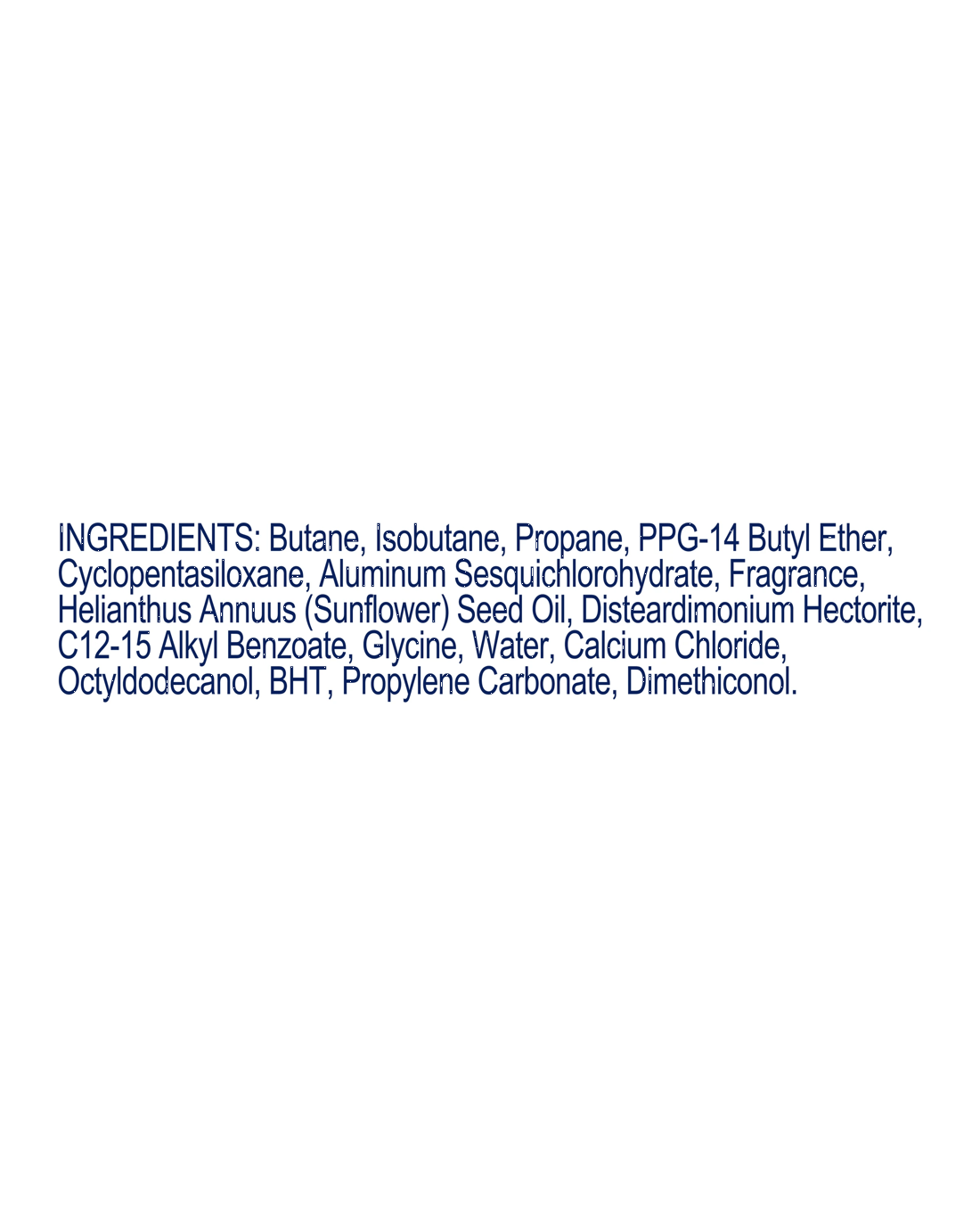 - Ingredients: Butane, Isobutane, Propane, PPG-14 Butyl Ether, Cyclopentasiloxane, Aluminum Sesquichlorohydrate, Fragrance, Helianthus Annuus (Sunflower) Seed Oil, Disteardimonium Hectorite, C12-15 Alkyl Benzoate, Glycine, Water, Calcium Chloride, Octyldodecanol, BHT, Propylene Carbonate, Dimethiconol