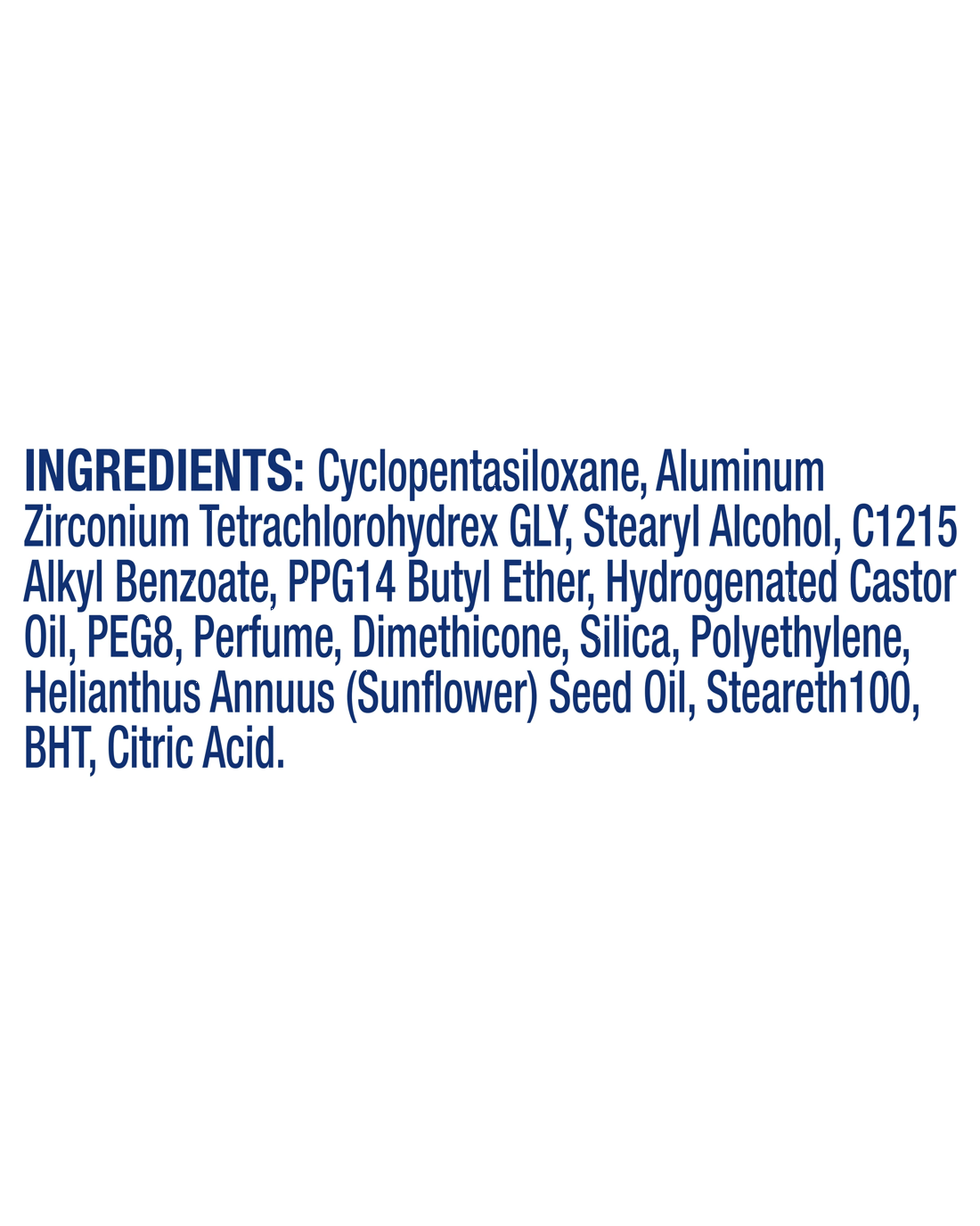 - Ingredients: Cyclopentasiloxane, Aluminum Zirconium Tetrachlorohydrex GLY, Stearyl Alcohol, C12-15 Alkyl Benzoate, PPG-14 Butyl Ether, Hydrogenated Castor Oil, PEG-8, Perfume, Dimethicone, Silica, Polyethylene, Helianthus Annuus (Sunflower) Seed Oil, Steareth-100, BHT, Citric Acid
