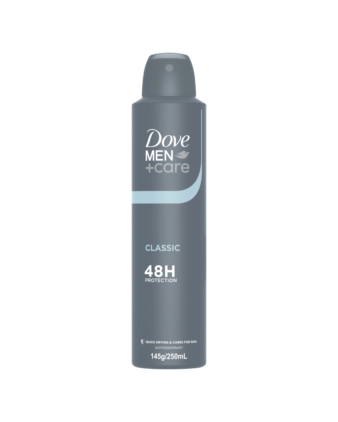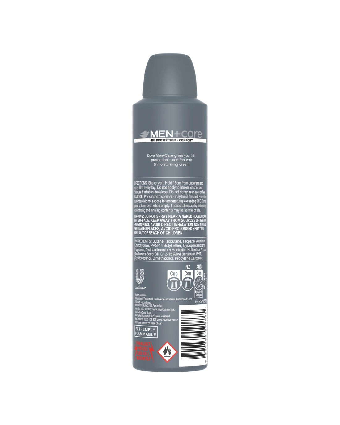 Looking for an antiperspirant that keeps you feeling fresh and confident all day? Enter Dove Men+Care Fresh Antiperspirant Aerosol. This caring deodorant spray combines powerful 48-hour protection with an instantly fresh feel. Containing ¼ moisturising cream, the alcohol-free* formula cares for your underarms and shields them from irritation. Your skin is left feeling comfortable with a long-lasting fragrance that keeps you smelling good all day. This antiperspirant deodorant spray is tough on sweat, not on skin, and suitable for everyday use. Dove Men+Care does not test on animals anywhere in the world and our Fresh Antiperspirant Aerosol is PETA-Approved Vegan. Dove Men+Care celebrates a new definition of strength: one with care at its centre. Real strength is shown through the care you give to the people that matter - and that includes you. To ensure complete antiperspirant protection, give the can a good shake, then hold it 15cm away from your underarm and spray evenly in short bursts in a well-ventilated area. Our deodorant spray is made in Australia with renewable grid electricity and comes in a recyclable metal can - please recycle when empty. Whether you’re looking for a deodorant for men to keep you feeling fresh and dry all day or a body wash to help keep your skin hydrated, Dove Men+Care products are designed to protect and care for your skin.