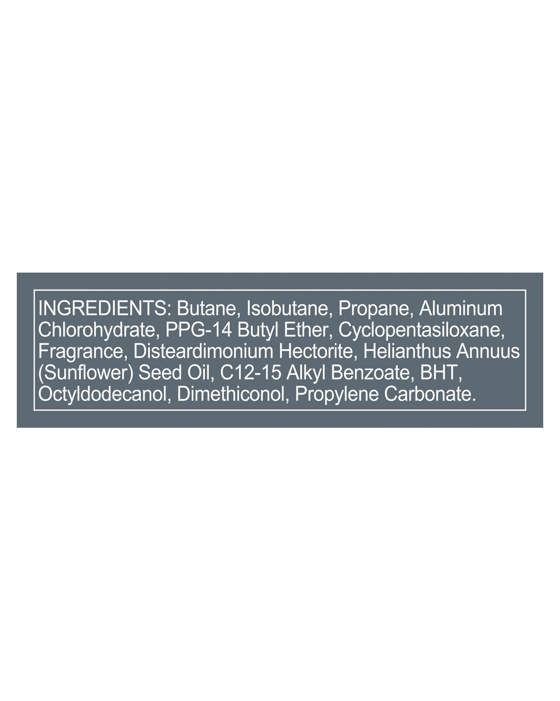- Ingredients: Butane, Isobutane, Propane, Aluminum Chlorohydrate, PPG-14 Butyl Ether, Cyclopentasiloxane, Fragrance, Disteardimonium Hectorite, Helianthus Annuus (Sunflower) Seed Oil, C12-15 Alkyl Benzoate, BHT, Octyldodecanol, Dimethiconol, Propylene Carbonate