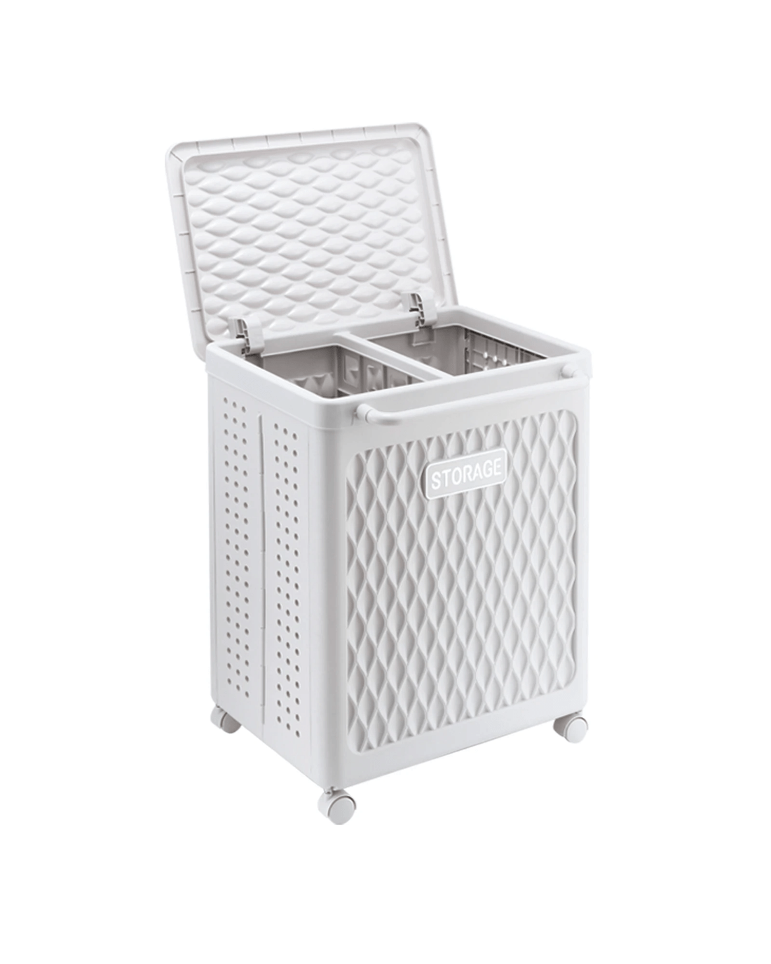 Stay on top of your laundry with this Large Laundry Basket Clothes Hamper Foldable Garment Organiser. Featuring two separate compartments, it helps sort garments and prevent colour transfer, while the built-in airflow holes keep dirty or damp clothes well-ventilated to reduce unpleasant odours. Its generous capacity is perfect for handling laundry for the whole family. The hamper glides smoothly on four wheels-two with locking brakes for added stability-and features a front handle with a comfortable, non-slip grip that's gentle on your hands. Loaded with high-quality, waterproof plastic, it is eco-friendly, sturdy, durable and easy to clean. When not in use, this double laundry hamper folds down for space-saving storage, making it ideal for compact spaces like apartments, dorm rooms, or laundry areas. Thanks to its freestanding structure, it also doubles as a versatile storage bin for towels, toys or household items in bathrooms, nurseries, hotels, or beach houses.