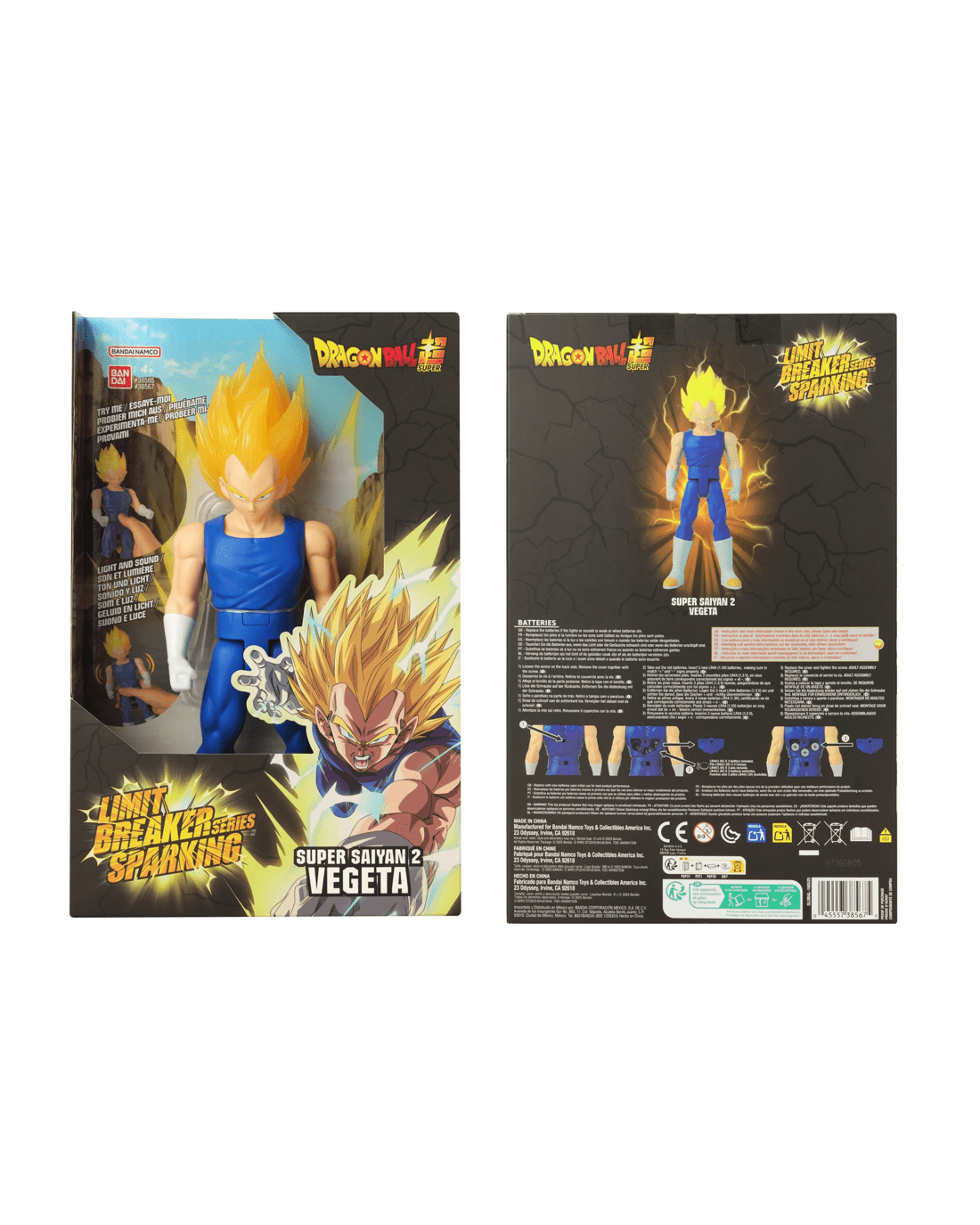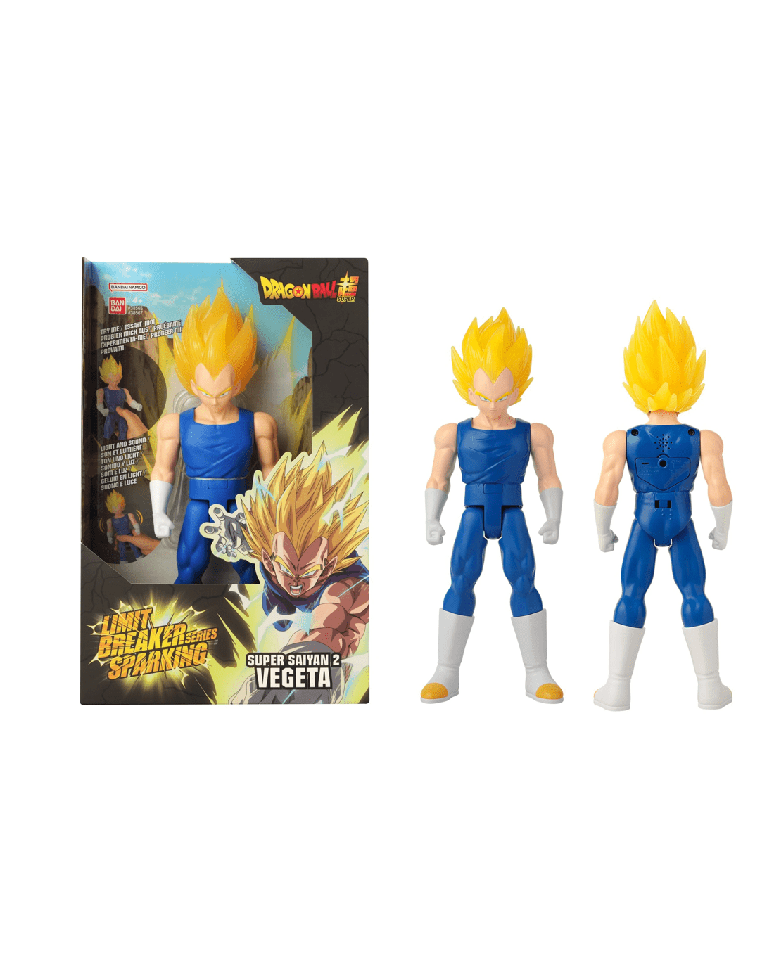 Step into the legendary world of Dragon Ball with the 12-inch Limit Breaker Sparking Super Saiyan 2 Vegeta figure. Packed with authentic lights and sounds inspired by the iconic anime, this action hero brings your battles to life and makes playtime unforgettable. Designed for fans aged 4 and up, Vegeta features 5 points of articulation so you can recreate epic fights and pose him in all your favourite stances. Whether you're expanding your collection or introducing someone new to Dragon Ball, this figure delivers endless adventures that spark the imagination. Made for energetic fans and collectors alike, he’s ready to take any challenge. Add Super Saiyan 2 Vegeta to your roster today and experience the excitement firsthand!Features