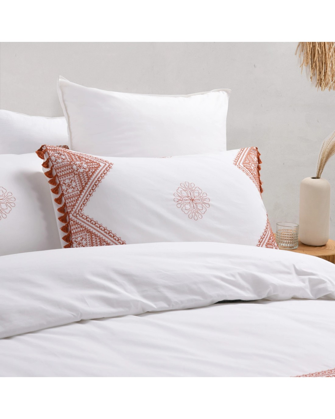 The Liberty is a white boho quilt cover, and you can choose navy blue or rust embellishments to best suit your unique space and style. This boho-style doona cover set includes two standard pillowcases with embroidery and tassels, and the matching European pillowcases complete the look.