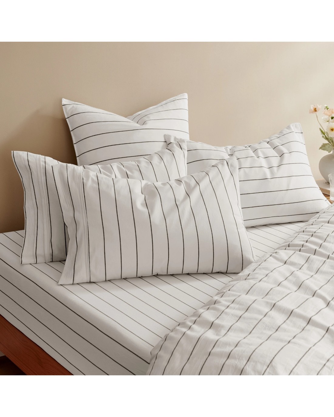 Dreamaker Rumi Stripe Washed Cotton Fitted Sheet Set - Double Bed - White with Graphite