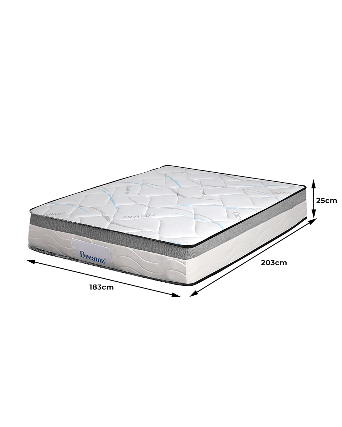 Transform your sleep experience with the Dreamz Mattress King Bed, designed with advanced pocket spring technology and premium materials for unmatched comfort and support. This 25cm thick mattress offers the perfect balance of medium firmness and comprehensive support, making it an ideal choice for restful, rejuvenating sleep.