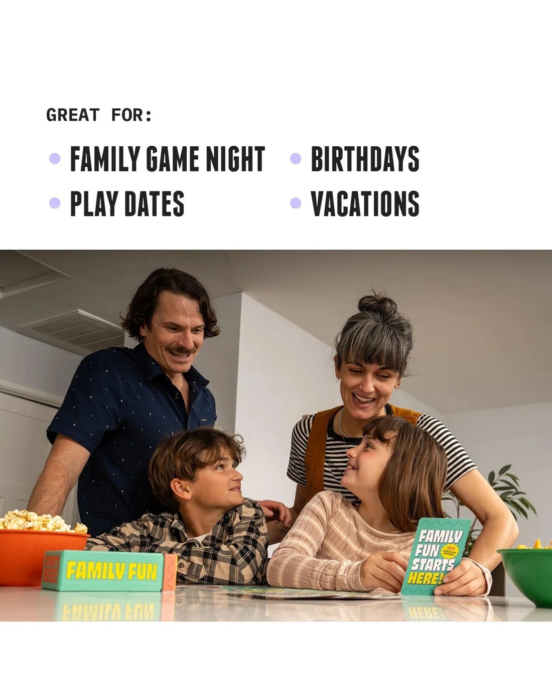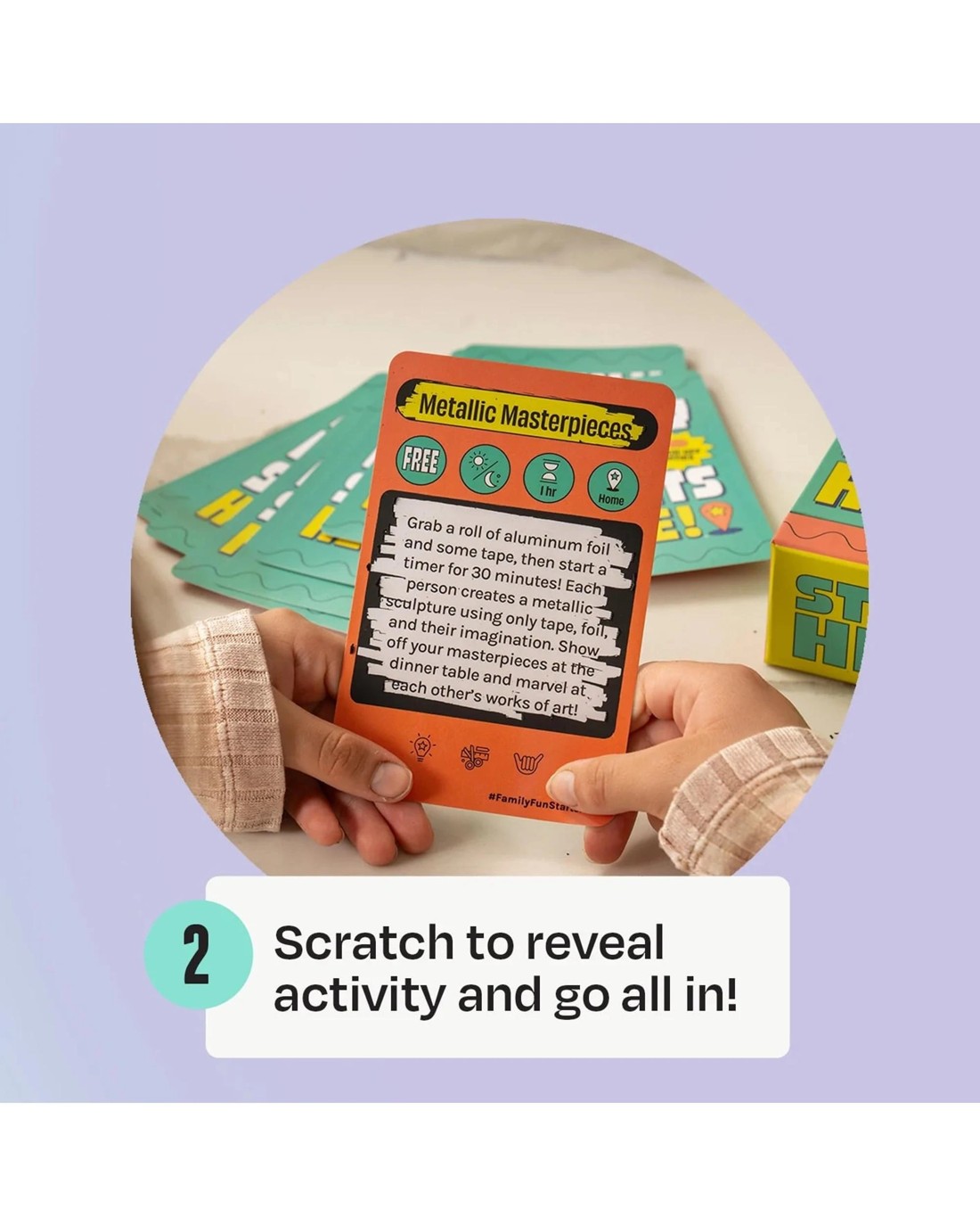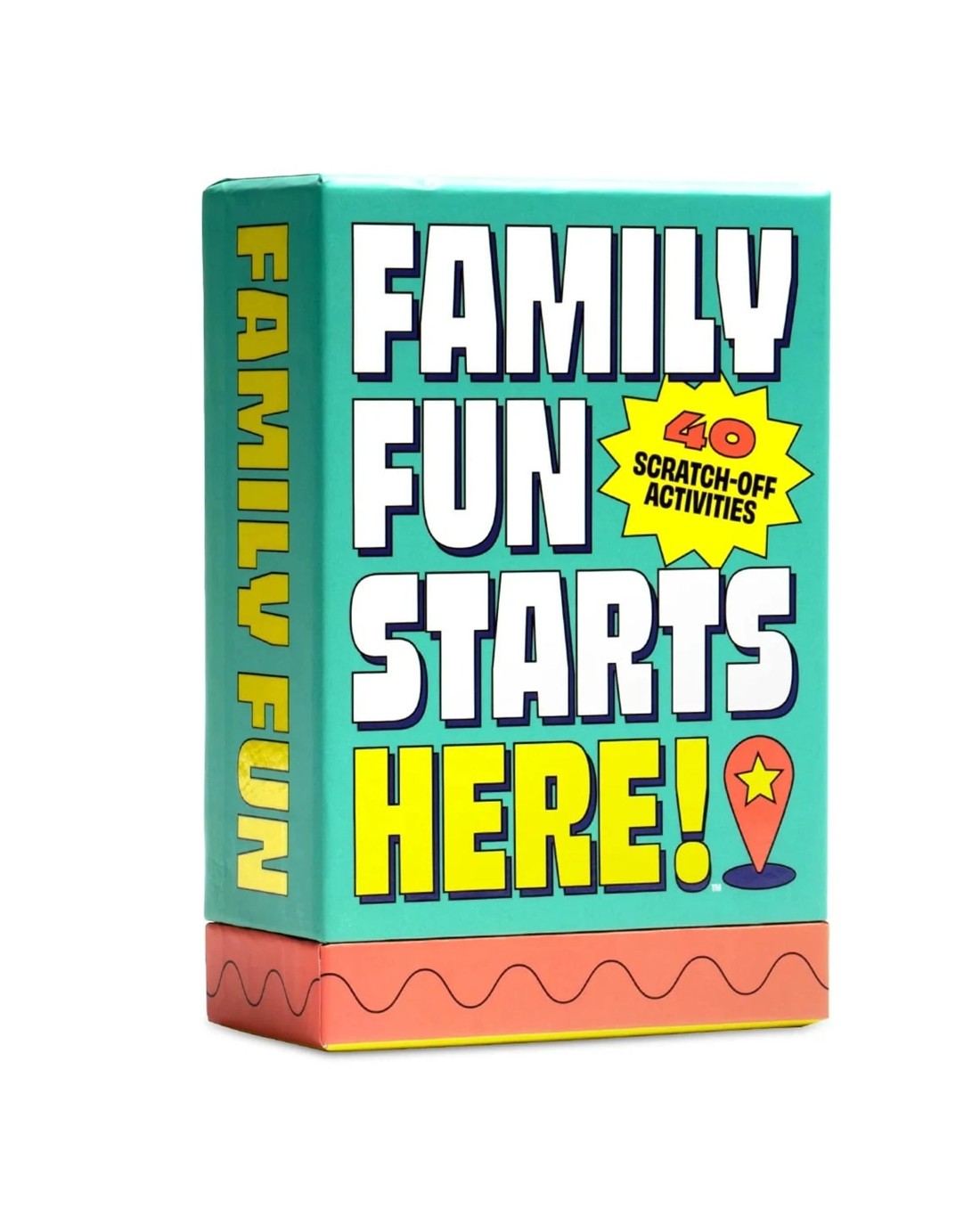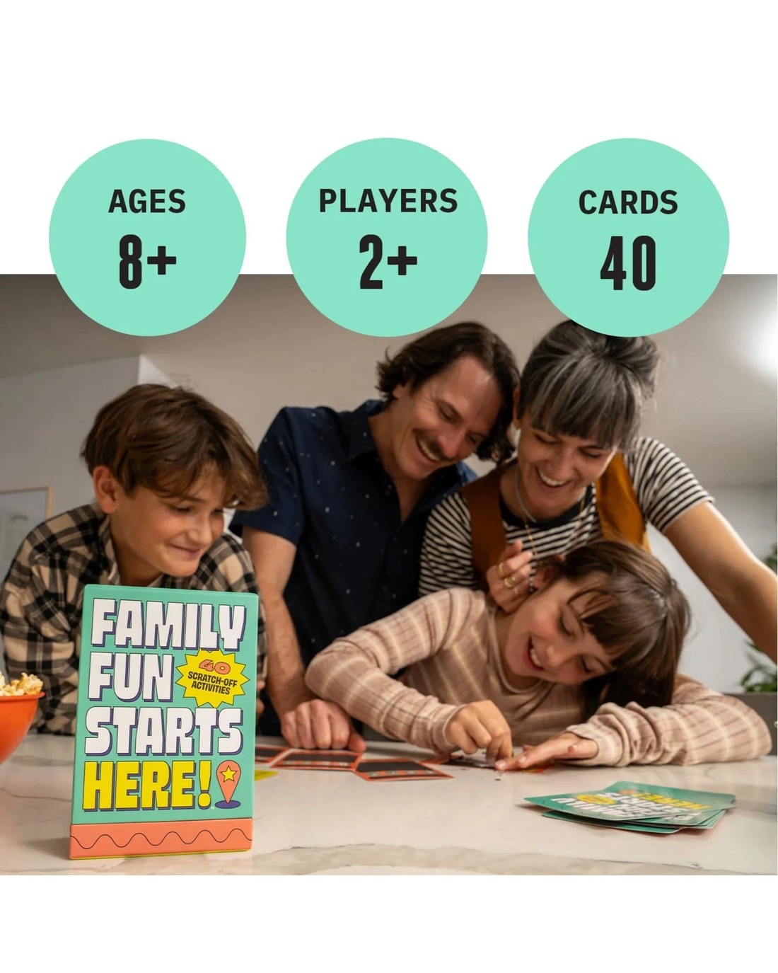 - Family Fun Starts Here: Finally an answer to the age-old question “What are we doing today?” These 40 surprise scratch off family activity ideas are perfect for families with kids, teens, family friends, and grandparents. Spend quality time and build core memories together with this new, exciting entertainment game for the whole family. How to play: Pick a scratch off card, reveal the activity, and go all in! Icons on the card give clues to cost, length of activity, and time of day that's best so you can pick the activity right for you!Play anywhere: Play during family game night, weekends at home, family vacation, holidays, sleepovers, play dates, Summer, birthdays, and more. There are options for day, night, anytime, out of the house, at home, and more so you have a choice for any occasion! These fun family activities are perfect for kids, teens, parents, and grandparents. This makes a great experience gift, birthday present and easter basket stuffer.Why trust us? From the creators of You Laugh You're Out (500k+ sold) and Who's Most Likely To (2M+ sold)! We partnered with Meredith Sinclair M.Ed, who is a Today Show contributor, former elementary school teacher, mom of two, and author, to create this family activity game for kids.Includes 40 mystery scratch off family activity ideas for kids and adults including “Do You Believe in Magic?” and “Table Runner Tale”. For 2+ players ages 8+