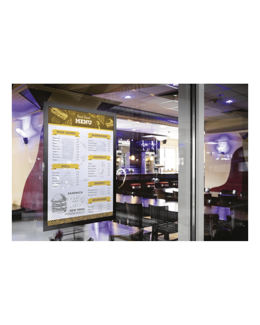The Duraframe Sun Infoframe is designed to display information, like signs and advertising in full sun positions. It has a fold-back magnetic frame that's self-adhesive, so it's easy to attach to surfaces without using nails or tools.