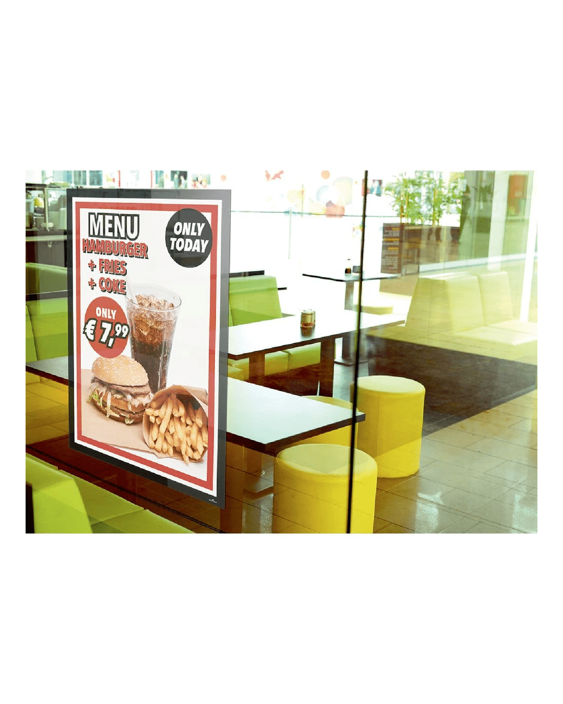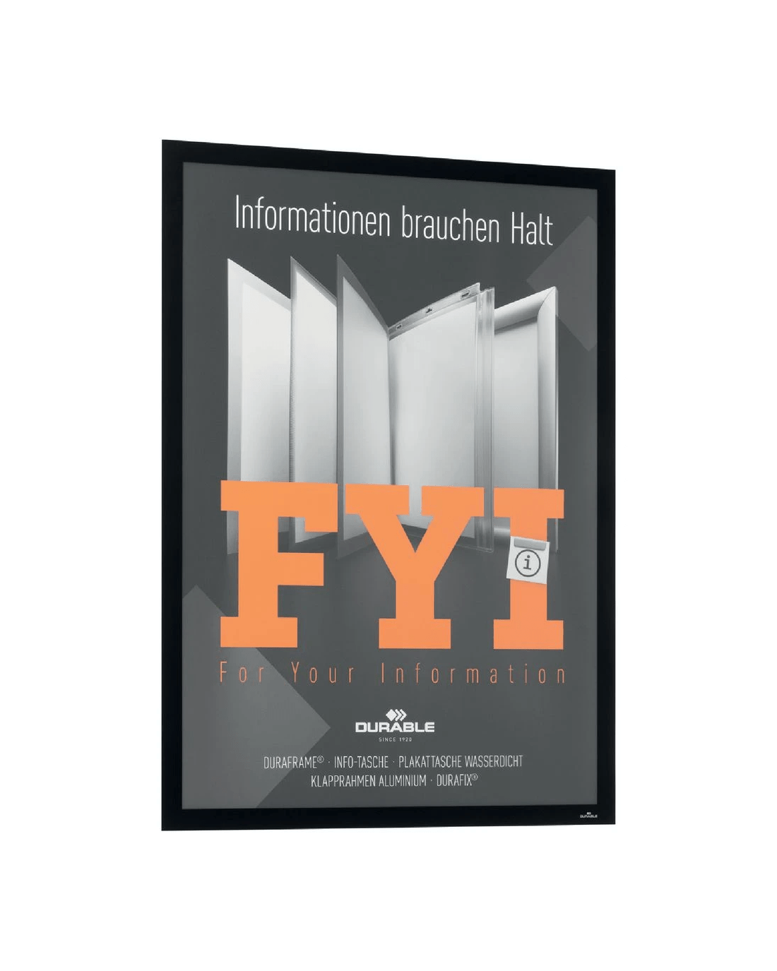 This Duraframe Poster info-frame is suitable for displaying information on walls, glass surfaces and in windows. It features easy replacement of posters via a hinged magnetic frame and is UV-stabilised for up to 2 years, as well as heat-stable. Plus, it's even readable on both sides of the glass.