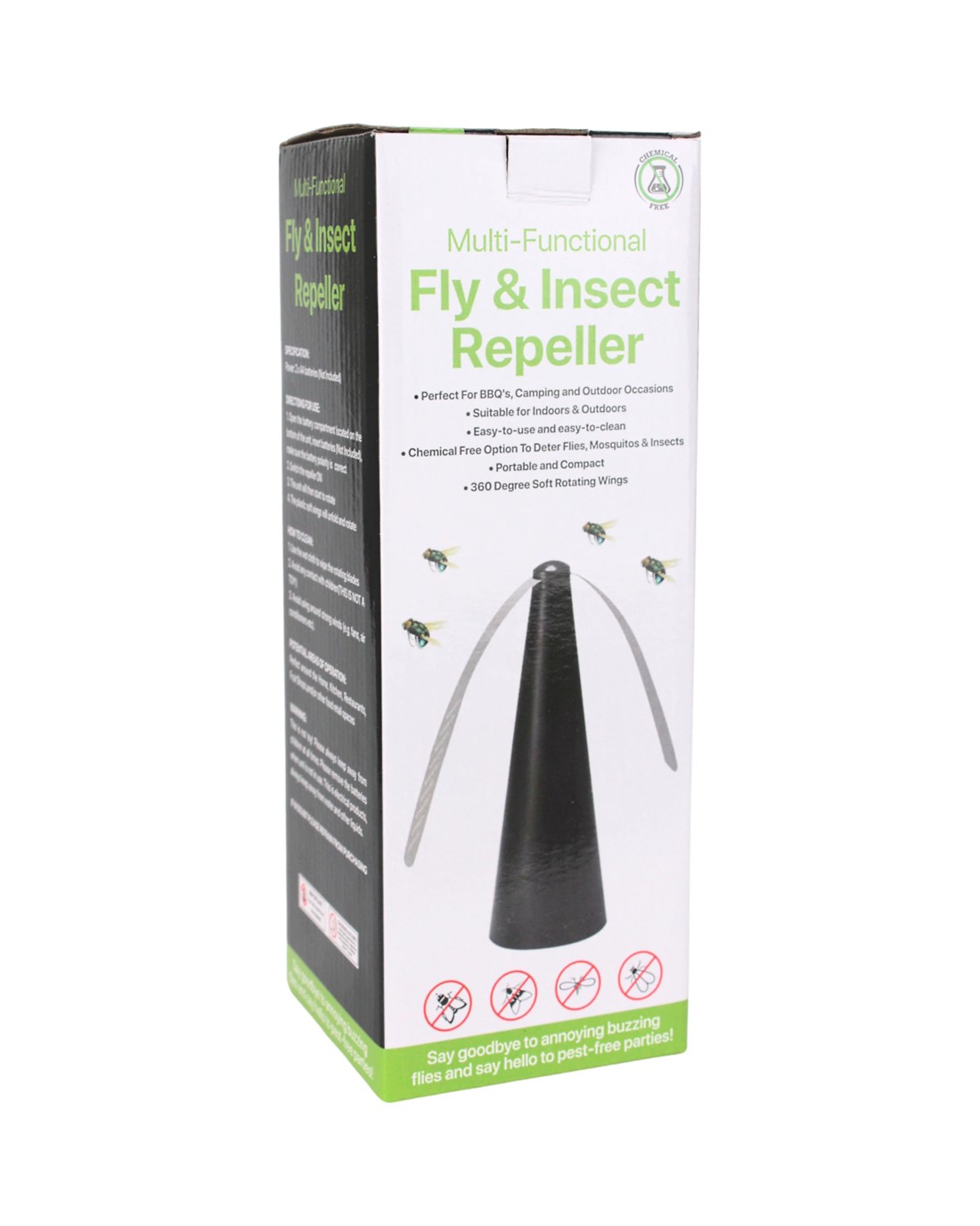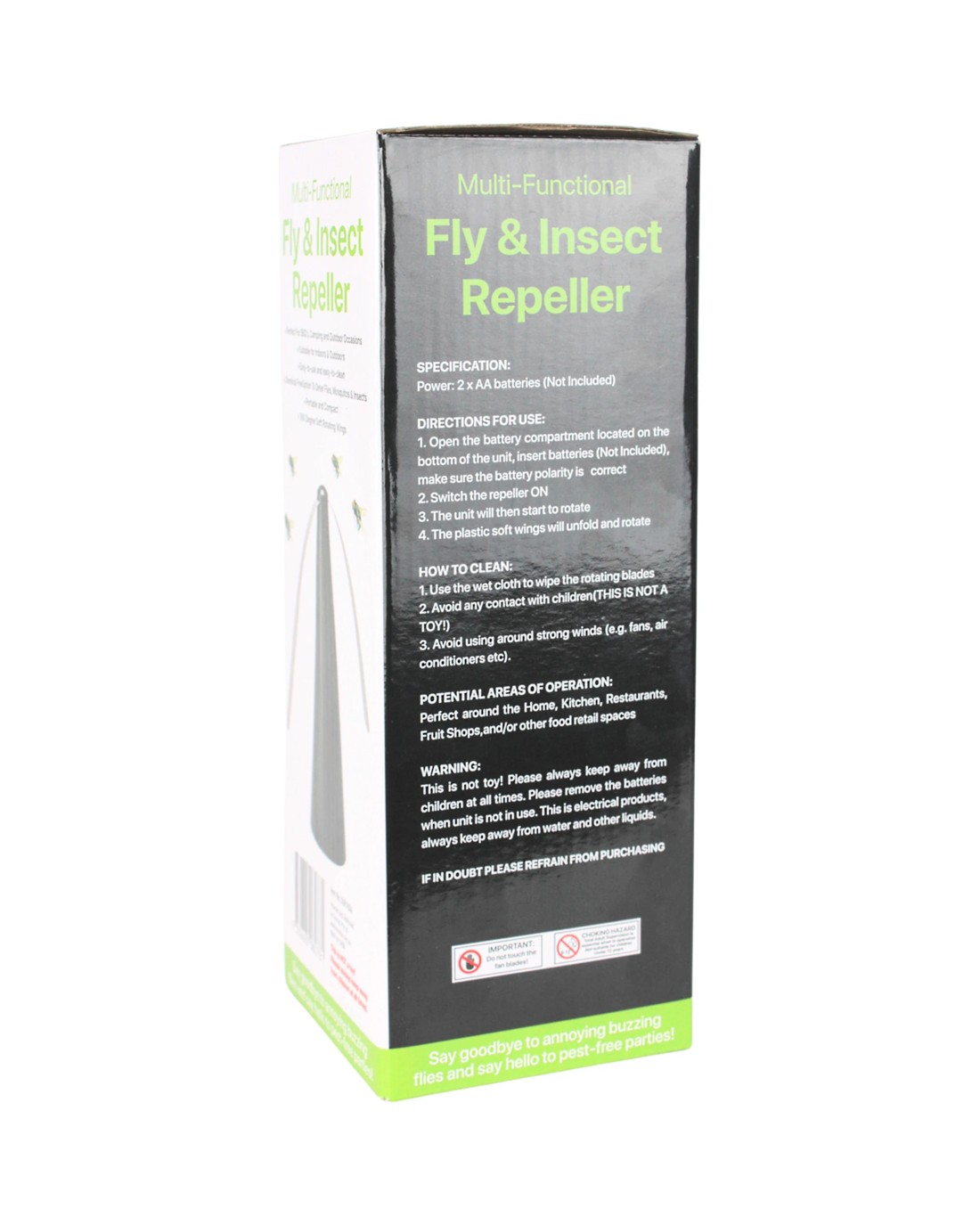 Keep flies, mozzies, and other pesky insects at bay with this black battery-operated fly and insect repeller. Designed as a portable, chemical-free solution, this innovative device effectively deters insects using gentle spinning blades that create a harmless yet effective barrier. Ideal for indoor and outdoor use, it's perfect for picnics, barbecues, camping trips, or simply keeping your kitchen and dining area bug-free. Lightweight and easy to carry, it provides a convenient and safe way to enjoy your time without the nuisance of insects.