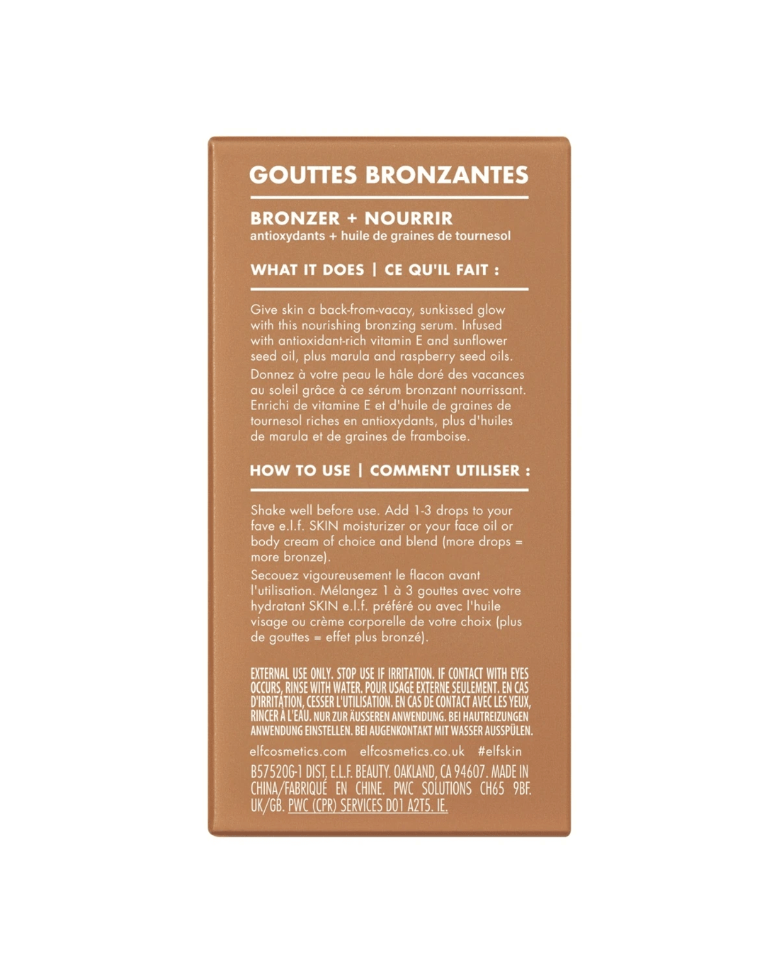 e.l.f. SKIN Bronzing Drops - Copper Gold, Vitamin E and Sunflower Seed Oil