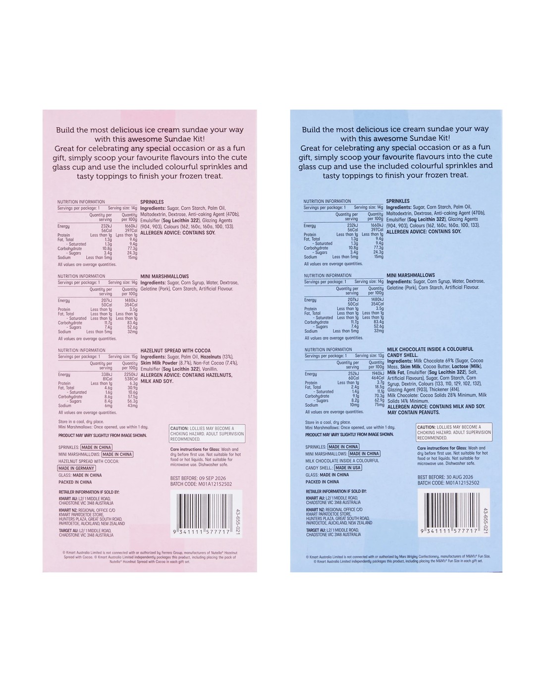 - Sprinkles: Sugar, Corn Starch, Palm Oil, Maltodextrin, Dextrose, Anti-Caking Agent (470b), Emulsifier (Soy Lecithin 322), Glazing Agents (904, 903), Colours (162, 160c, 160a, 100, 133).