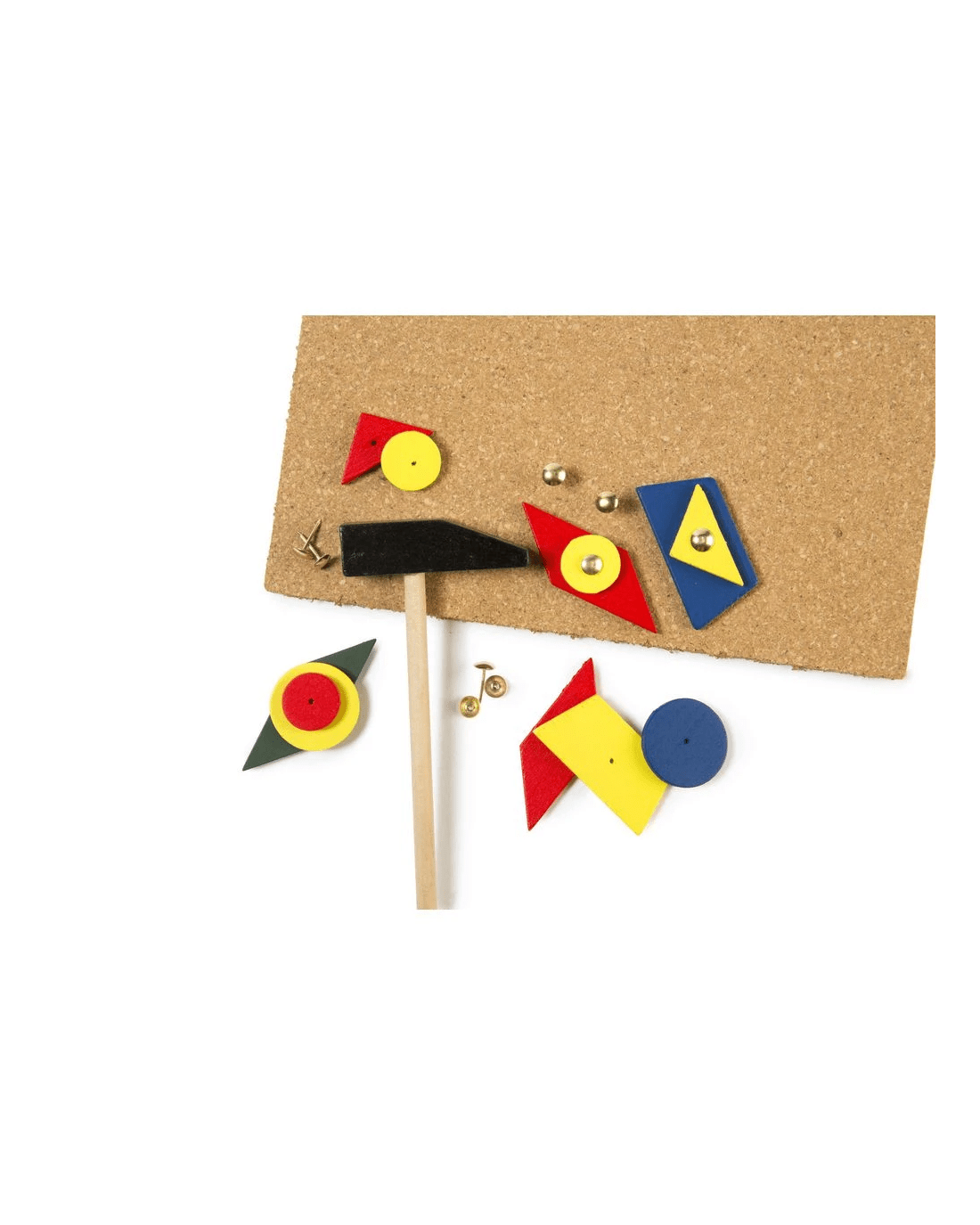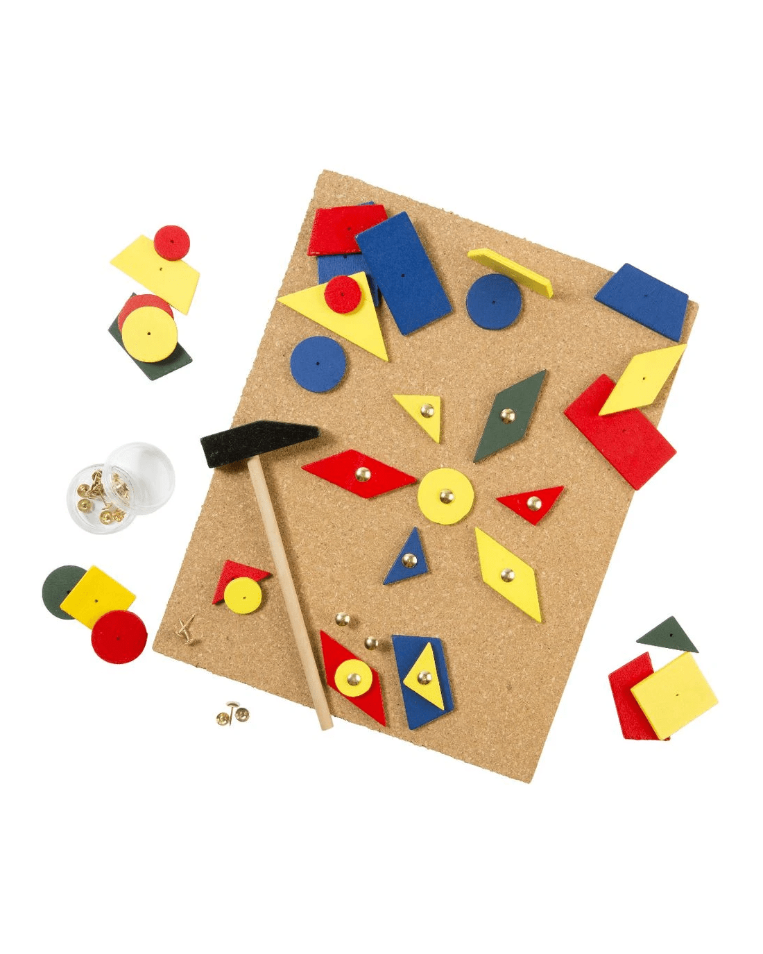 - This pack includes 1 board, a variety of geometric shapes, tacks and a wooden hammer.