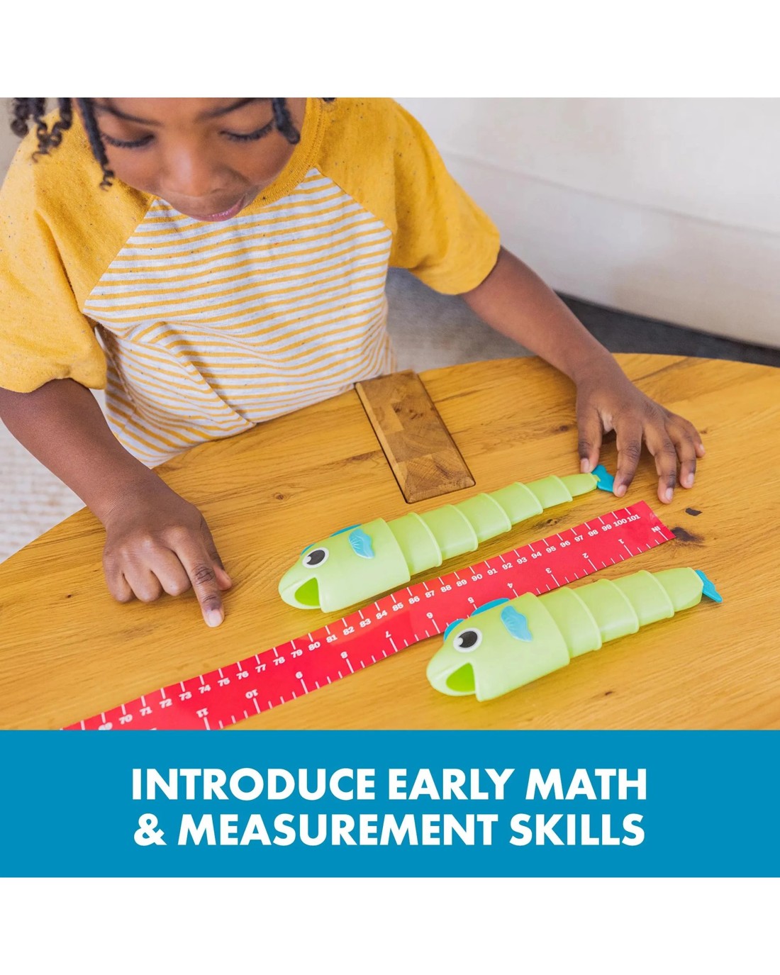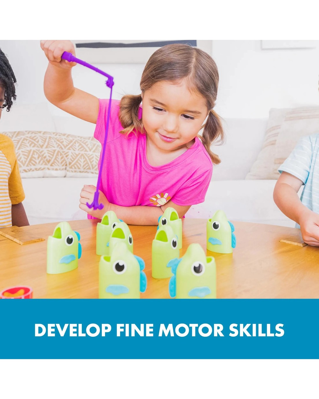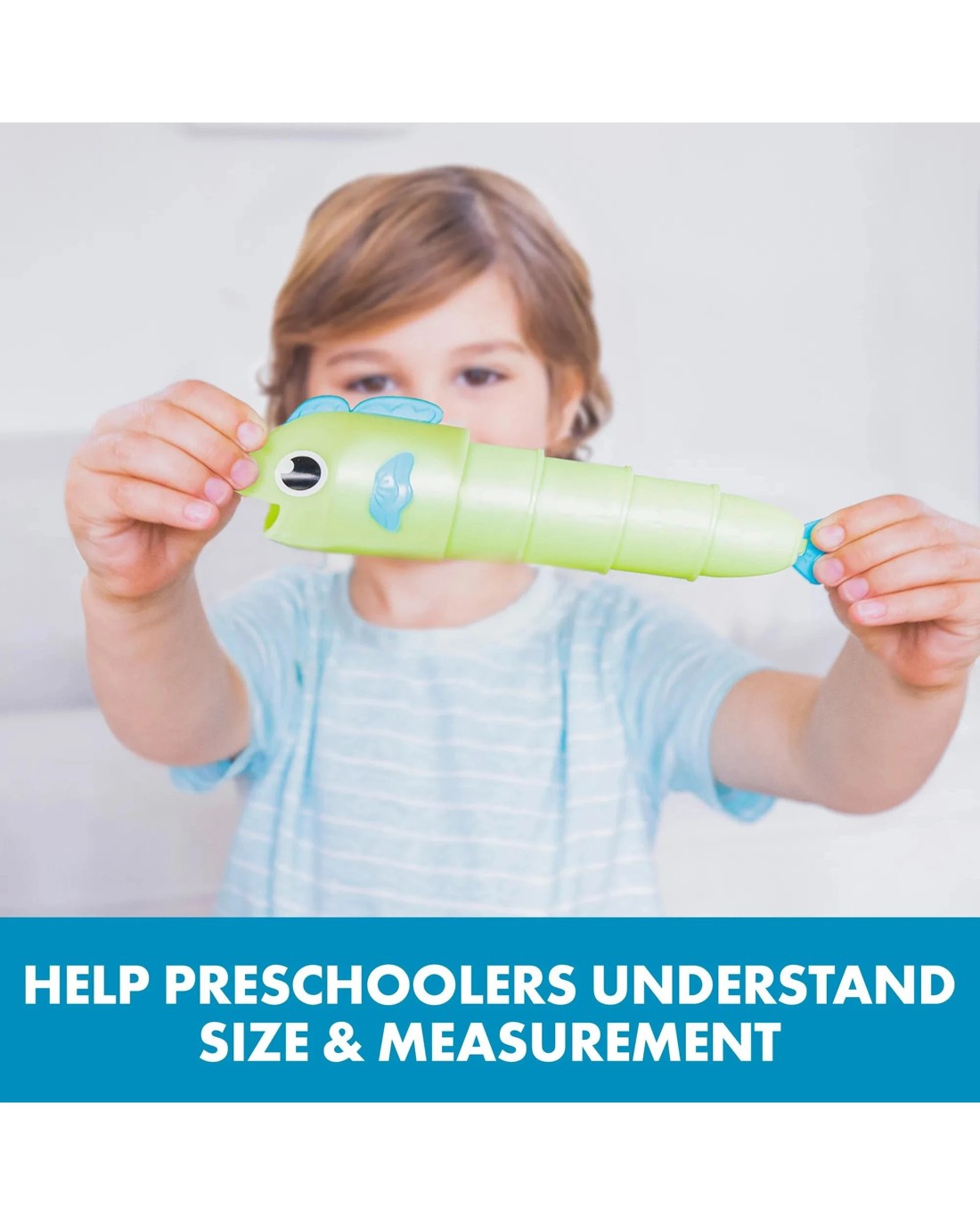 “School” your kids with this whopper of a game that's fun for the whole family! Players use a fishing pole to “catch” telescoping fish and measure them with the measuring tape. How to play - Players take turns using the rod until all fish have been caught, then measure their fish against the included measuring cards to see who caught the biggest fish. Includes Fishing pole, 9 expanding fish, four measuring cards, and game guide Surprise telescoping fish! Fish are flat during game play, but extend to various lengths once caught Introduce the concept of measurement - Introduce the idea of small, medium, and large, and help kids understand the correlation between size and measurement