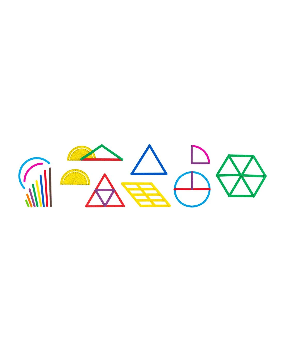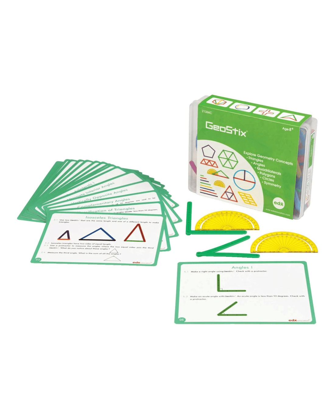 - The set includes 100 sticks, 2 10mm protractors and 16 activity cards.
