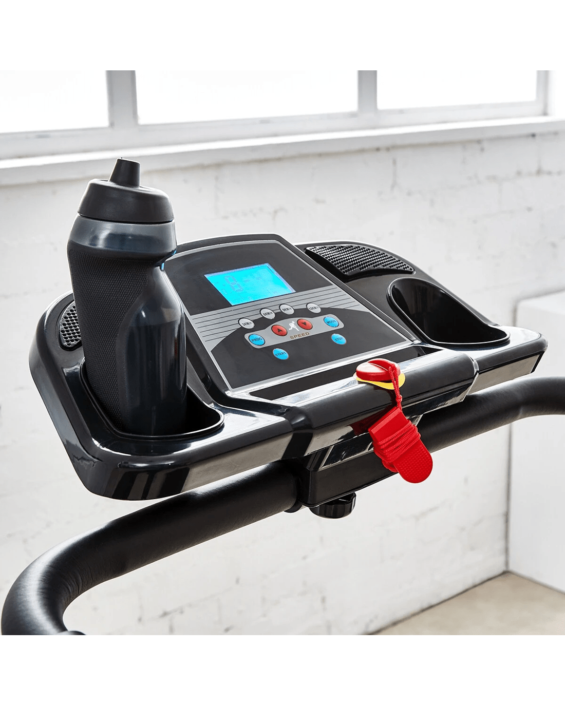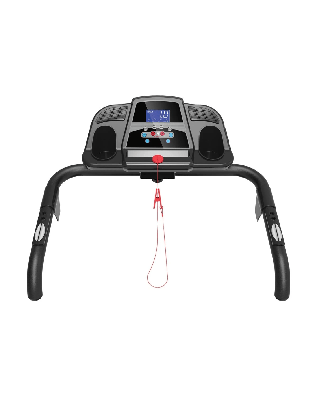 LCD Display Screen with Emergency Stop Function: The LCD display tracks speed, distance, and calories burned, while the emergency stop function ensures added safety.