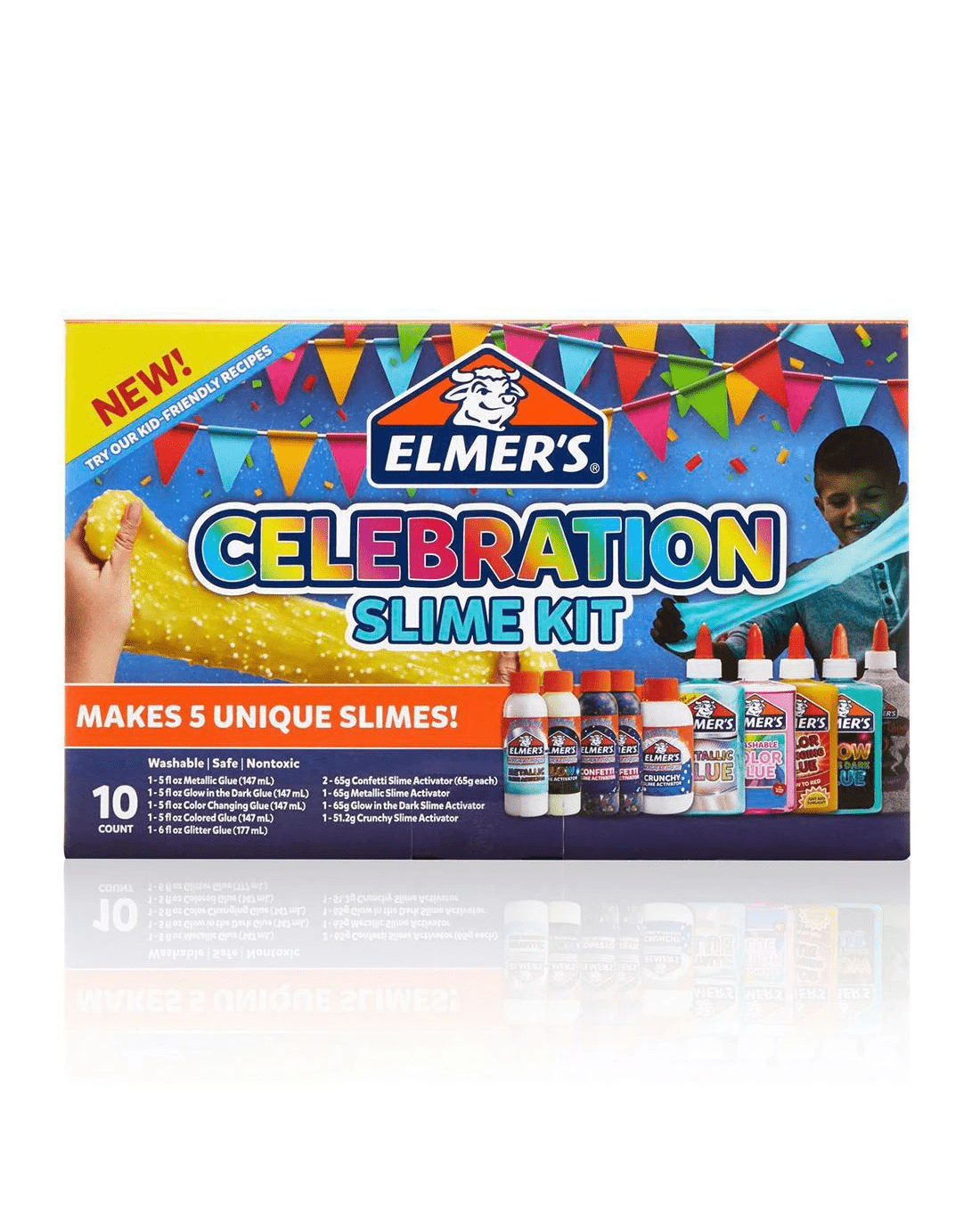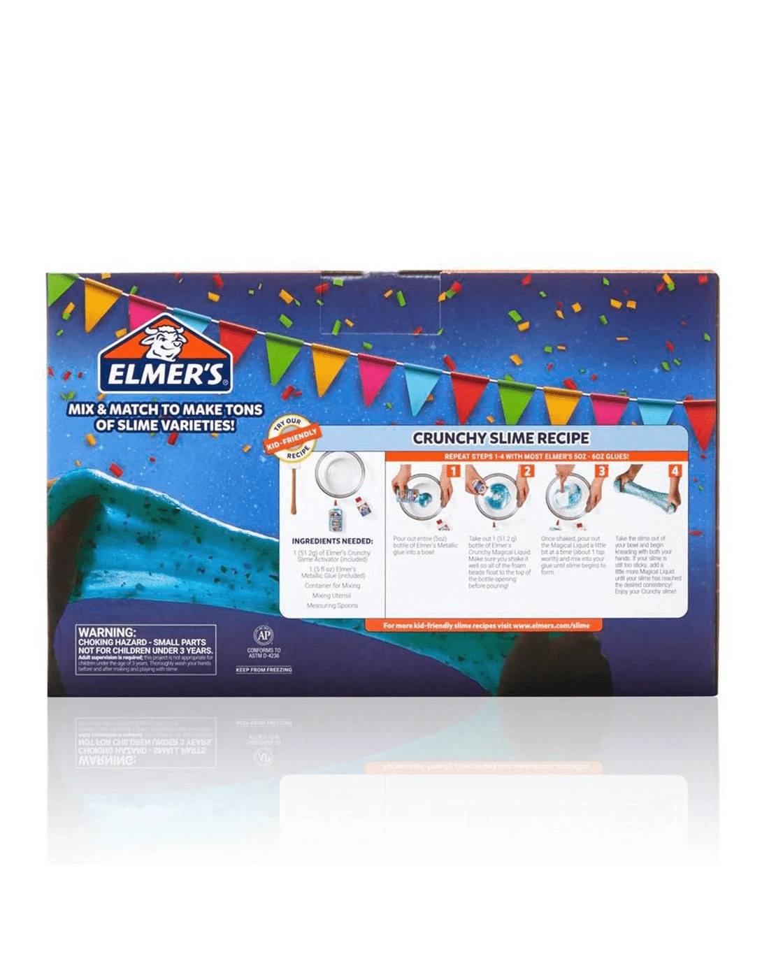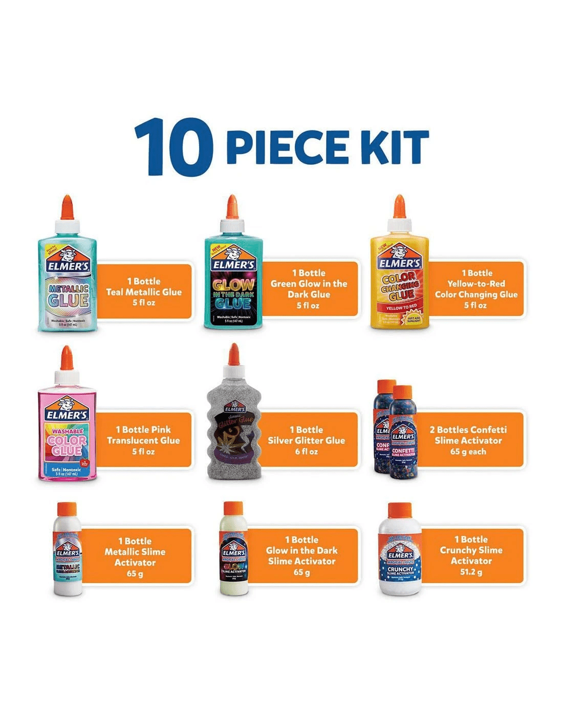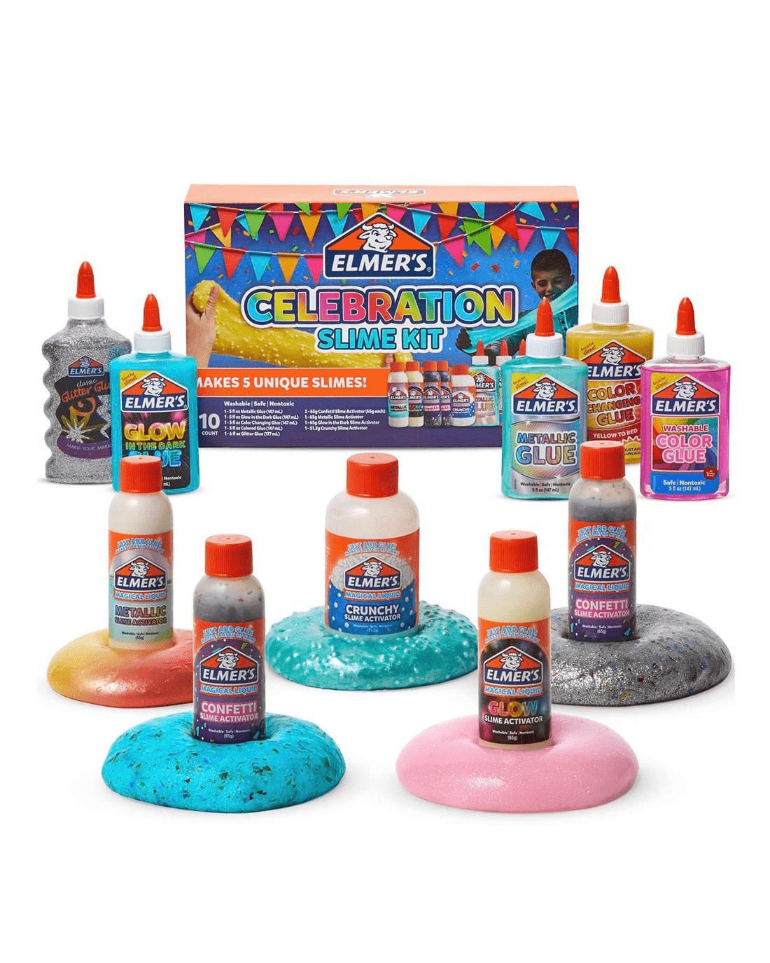 Created with parents and teachers in mind, Elmer's Glue is nontoxic and washable for easy cleanup and safe, fun gluing. Designed with a non-runny formula, this glue is a stress-free way to create exciting slime and art projects. Washable, Safe, and Nontoxic Formula. One bottle each of Metallic Slime Activator (65 g), Glow in the Dark Slime Activator (65 g), Crunchy Slime Activator (51.2 g), and two bottles of Confetti Slime Activator (65 g) - Easy Slime Activation