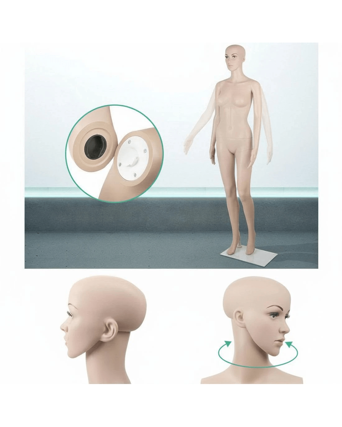 Featuring a durable full body realistic mannequin that is perfect for retail shop or stall to display fashion clothing and accessories. Both the arms and head of the mannequin are adjustable to different angles to create different looks and poses. The full body mannequin comes on a glass base with a sturdy aluminium calf spigot. This mannequin is perfect for retailers on budget or who are seeking for durable mannequins with fine finishing.