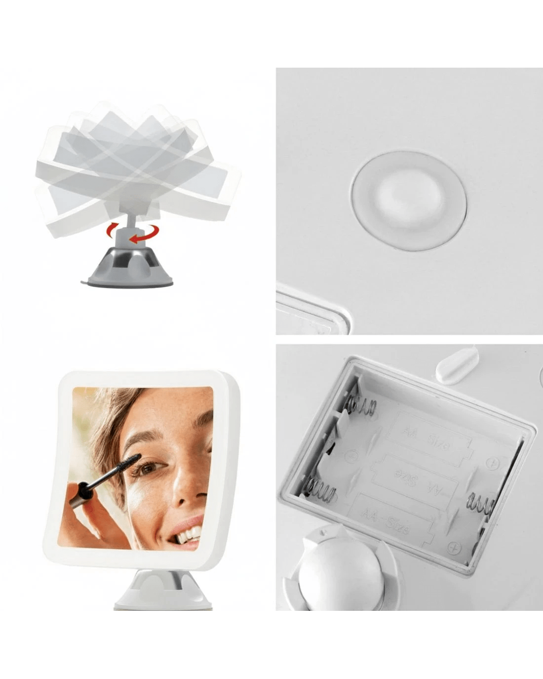 Designed for flexibility, the mirror rotates 360° to your preferred angle and is powered by rechargeable AAA batteries (batteries not included), making it ideal for travel or bathroom use. Crafted from glass and lightweight PP plastic, its compact frame and 0.3kg weight ensure effortless portability. No assembly required—attach and go!