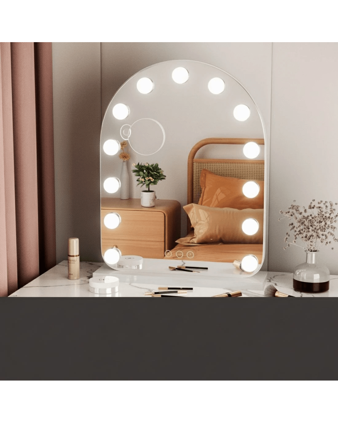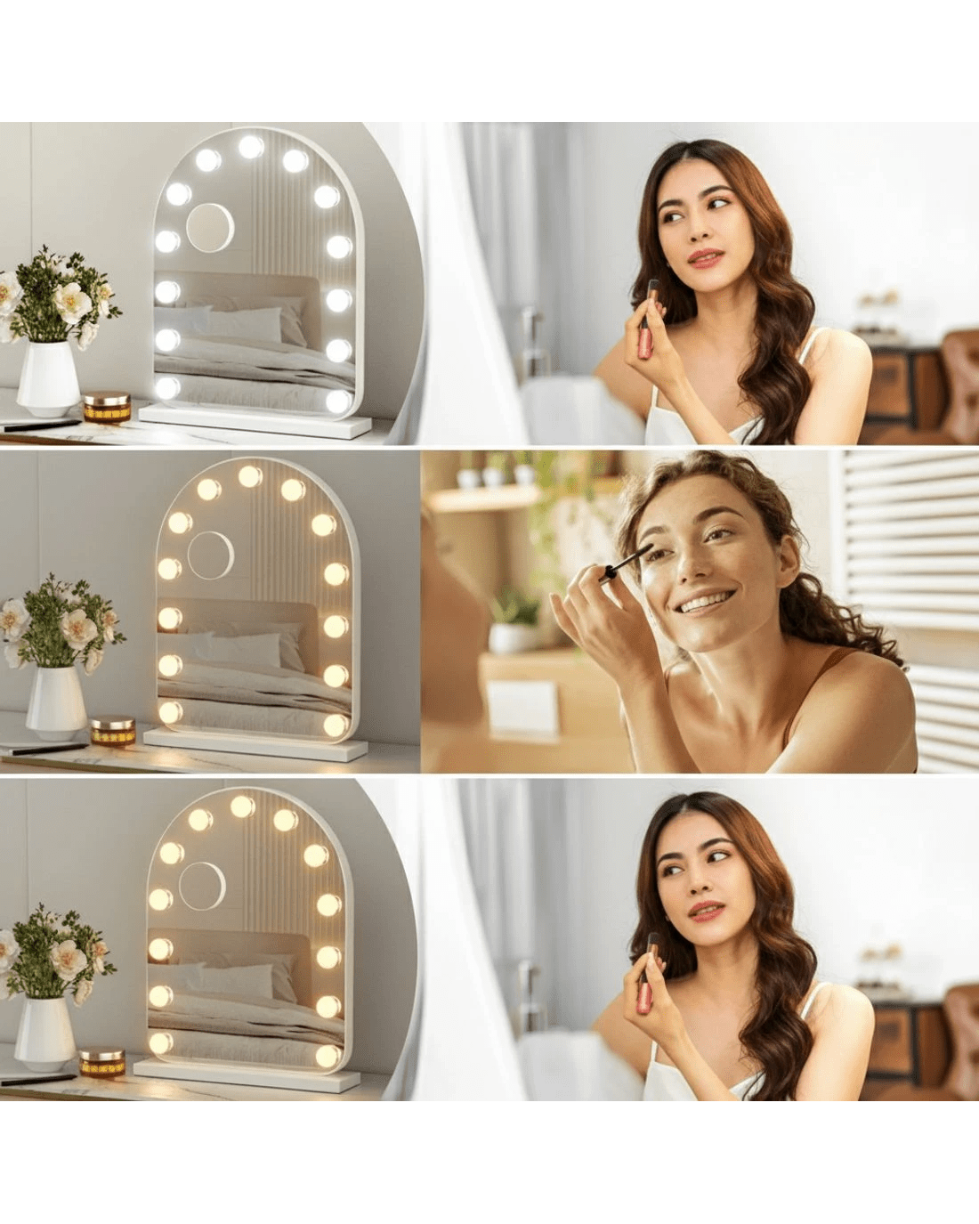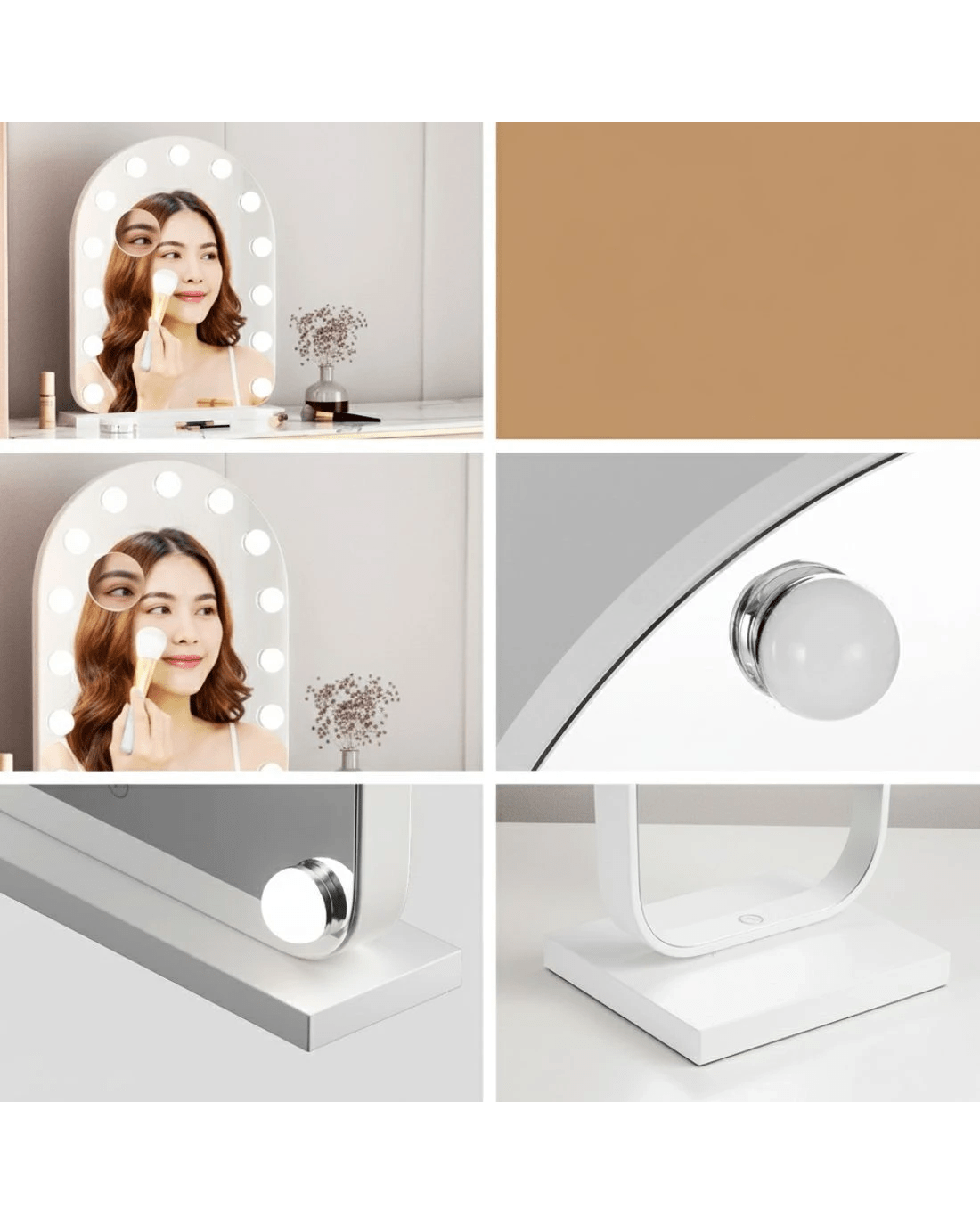 Upgrade your beauty routine with this classic illuminated makeup mirror, featuring a spacious 40cm x 50cm main mirror and a detachable 9cm 5x magnifier for precision detail work. The touch-sensitive bulb lighting offers three adjustable colour temperatures (6000K cool white, 4000K daylight, 3000K warm light) to suit any environment, ensuring flawless makeup in any lighting condition.