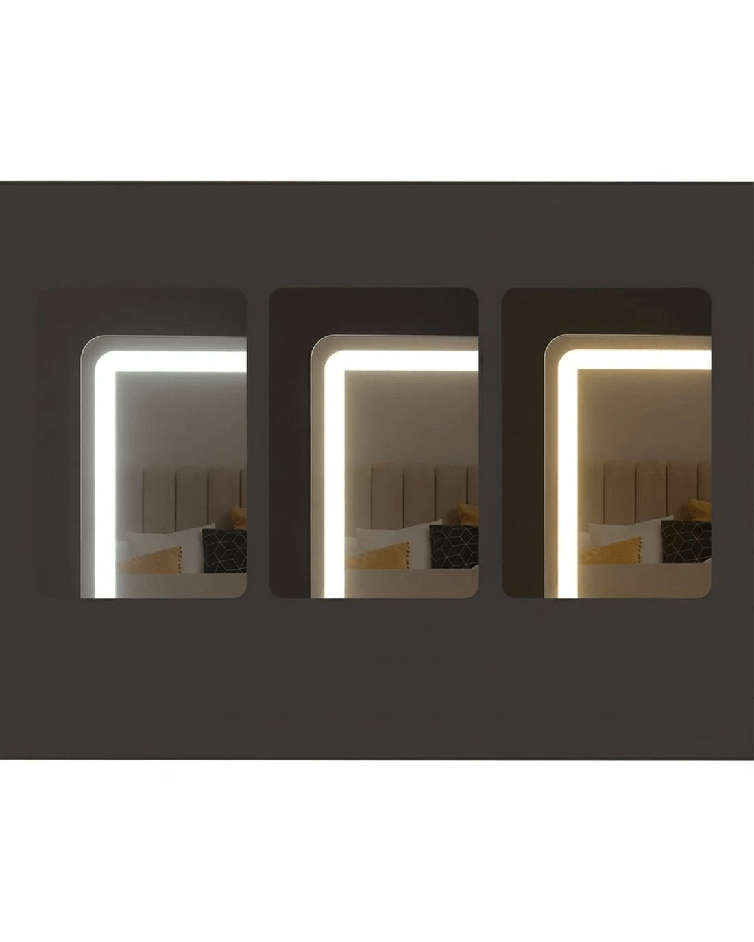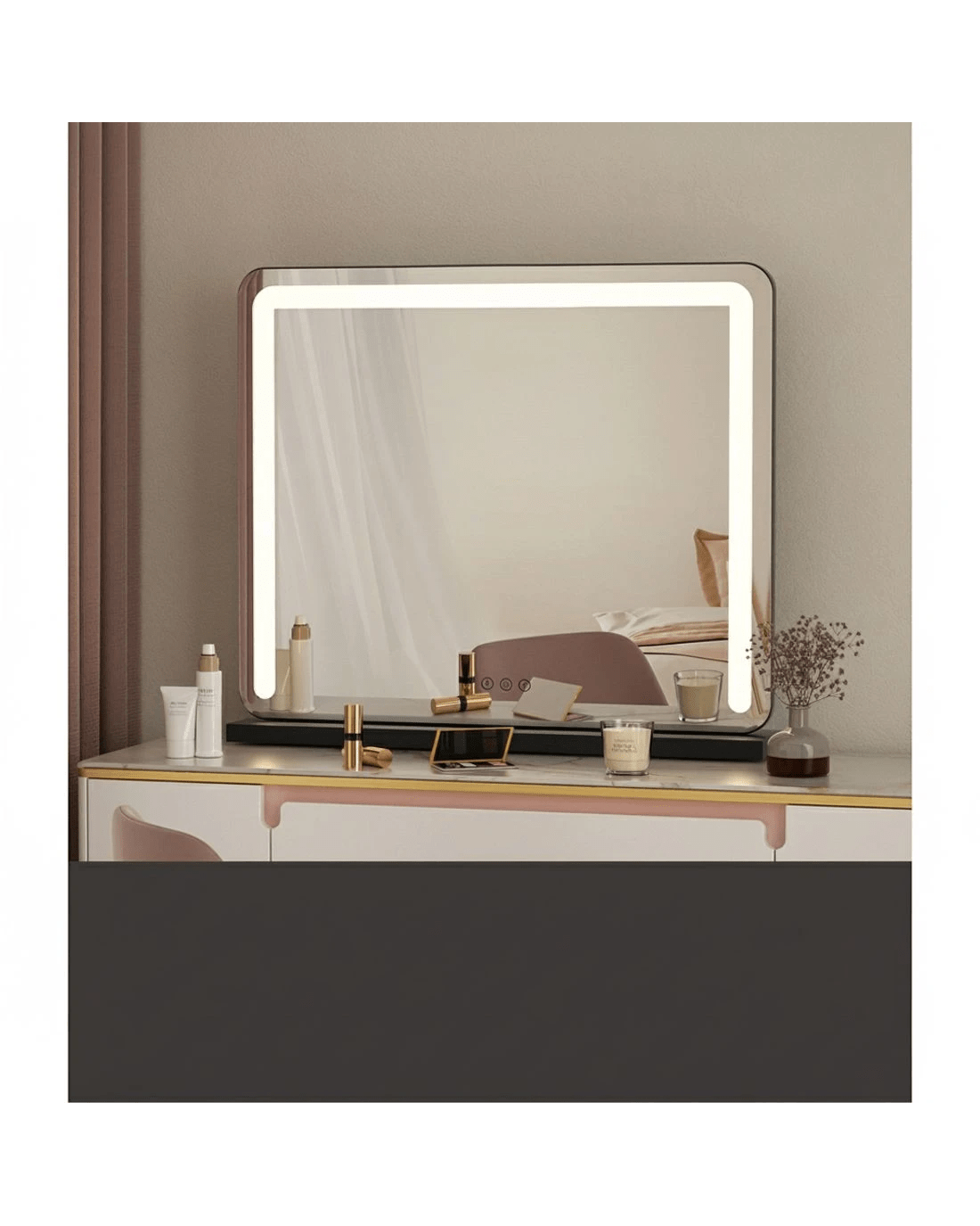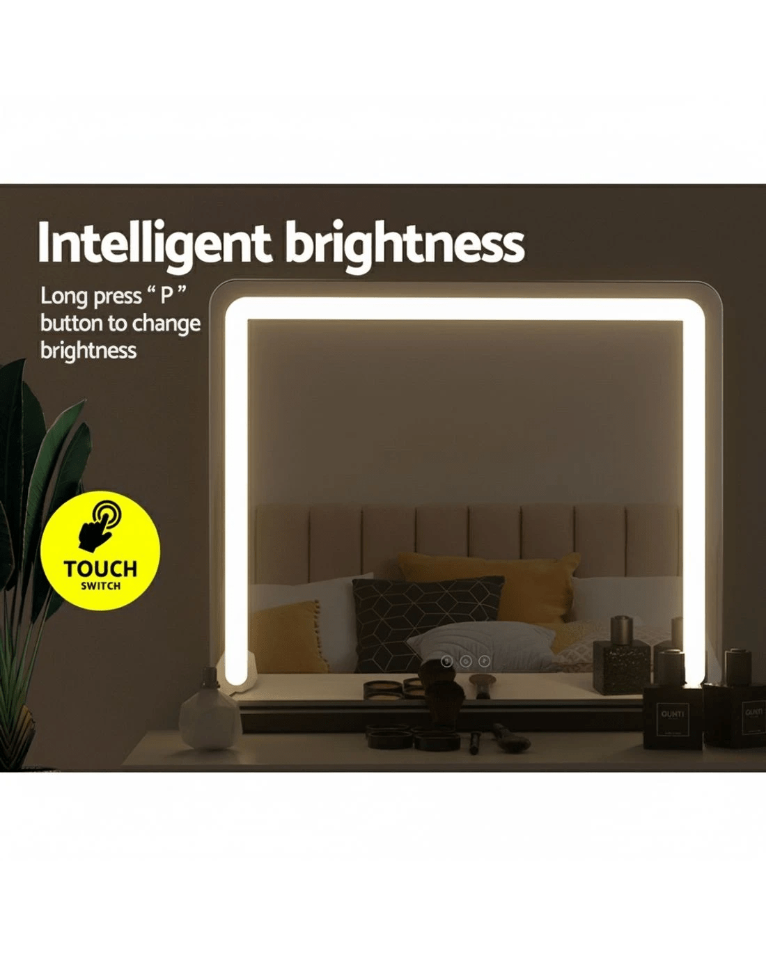 Get the star treatment with our gorgeous Embellir Make-up Mirror. Framed with bright LED stripe lights, this mirror really lights up your visage through your daily makeup regimen. The aluminium frame is sturdy, lightweight, and adds a touch of glamour to the entire mirror. The frame sits on an equally smooth powder coated MDF base for stability and durability. Put it straight on your existing vanity or mount to the wall for additional space. Even more wonderful is that the LED light can be easily adjusted for brightness and colour temperature using our intelligent touch controls. Turn your bedroom or bathroom into a celebrity set overnight with our Embiller Make-up Mirror, and enjoy beauty in all its illuminated brilliance.